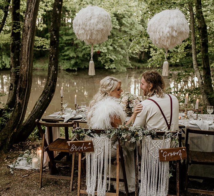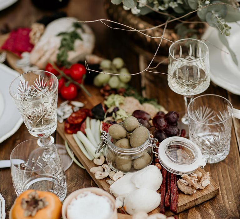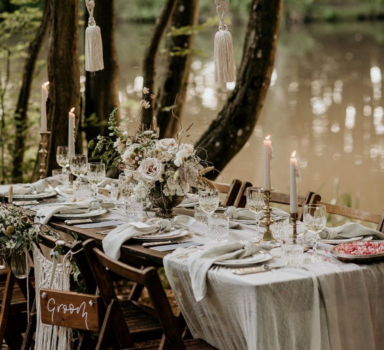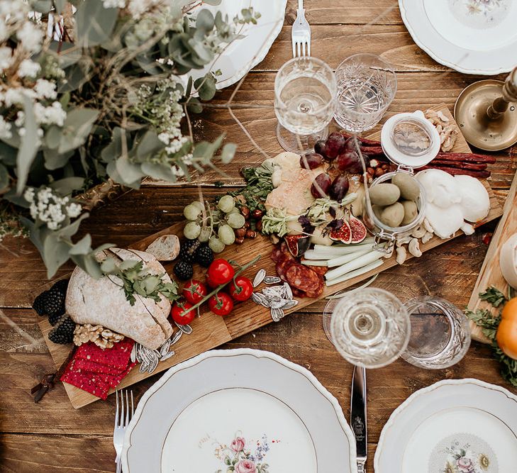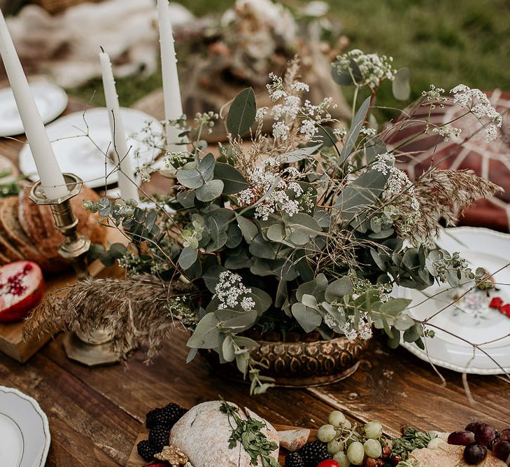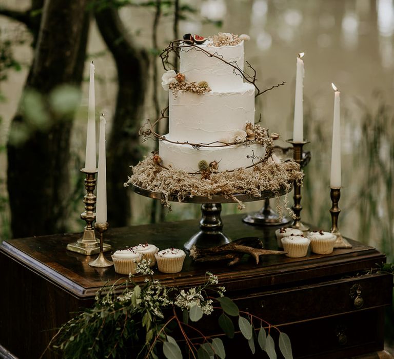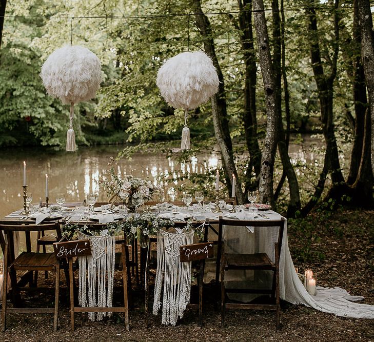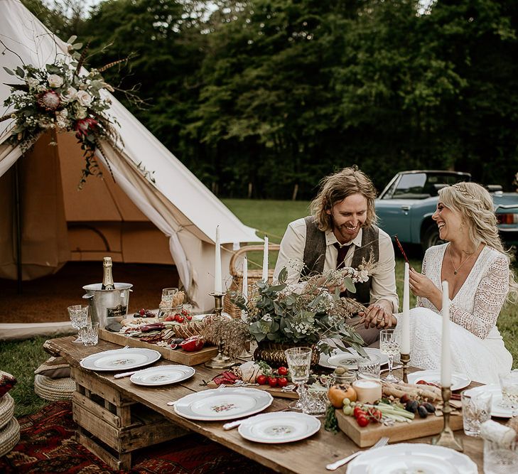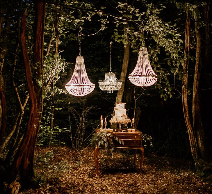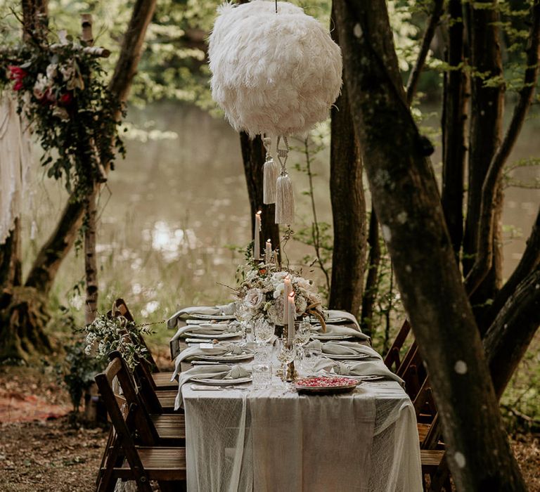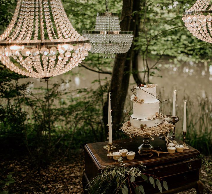 VISION Eco friendly Woodland boho luxe inspiration at Wickerwood Farm with mouthwatering low- and high-dining table set ups a vintage car and chandeliers surrounding a delicious cake!