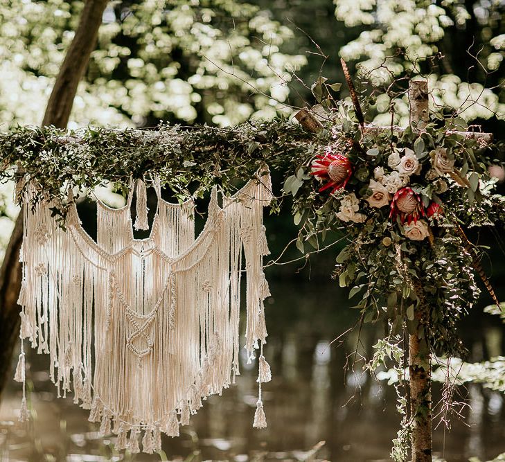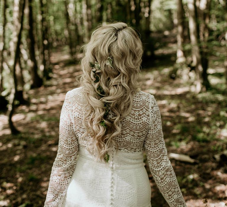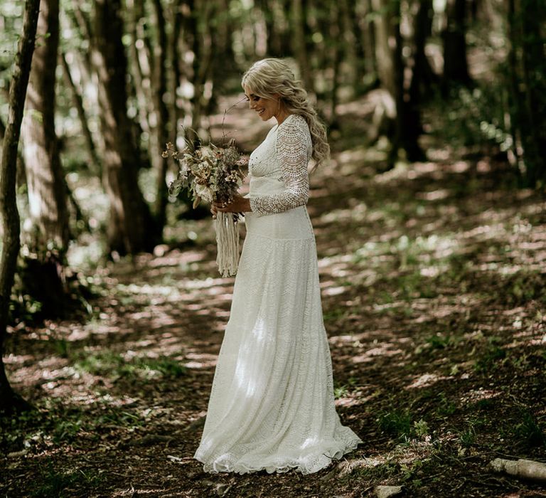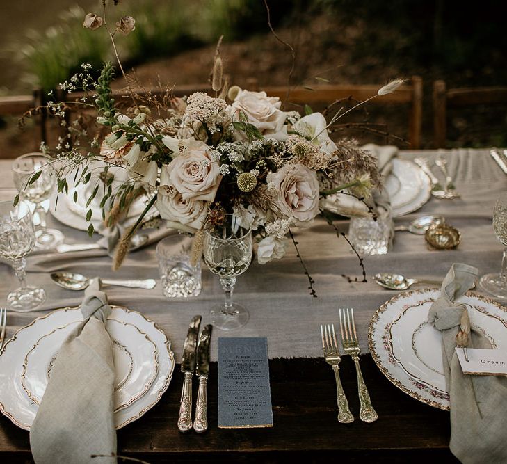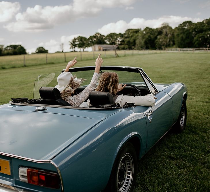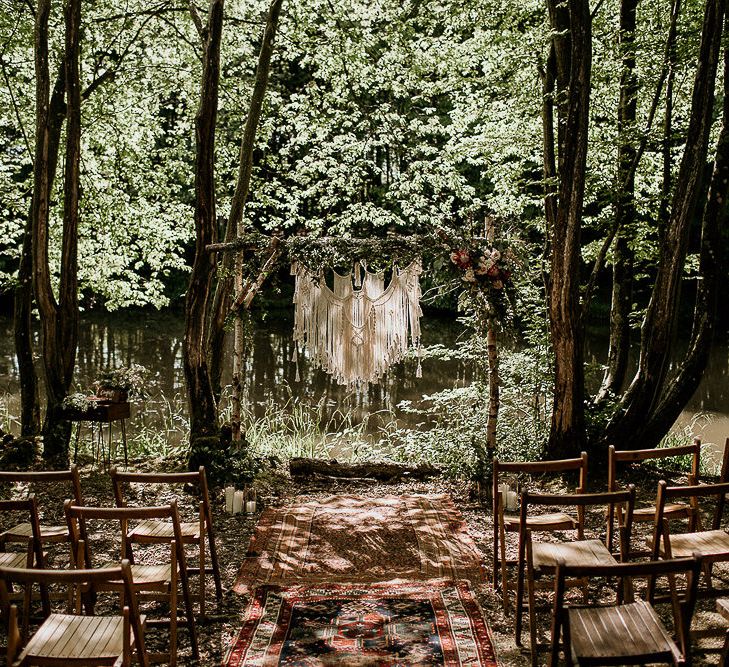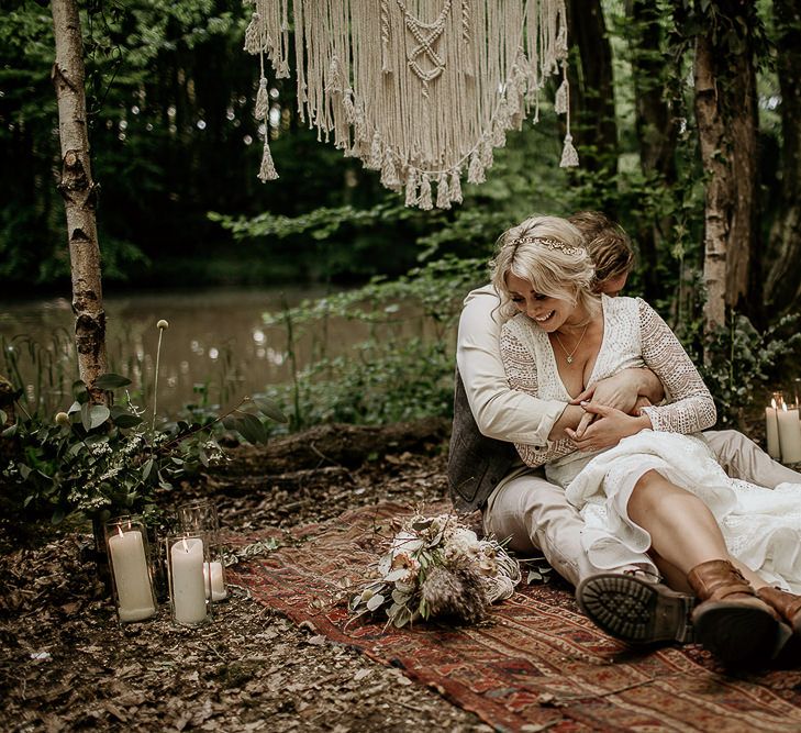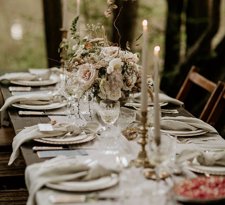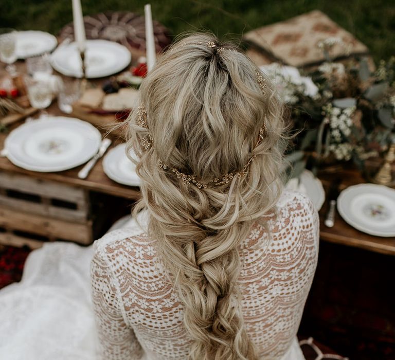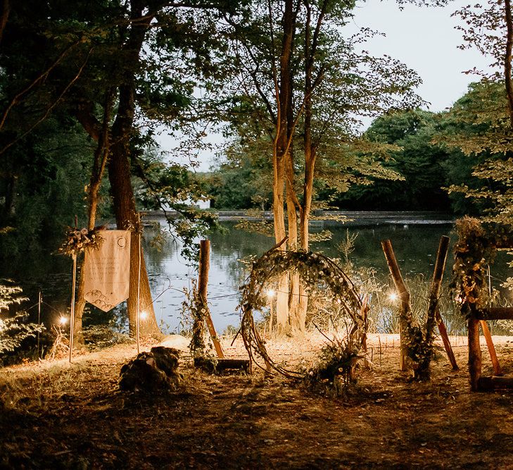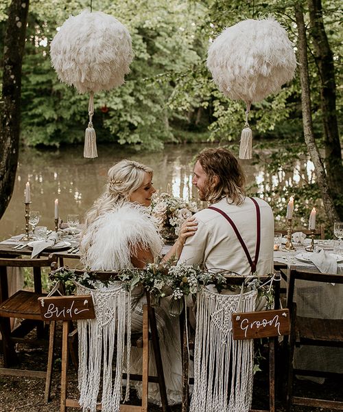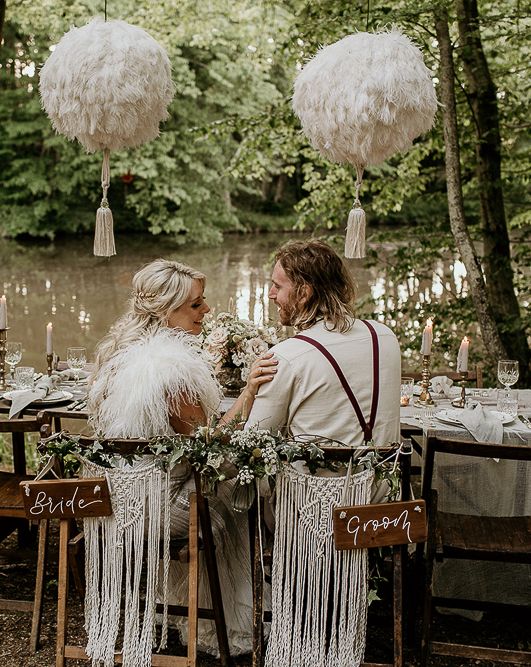 VISION Eco friendly Woodland boho luxe inspiration at Wickerwood Farm with mouthwatering low- and high-dining table set ups a vintage car and chandeliers surrounding a delicious cake!