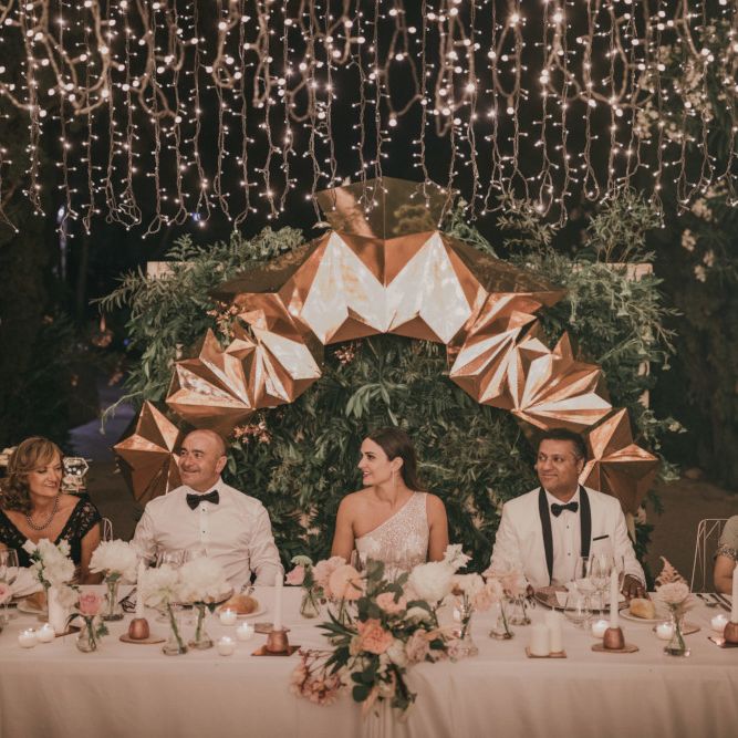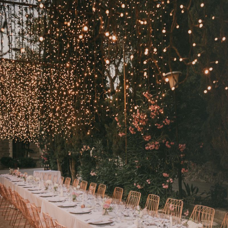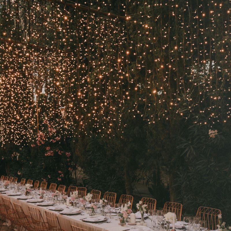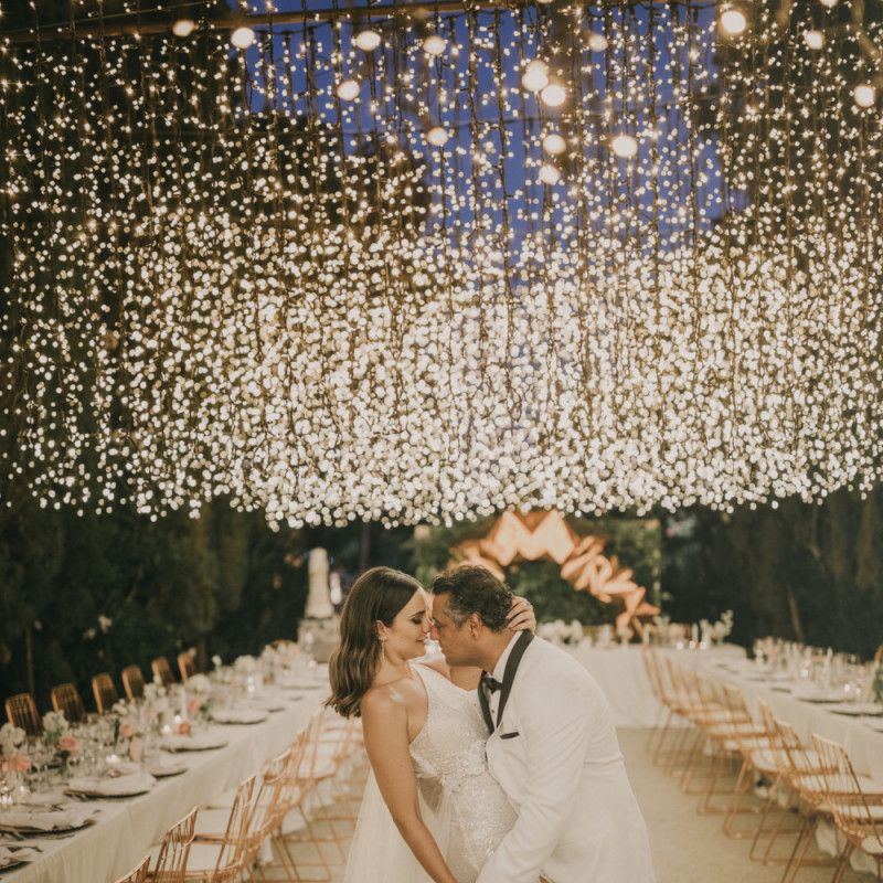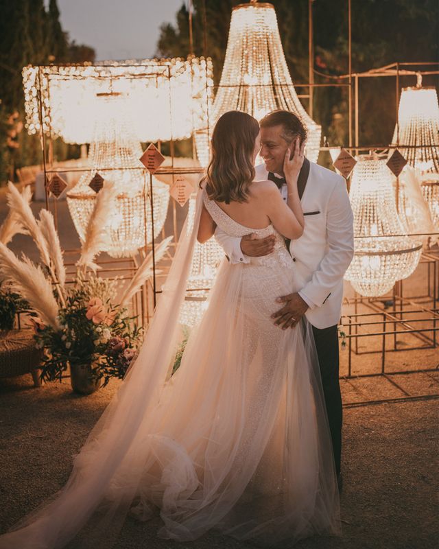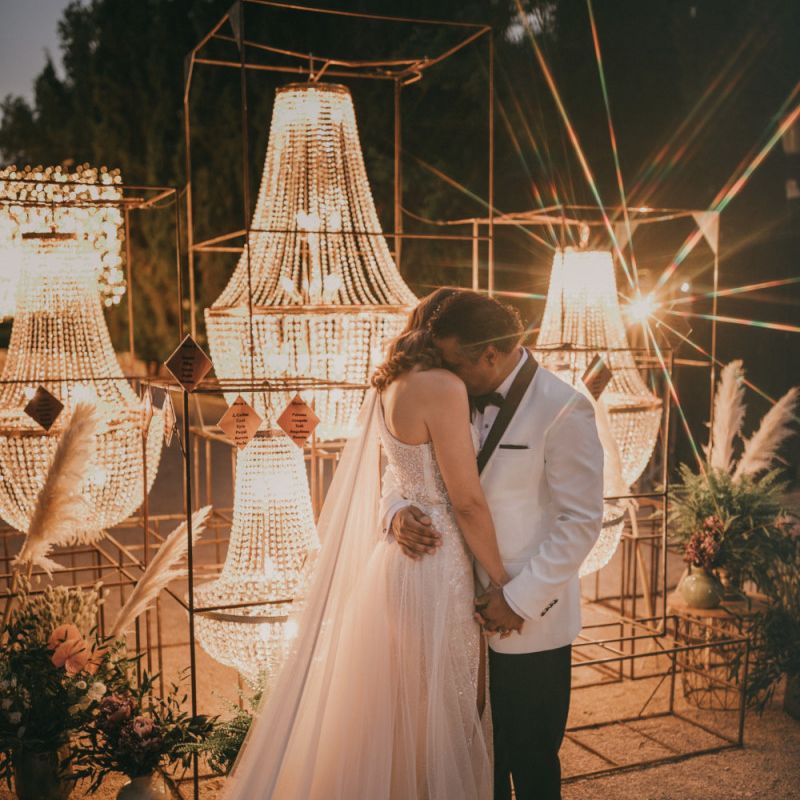 It was unique as it all came out as we had planned in our minds, what we had dreamt, a warm summer night, with the sea breeze, full of light, friends, family and music. Fun filled ,magical, complete with our personal things. An open air wedding hall, surrounded by trees, a ceiling full of lights, and dining tables filled with candles, and in the background the town of Altea.