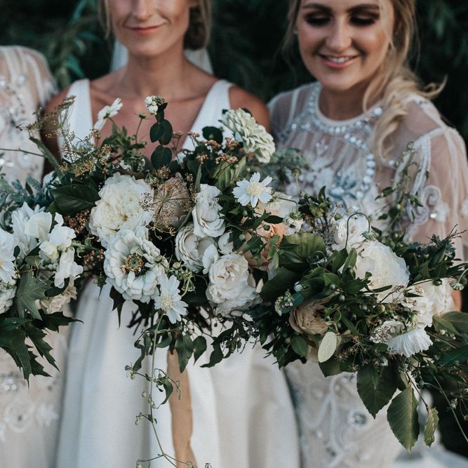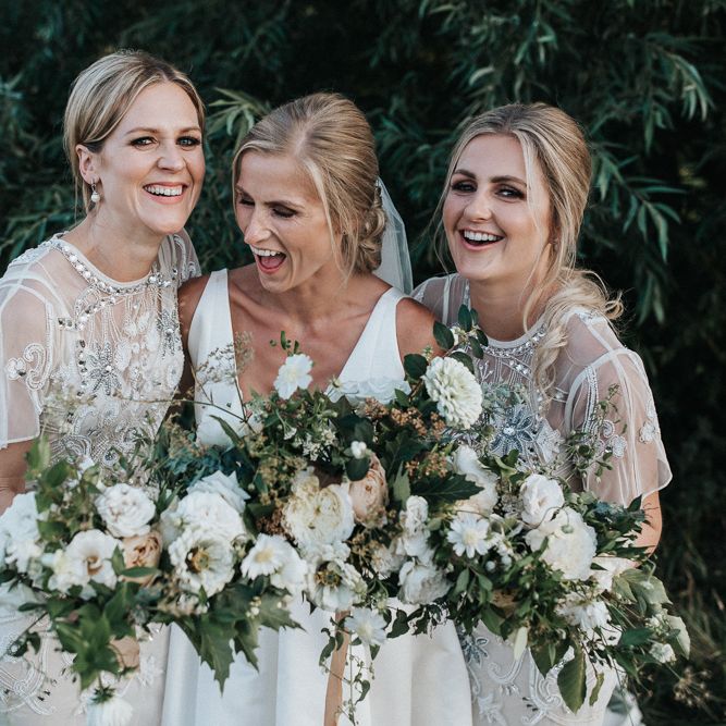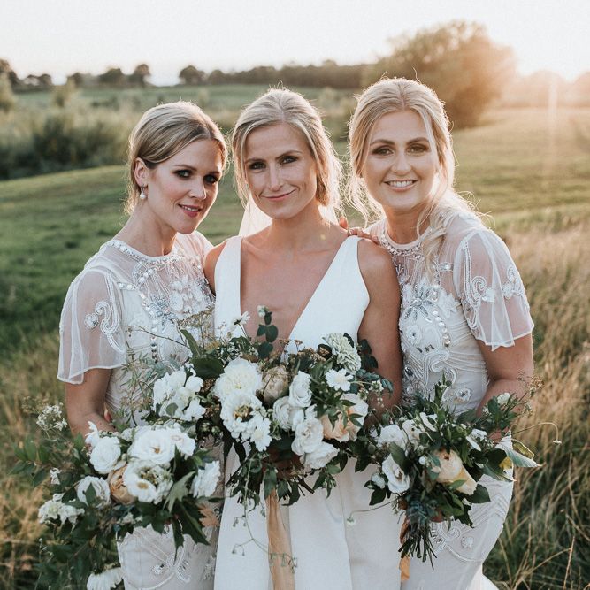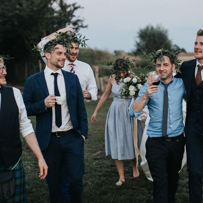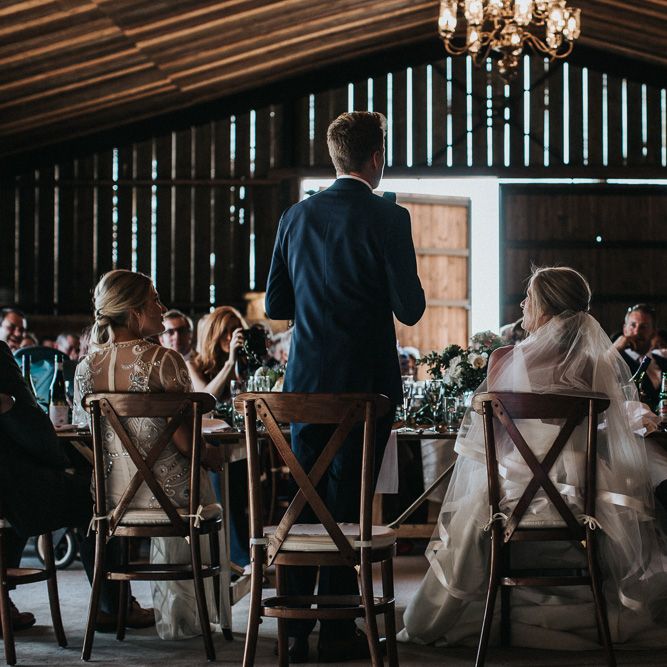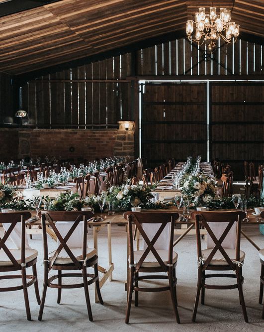 The sun shone all day allowing us to marry outdoors in front of the farm's marshlands and lakes. We wanted it to be relaxed and informal. We personally styled the venues (until 2 am the night before) with a little help from our friends. I would describe our style as rustic elegance, we love timeless and classics and work on the idea that less is more. We sourced antique furniture throughout the year from the local auction house which we visited every Saturday morning. Simon saved the reclaimed glass chandeliers from a ballroom that was being redeveloped locally.