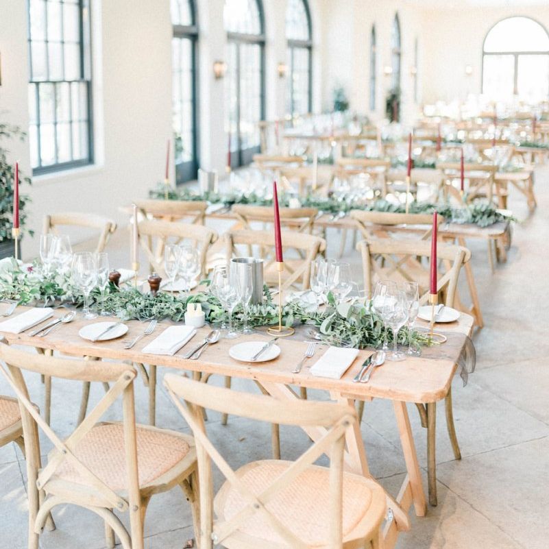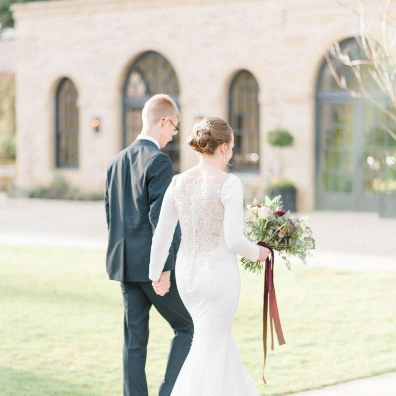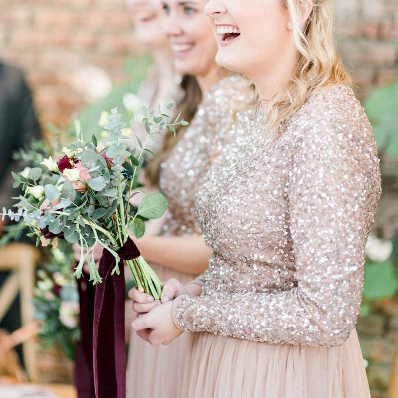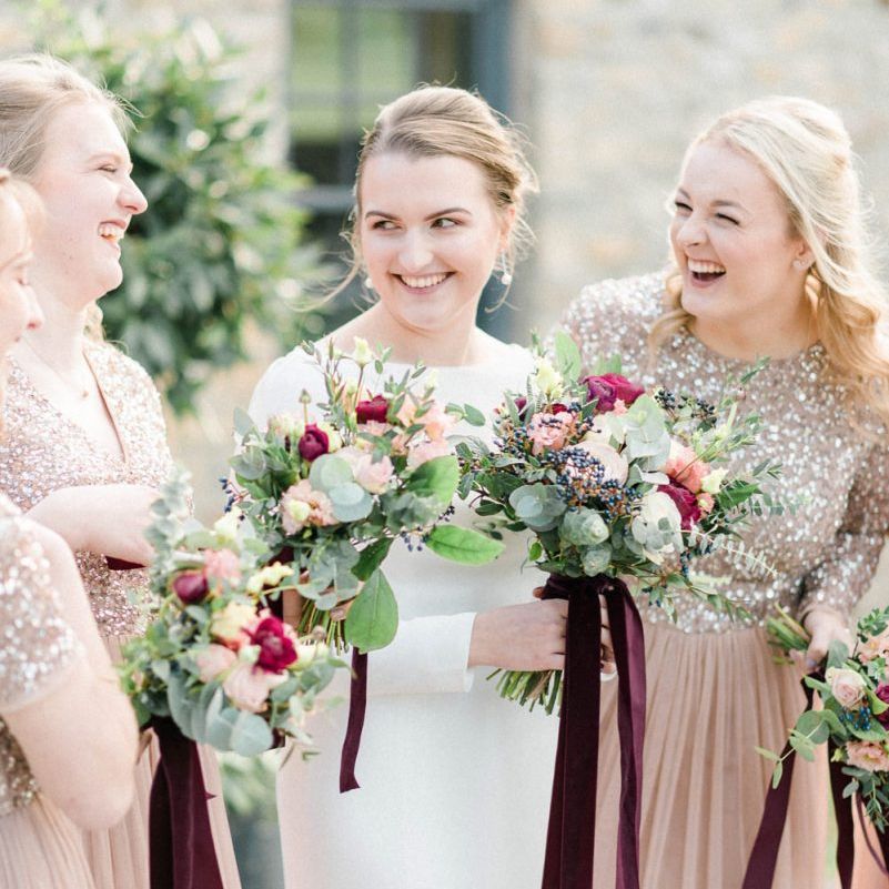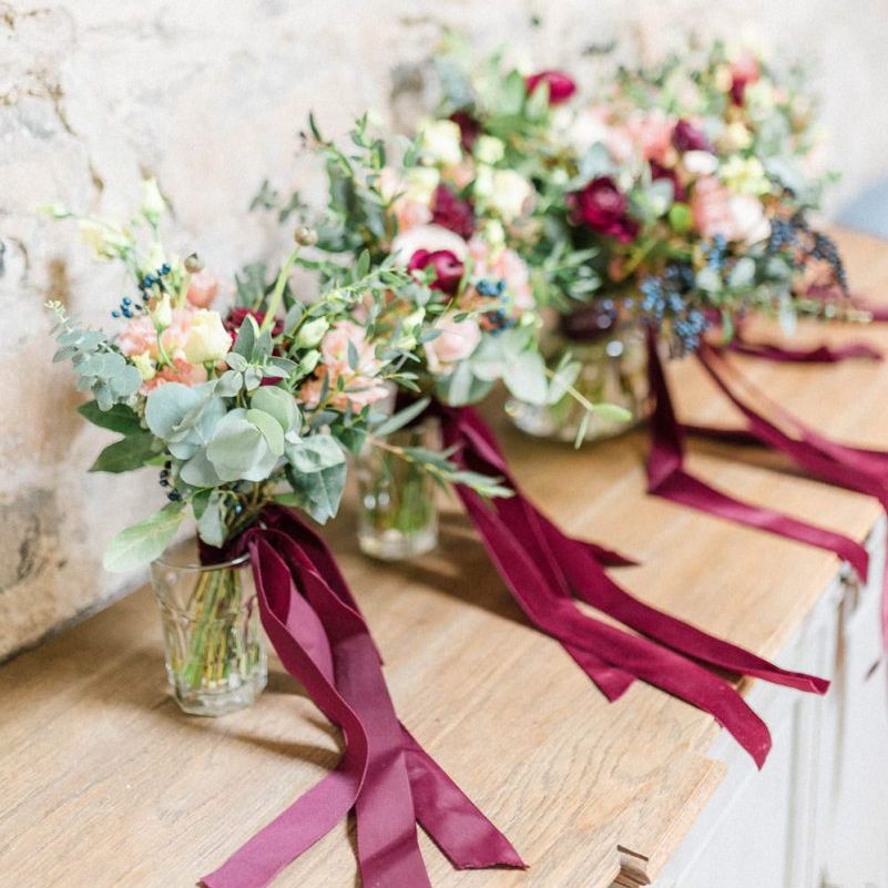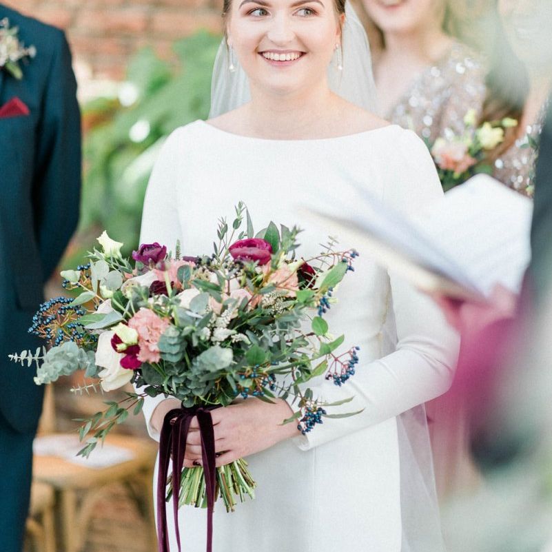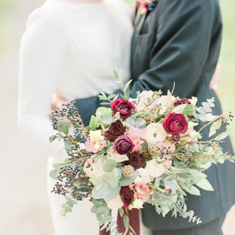 florist, Beth, and she was amazing! I wanted more wild bouquets, lots of greenery, berries and flowers and she got it exactly. She created matching bouquets for the bridesmaids and all of our bouquets were tied with ribbons that hung down from the bouquets. I was in love with our flowers. The tables were dressed in eucalyptus and other greenery, with rose gold and burgundy candles, which looked perfect. We had so many compliments on the flowers and decor.