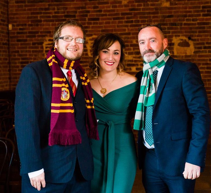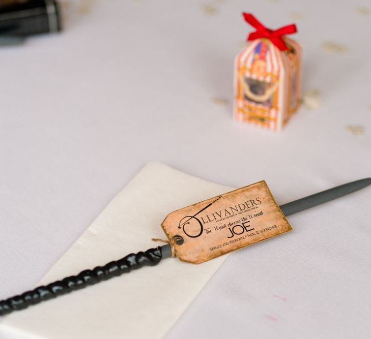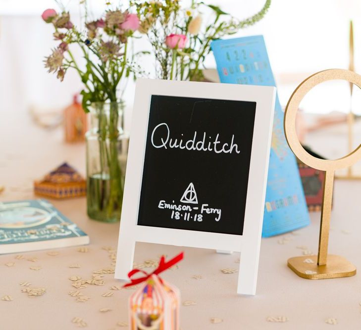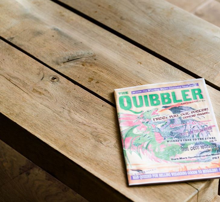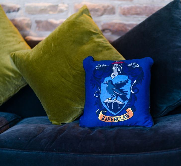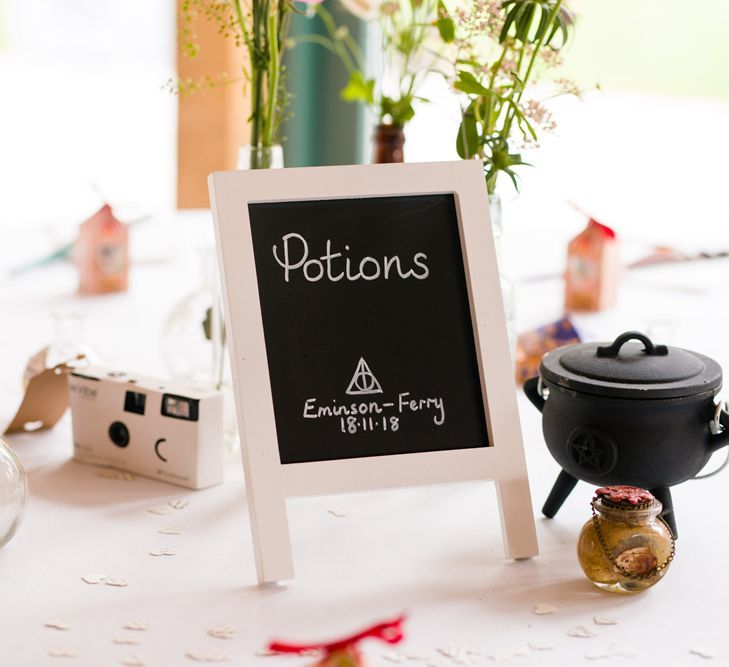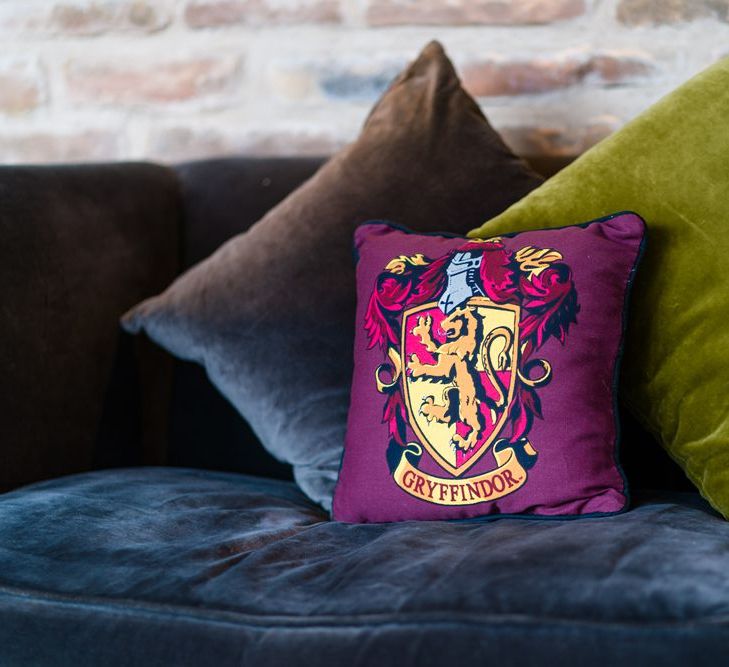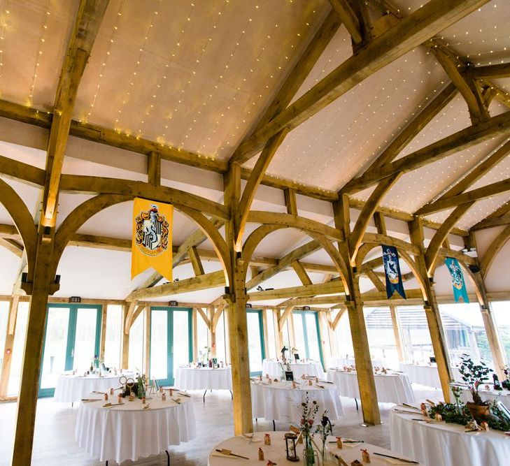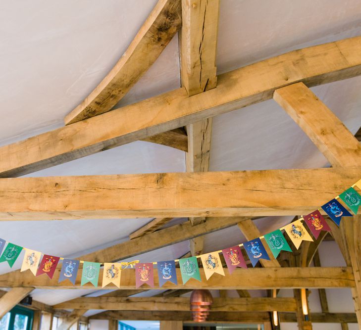 Due to the date being in November, we went for an autumnal wildflower theme with the flowers and candles in the barn during the ceremony. However, the bar and dining area were kitted out with Harry Potter in mind, including Hogwarts house banners, bunting, artwork and many objects relating to different classrooms. With the invitation came a dress code, with guests asked to dress in the colours of the house they were sorted into, and we felt this made for a more relaxed than a completely formal affair, which we loved.