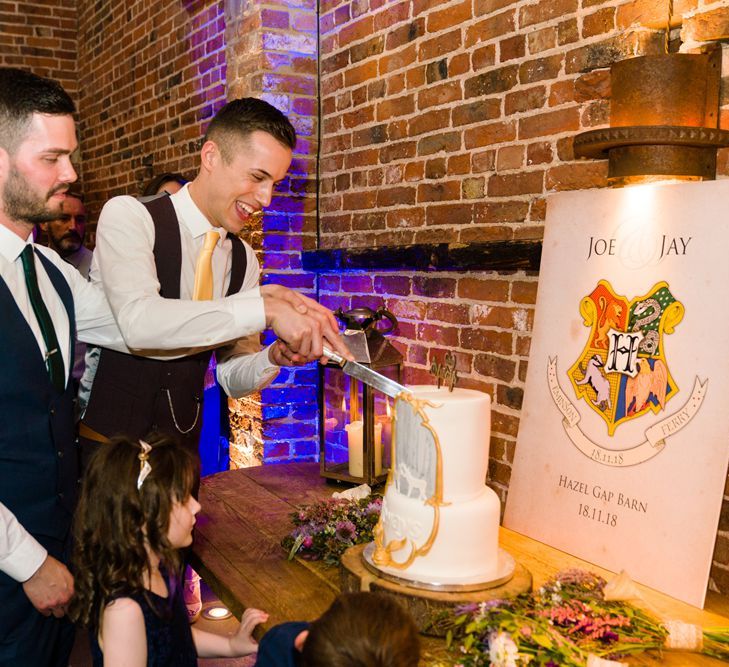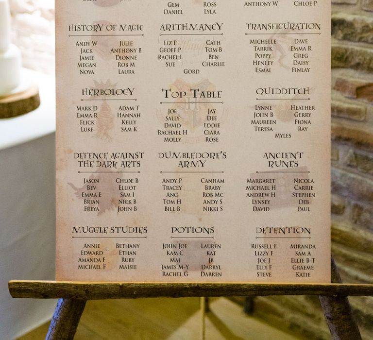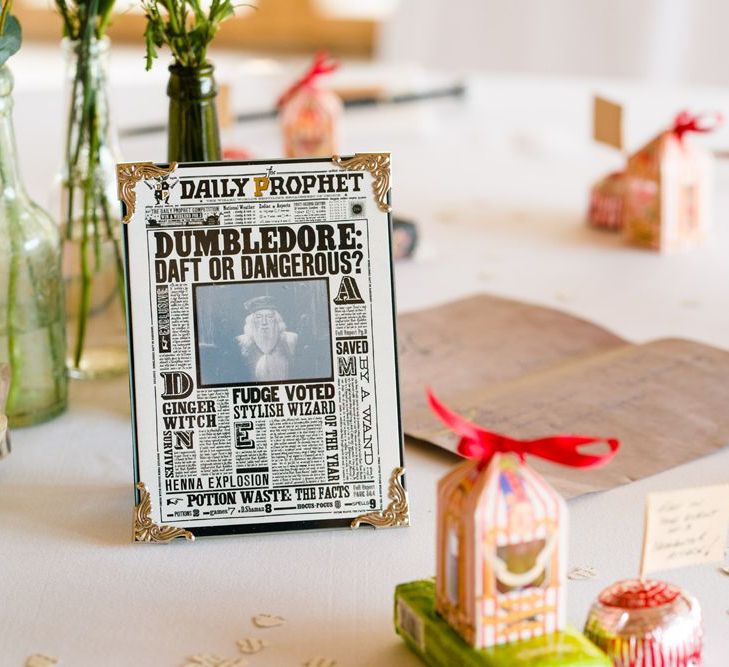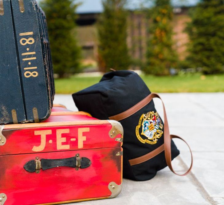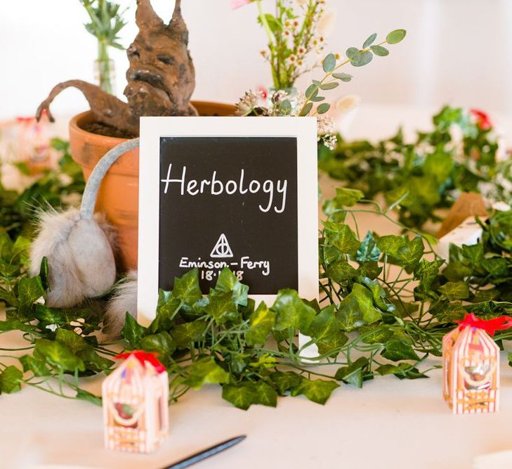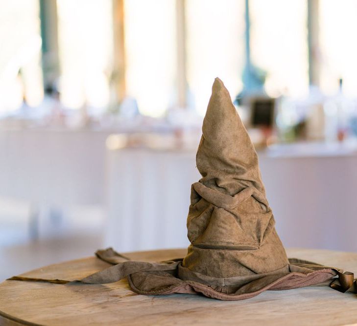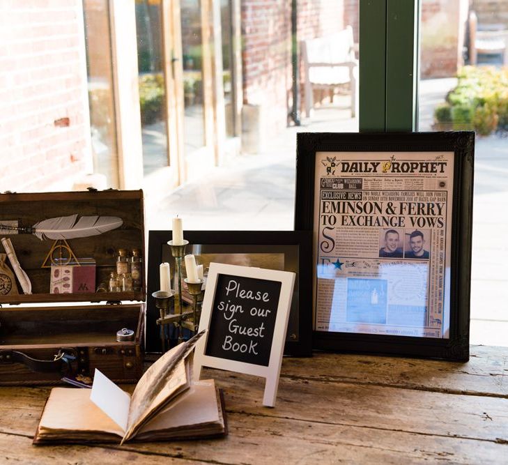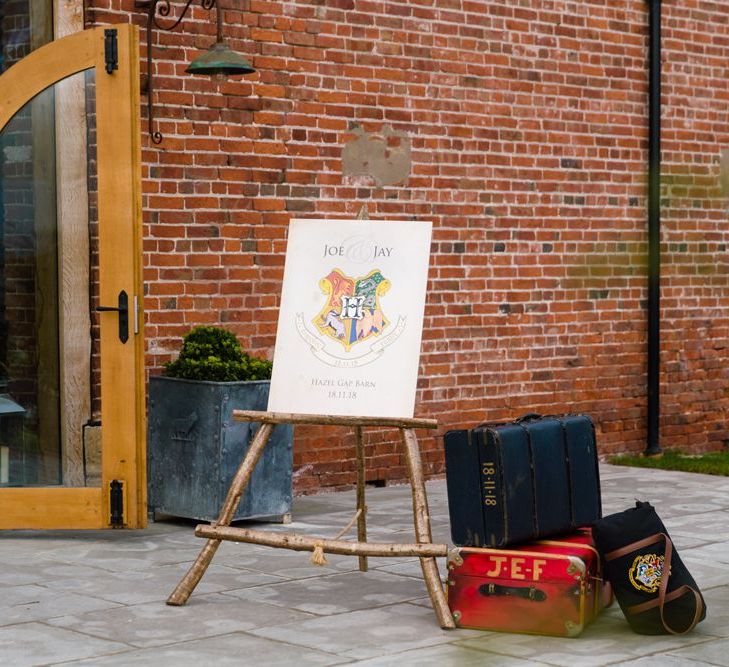 Due to the date being in November, we went for an autumnal wildflower theme with the flowers and candles in the barn during the ceremony. However, the bar and dining area were kitted out with Harry Potter in mind, including Hogwarts house banners, bunting, artwork and many objects relating to different classrooms. With the invitation came a dress code, with guests asked to dress in the colours of the house they were sorted into, and we felt this made for a more relaxed than a completely formal affair, which we loved.