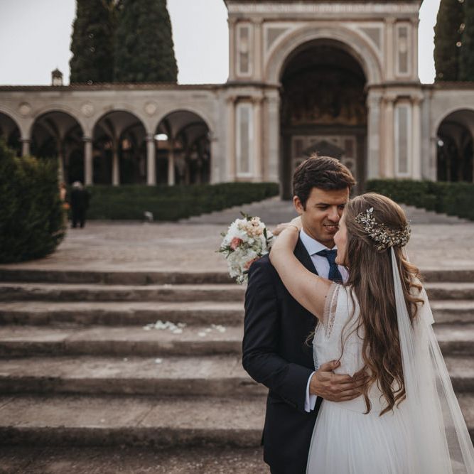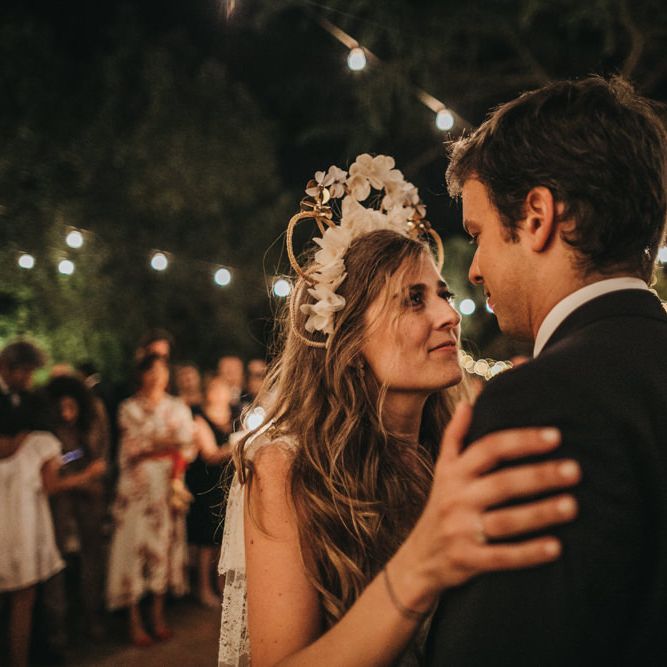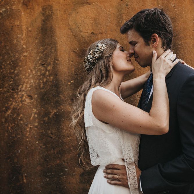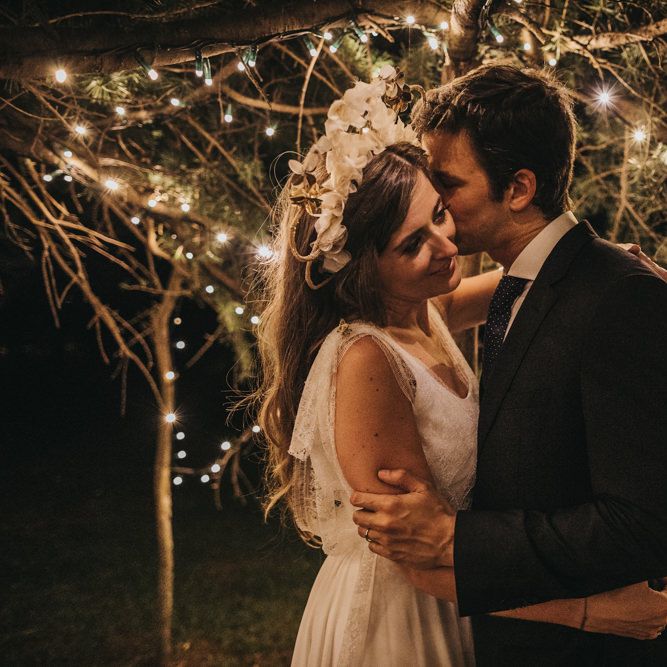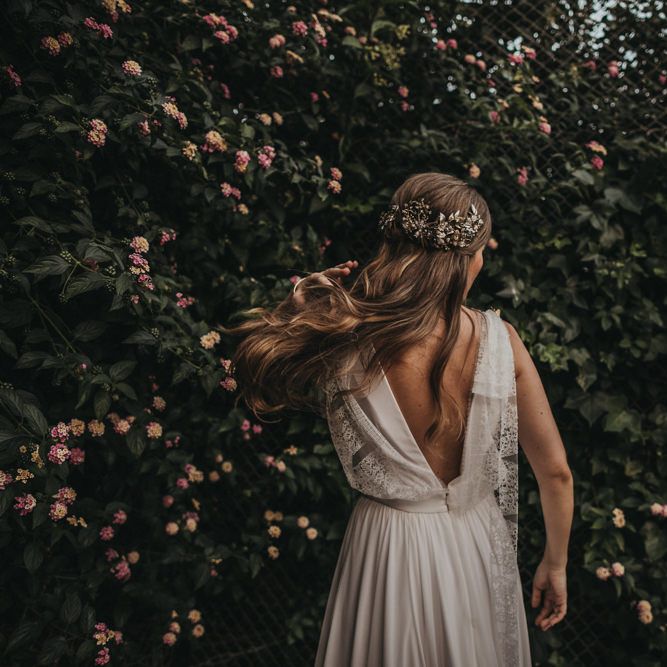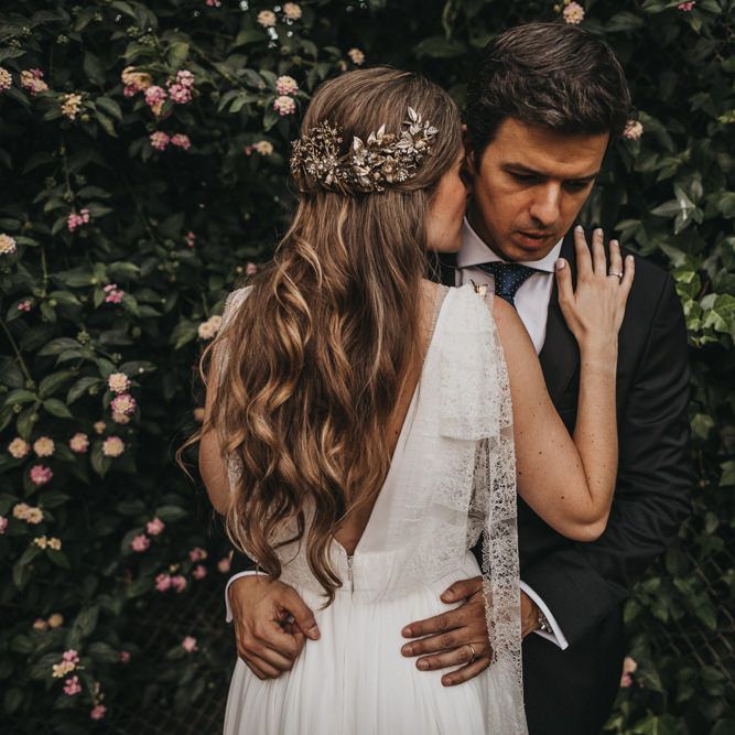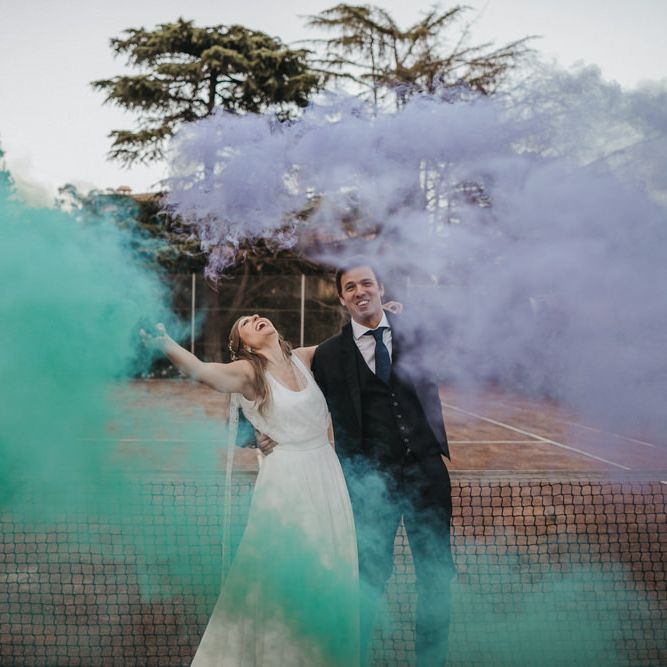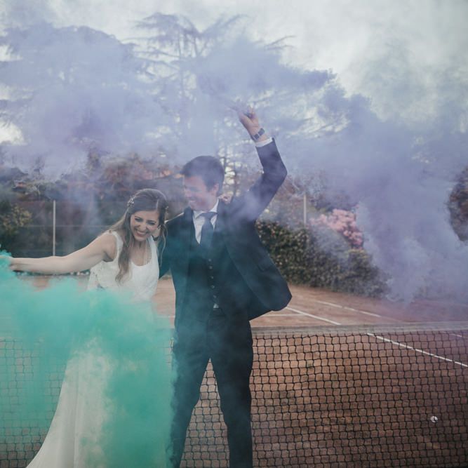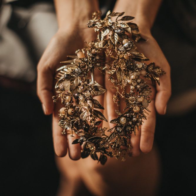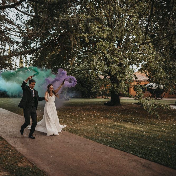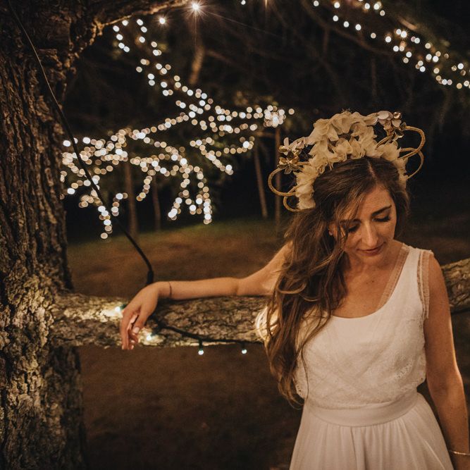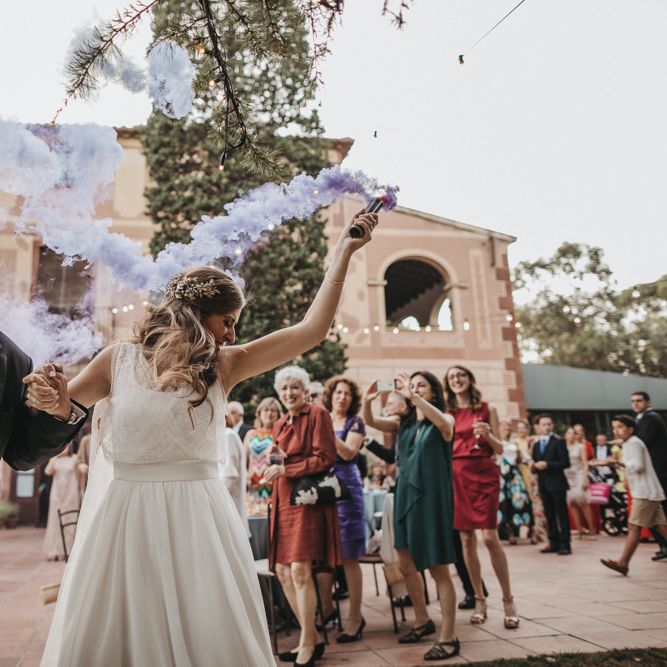 Golden Jungle Wedding with Bride in Golden Headdress and Smoke Bomb Portraits at Masia Riba Barcelona, shot by Serafin Castillo