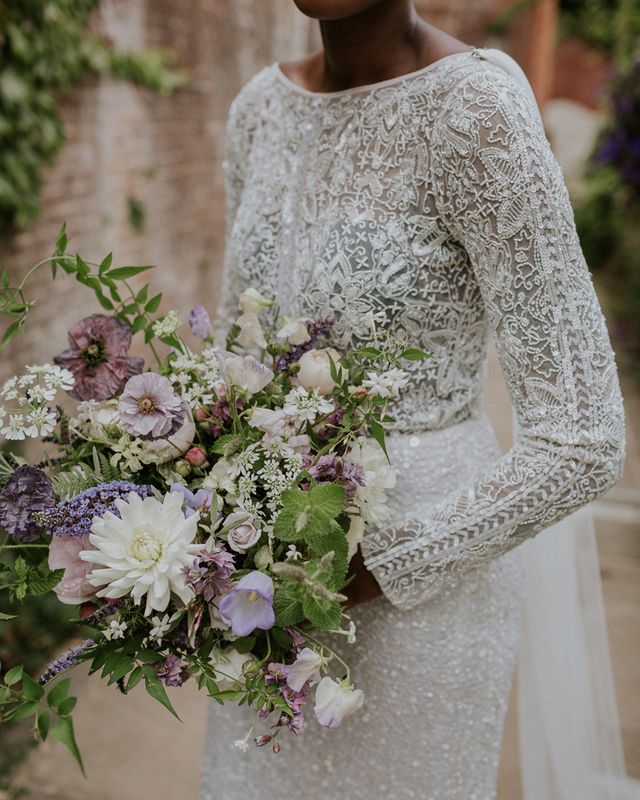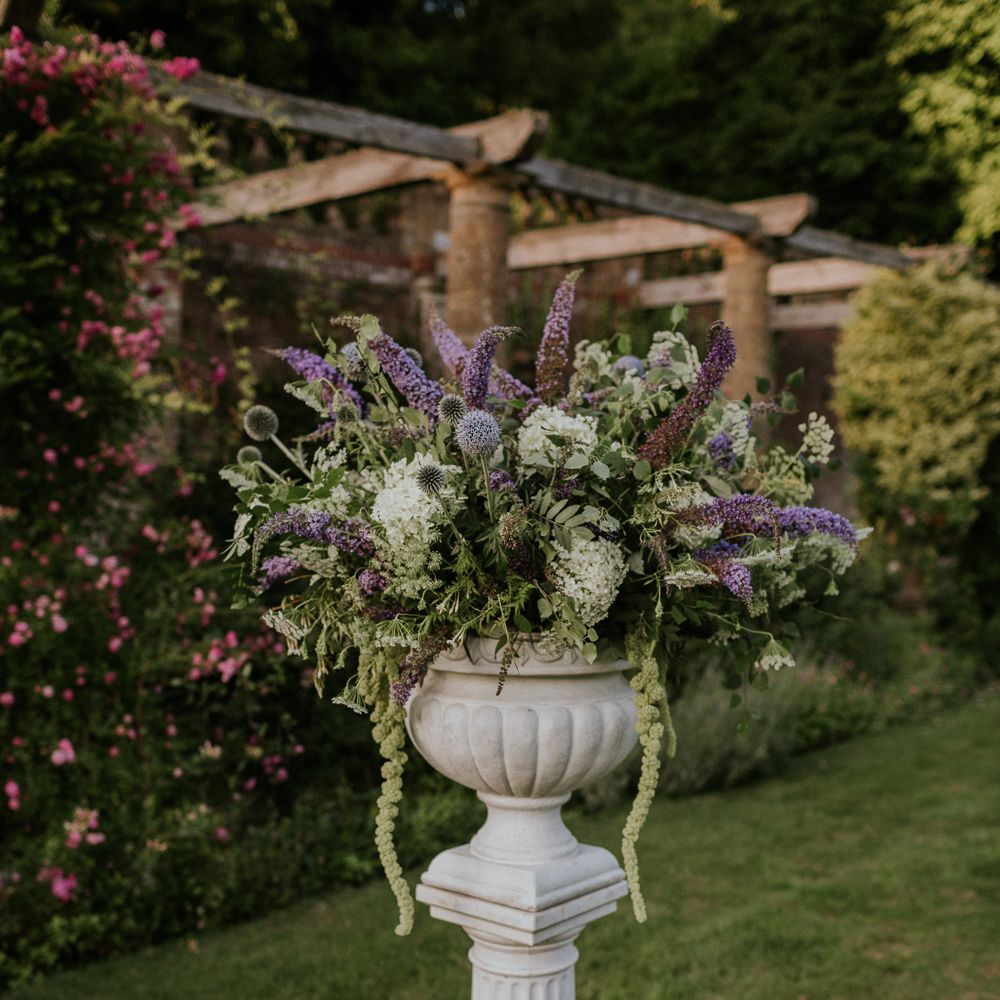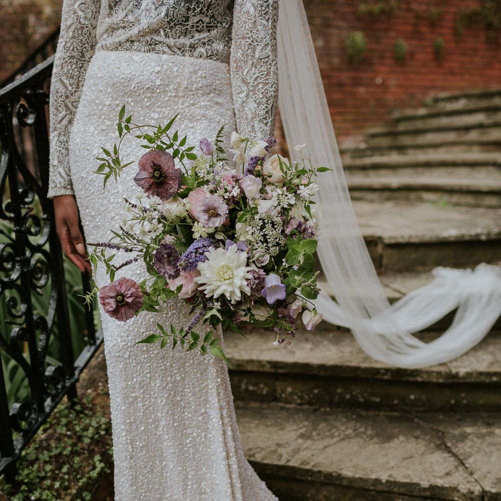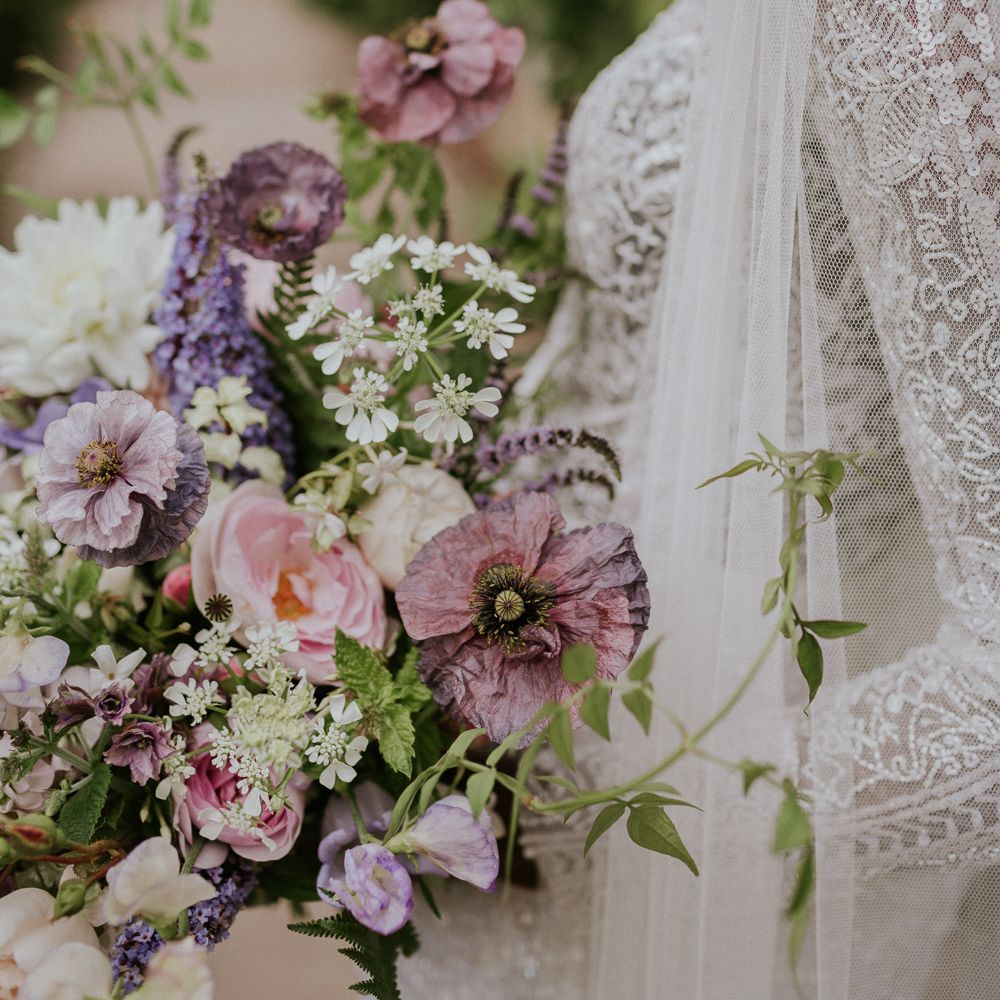The flowers were chosen to be reminiscent of a long summer afternoon in Provence, with the scent of lavender & garden roses in the air. As such, I chose to use predominantly British flowers and foliage sourced from artisan local growers. The roses in the bouquet came from Wales and had that quintessential garden rose scent. Sweet peas, jasmine and mint also added to the summer fragrance.'Amazing Grey' Poppies were styled with longer stems for that 'just gathered' aesthetic. All of the flowers were arranged in water with no floral foam, I aim to keep my plastic use and flower air miles to a minimum