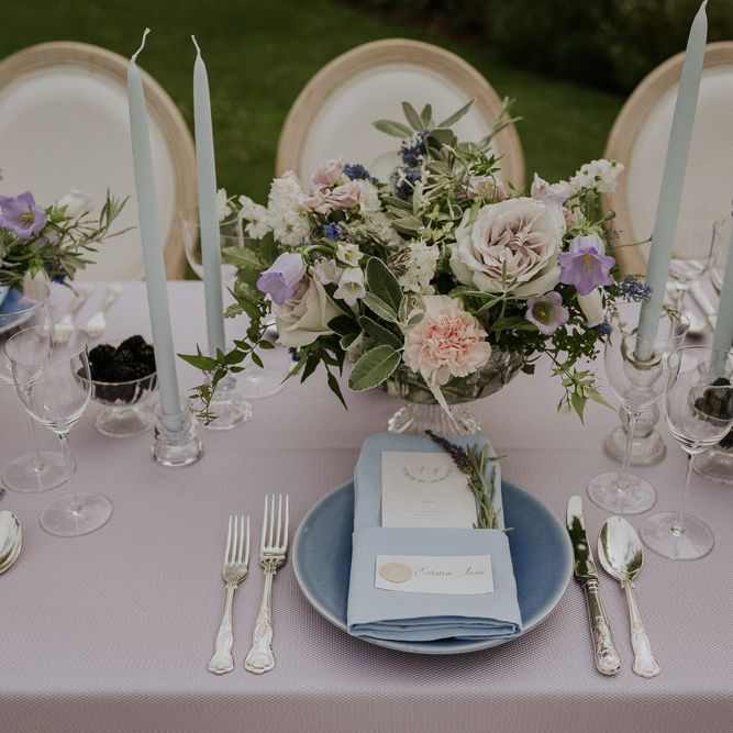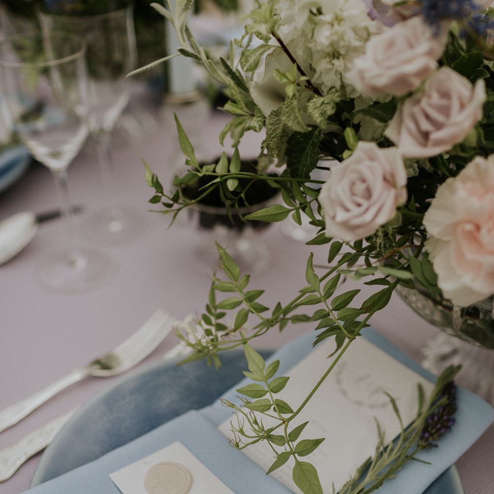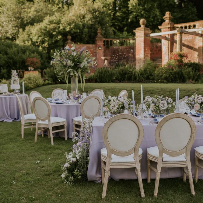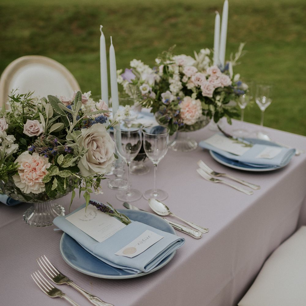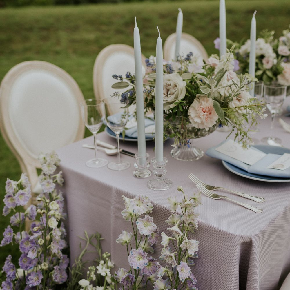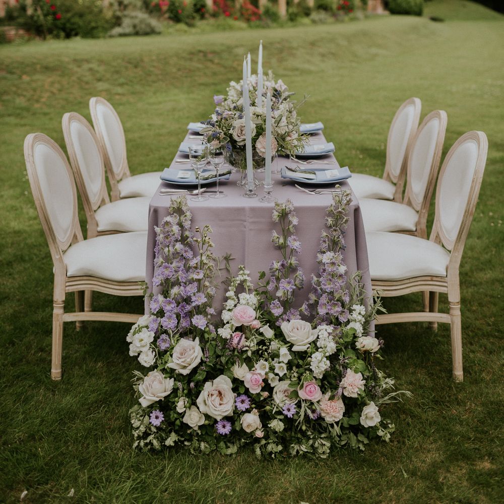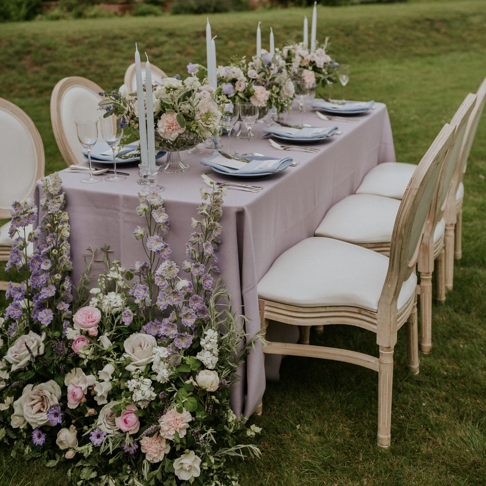 We wanted to experiment with the pale blues and lilacs that make a Provençal wedding so effortlessly pretty while incorporating our own modern touches such as the stoneware china and floral meadow. Provençal styling is typically more rustic than our design and makes more use of wooden furniture, though to add an element of luxury to the overall look, I opted for plush Louis chairs and heavy table linen in pale lilac.