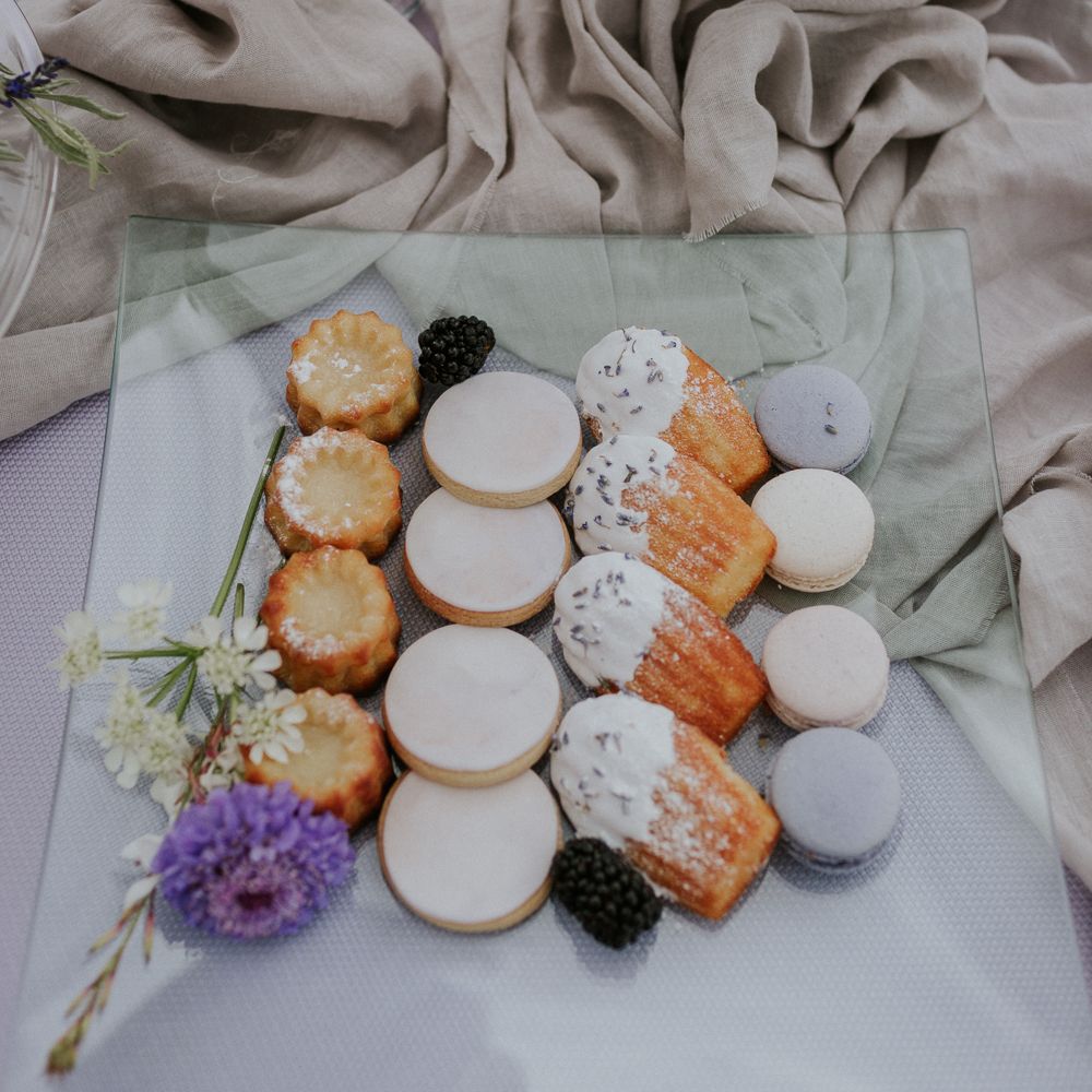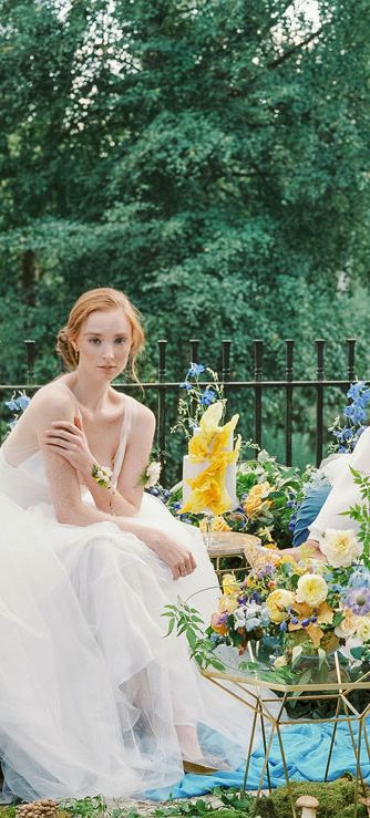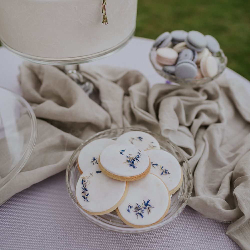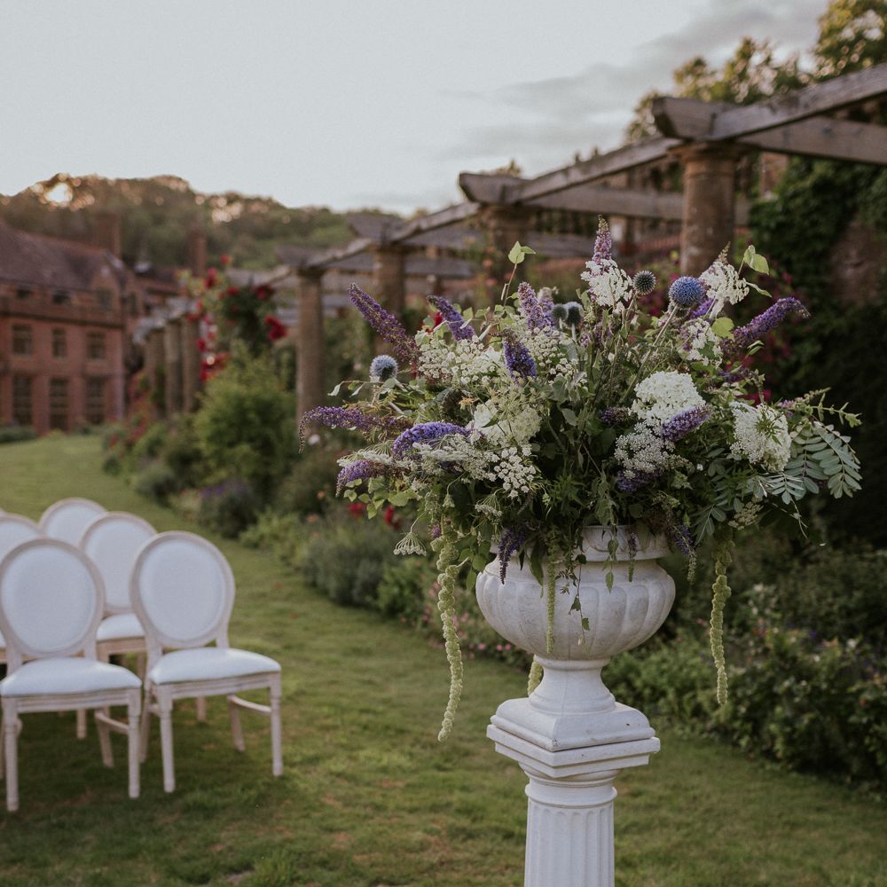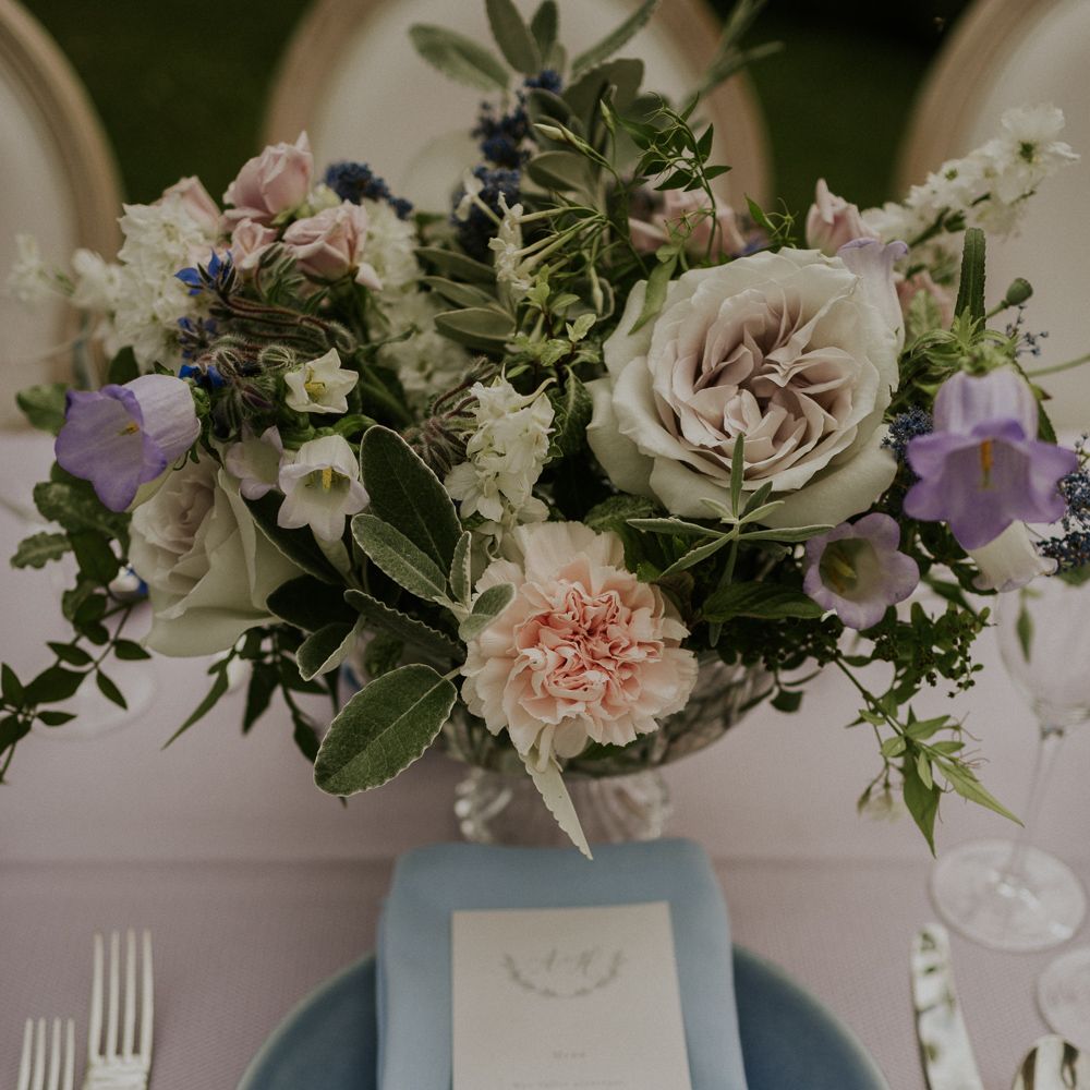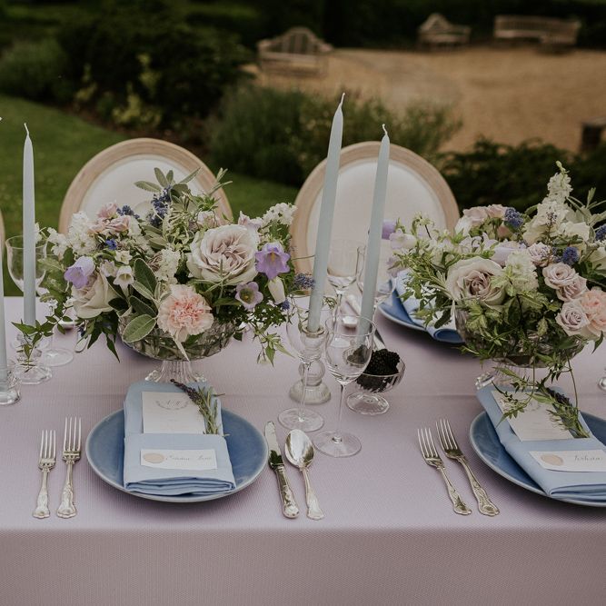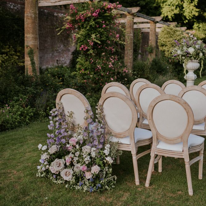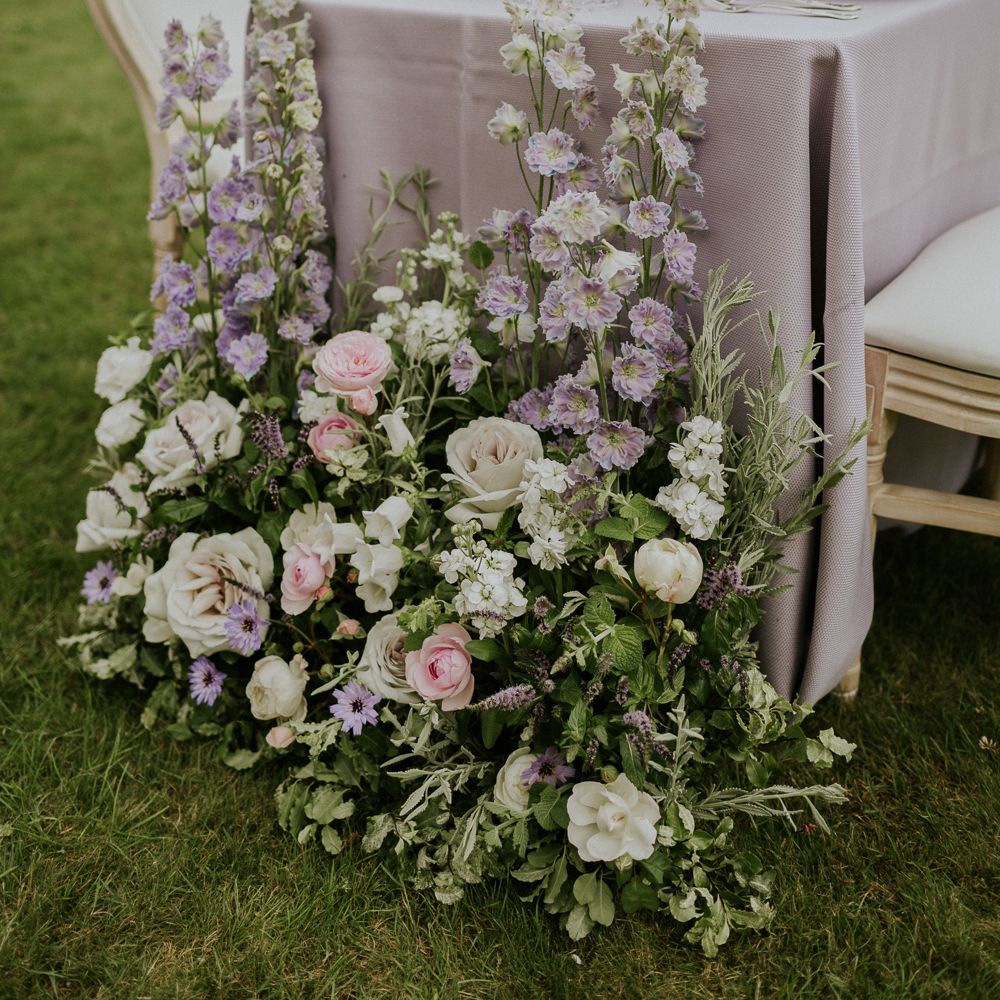 We wanted to experiment with the pale blues and lilacs that make a Provençal wedding so effortlessly pretty while incorporating our own modern touches such as the stoneware china and floral meadow. Provençal styling is typically more rustic than our design and makes more use of wooden furniture, though to add an element of luxury to the overall look, I opted for plush Louis chairs and heavy table linen in pale lilac.