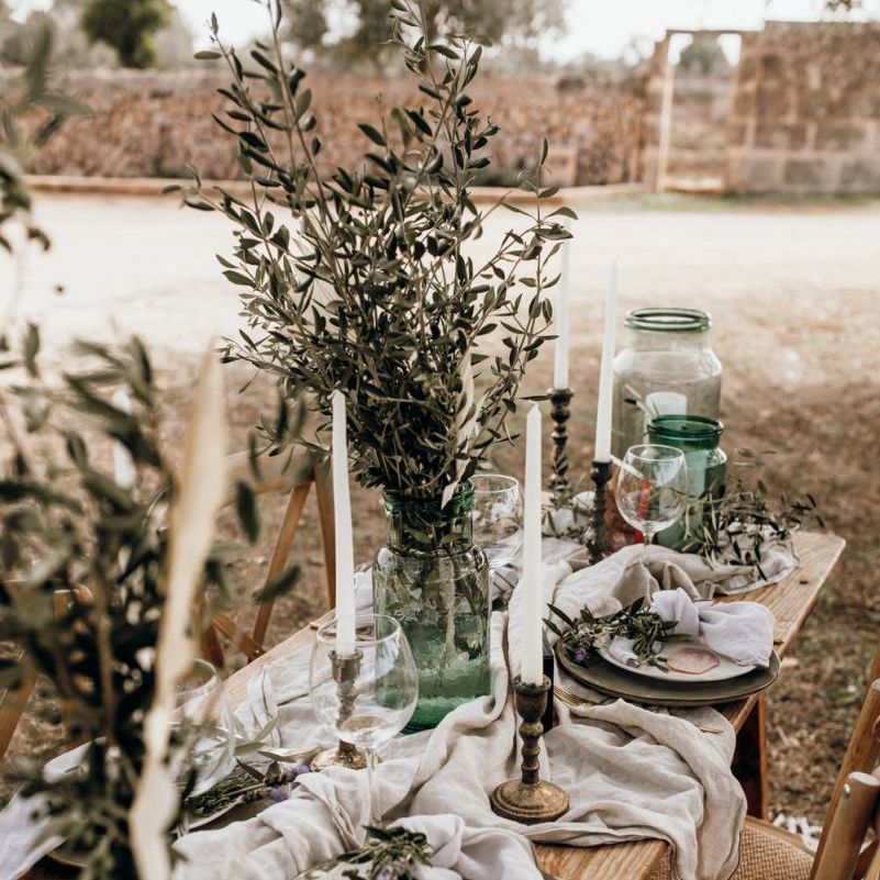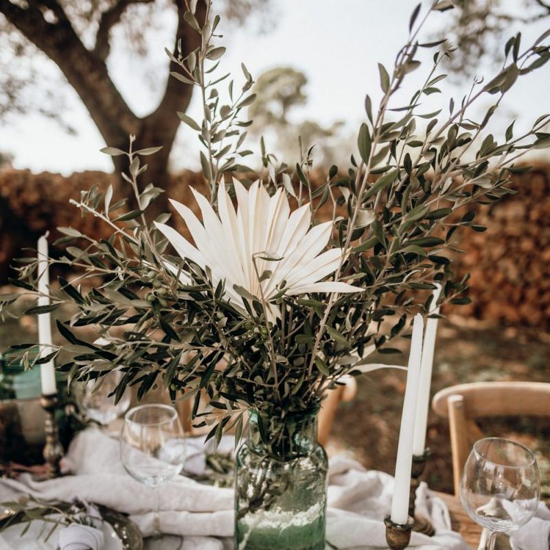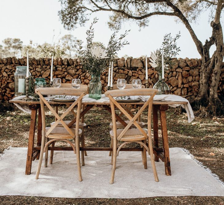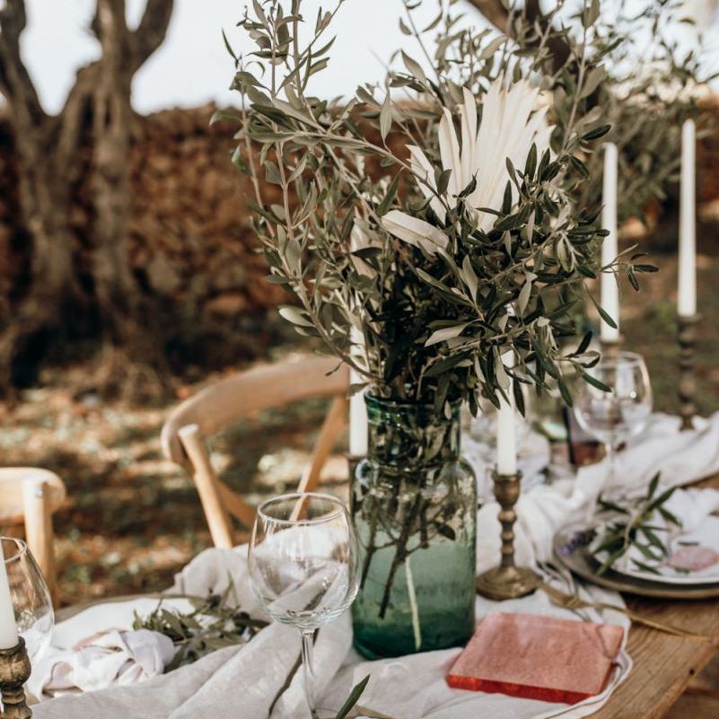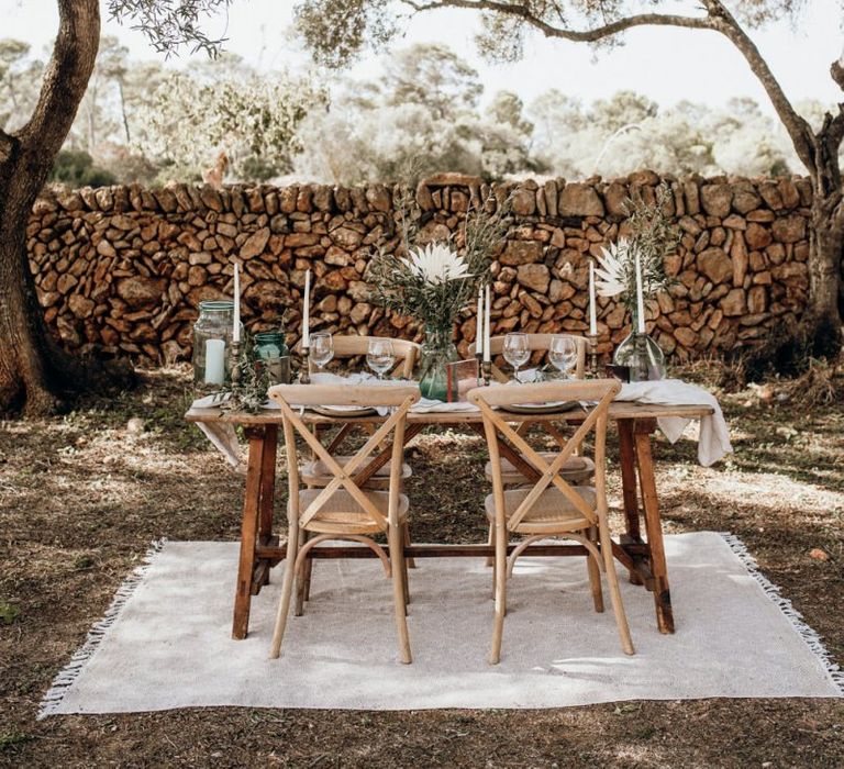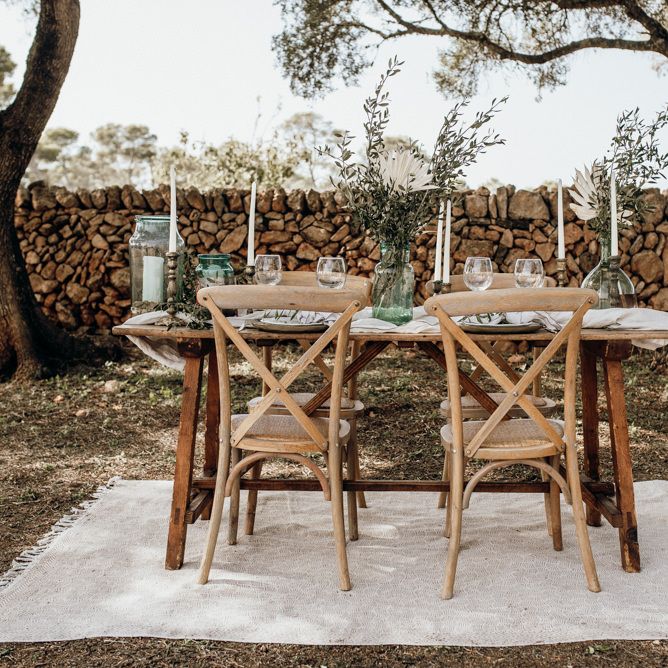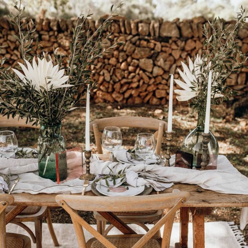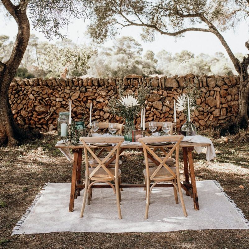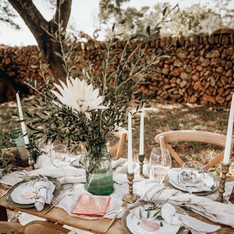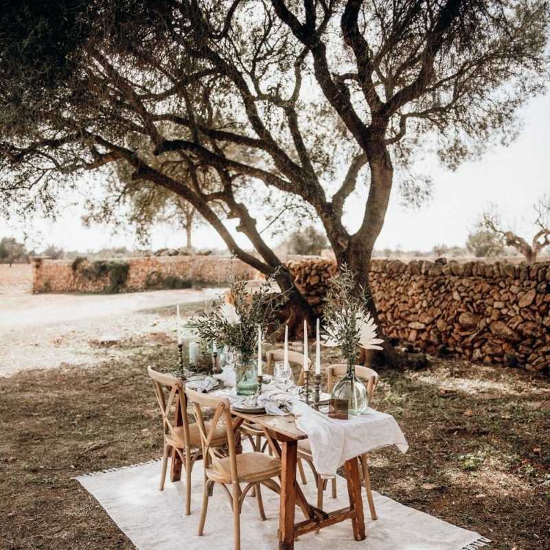In this inspiration, we wanted to show the possibilities of celebrating in a private Finca, which is, in our opinion, one of the best options as you will have enough space for everyone to enjoy Mallorca's feel. As you can see, we decided to put the table setup somewhere outside in the shade of the trees to give the scene a natural and cozy vibe. The rentals are from
