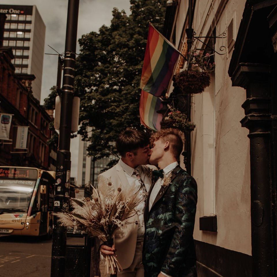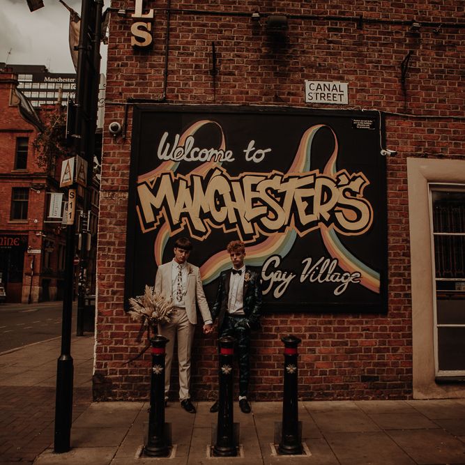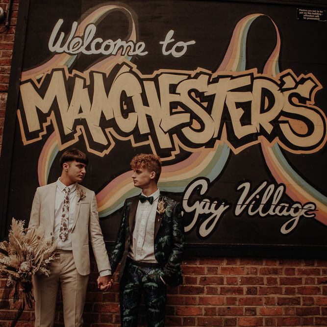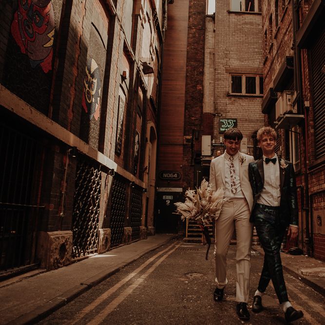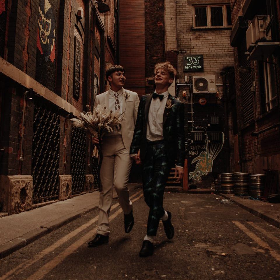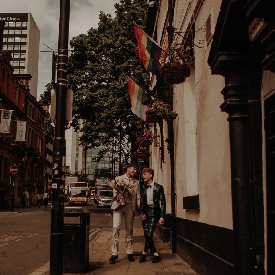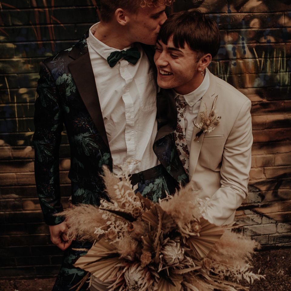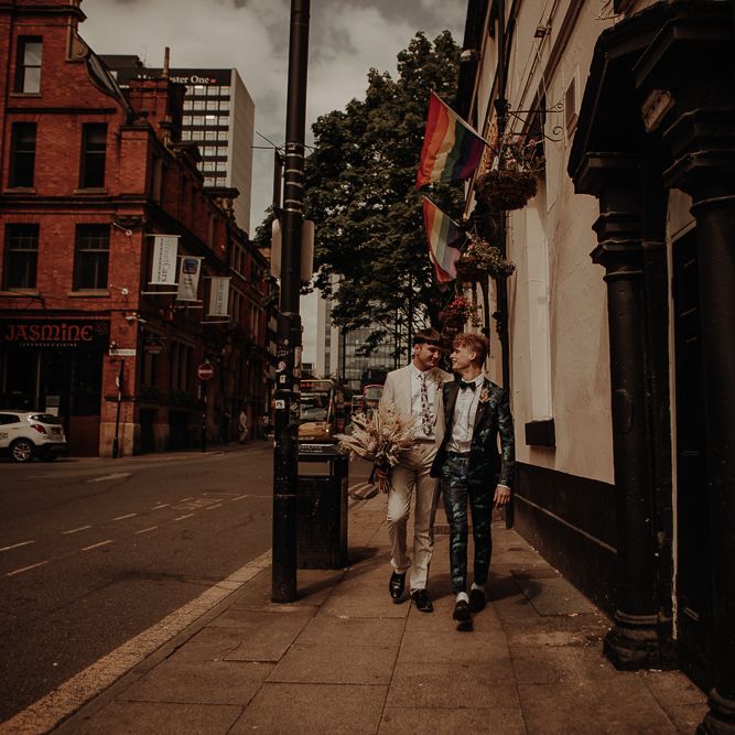 They chose their own suits, with Ben choosing a timeless, chic, stone-coloured suit from ASOS, which we matched with a blush pink floral tie from Twisted Tailor. Dylan opted for a loud blue floral suit from Moss London, which we matched with a teal bow tie, also from Twisted Tailor. The suits worked really well together – the pattern with the simplicity really paired well, without being at all matchy. When it came to florals, naturally, I asked Wildfire Floral Co to get involved. Sam and Emily have been doing dried florals since 2017, so I knew they’d deliver. We wanted a twist on a bouquet for the boys, so Wildfire created a striking, all dried arrangement, with creamy, beigey, browny tones featuring Protea, Palm Leaves, and Pampas. It tied in with the colours of the city and the urban theme. My photography style is very warm, rich, and romantic, and all the images in this shoot are really intimate and raw. The boys completely trusted me, and let themselves go in front of the camera, which always makes for the best images! Notable locations throughout the shoot were Canal Street, the Northern Quarter, and the Cathedral, creating perfect stylish elopement portrait shots that are timeless and full of PRIDE!