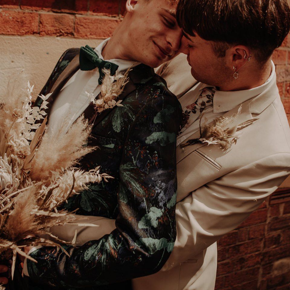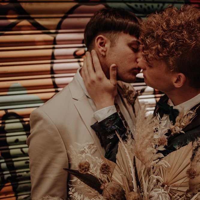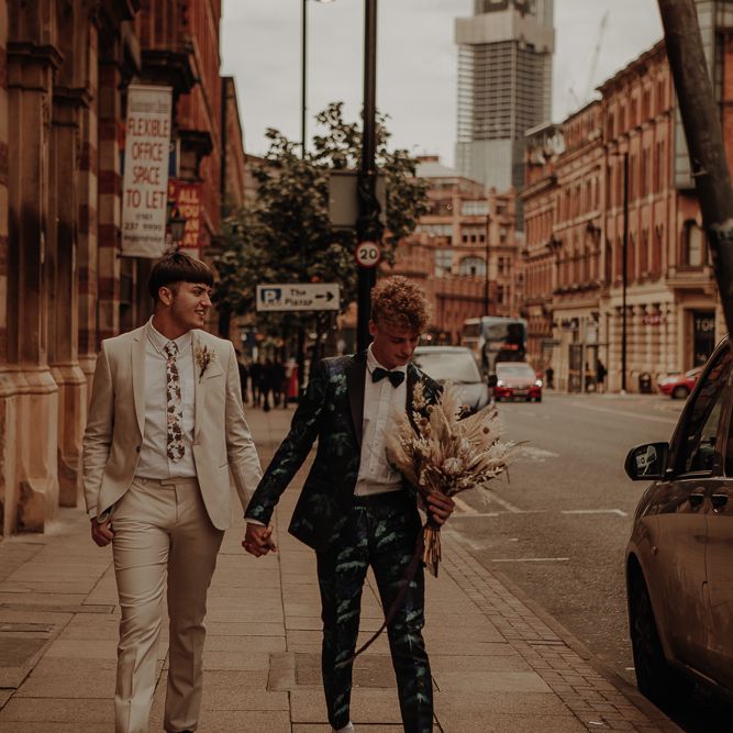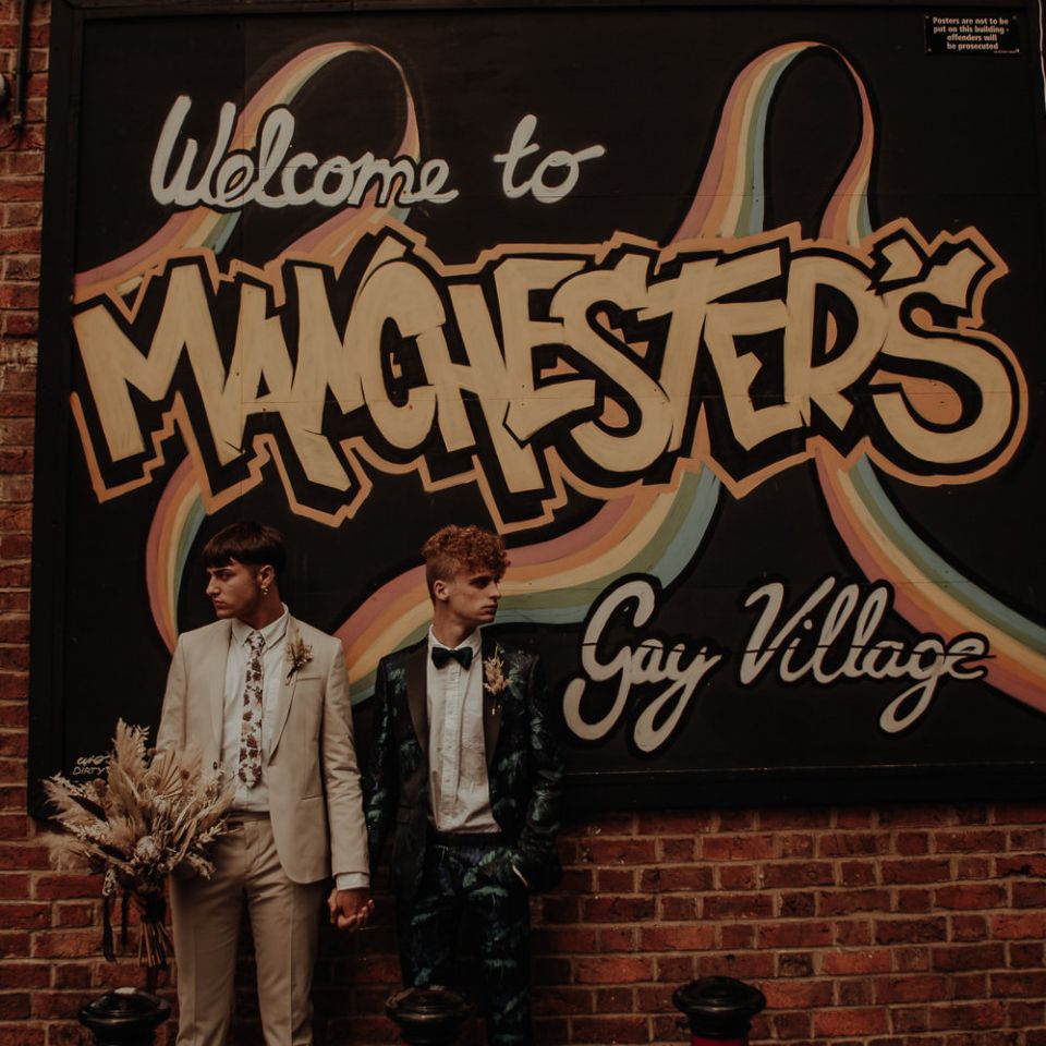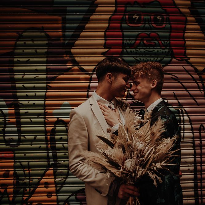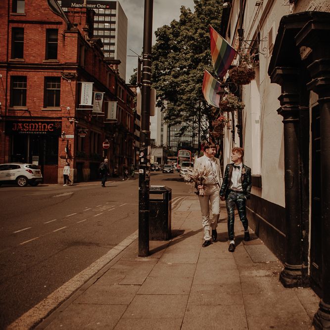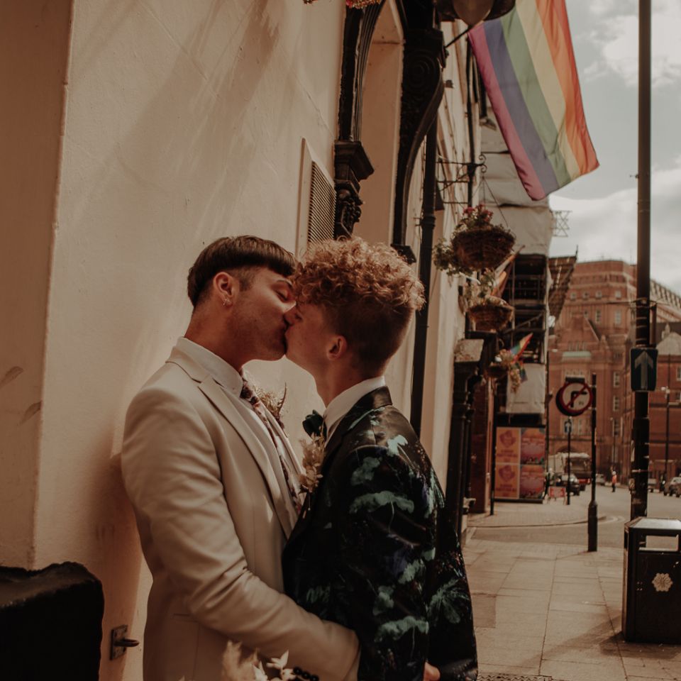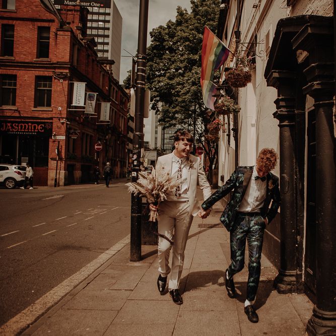 They chose their own suits, with Ben choosing a timeless, chic, stone-coloured suit from ASOS, which we matched with a blush pink floral tie from Twisted Tailor. Dylan opted for a loud blue floral suit from Moss London, which we matched with a teal bow tie, also from Twisted Tailor. The suits worked really well together – the pattern with the simplicity really paired well, without being at all matchy. When it came to florals, naturally, I asked Wildfire Floral Co to get involved. Sam and Emily have been doing dried florals since 2017, so I knew they’d deliver. We wanted a twist on a bouquet for the boys, so Wildfire created a striking, all dried arrangement, with creamy, beigey, browny tones featuring Protea, Palm Leaves, and Pampas. It tied in with the colours of the city and the urban theme. My photography style is very warm, rich, and romantic, and all the images in this shoot are really intimate and raw. The boys completely trusted me, and let themselves go in front of the camera, which always makes for the best images! Notable locations throughout the shoot were Canal Street, the Northern Quarter, and the Cathedral, creating perfect stylish elopement portrait shots that are timeless and full of PRIDE!