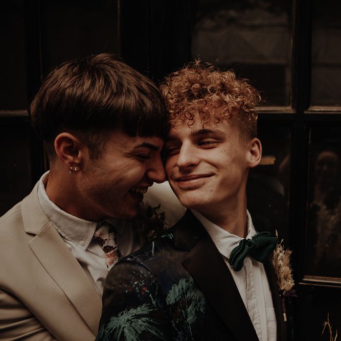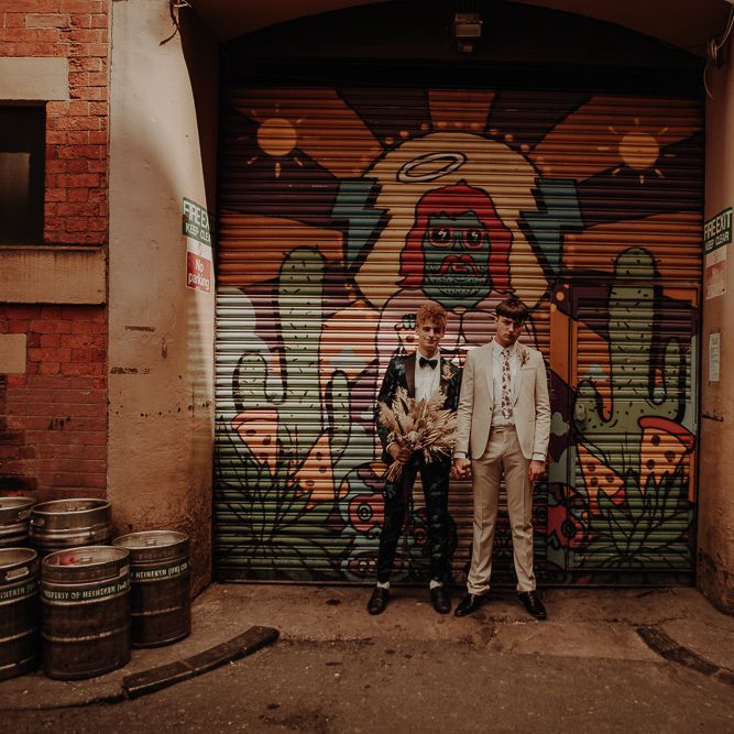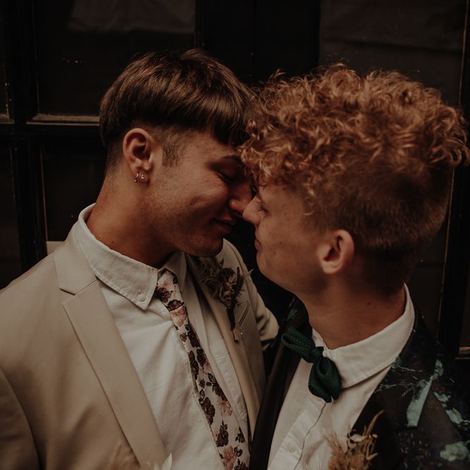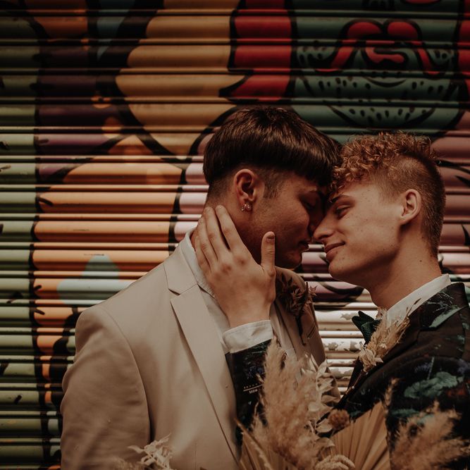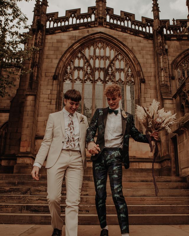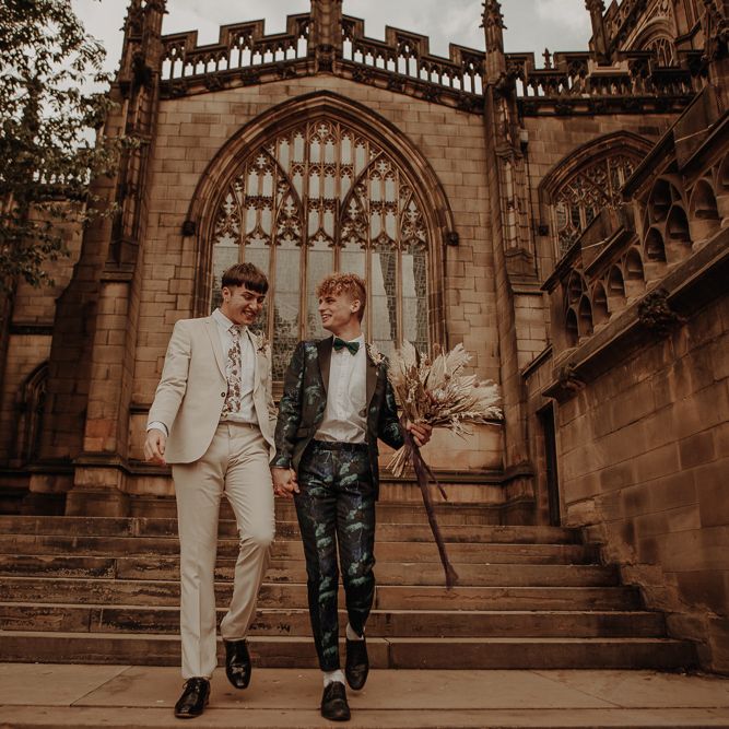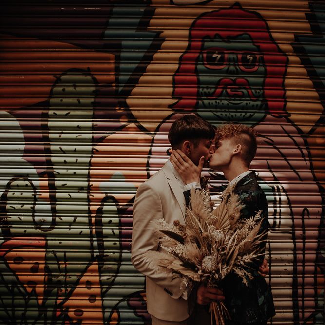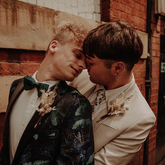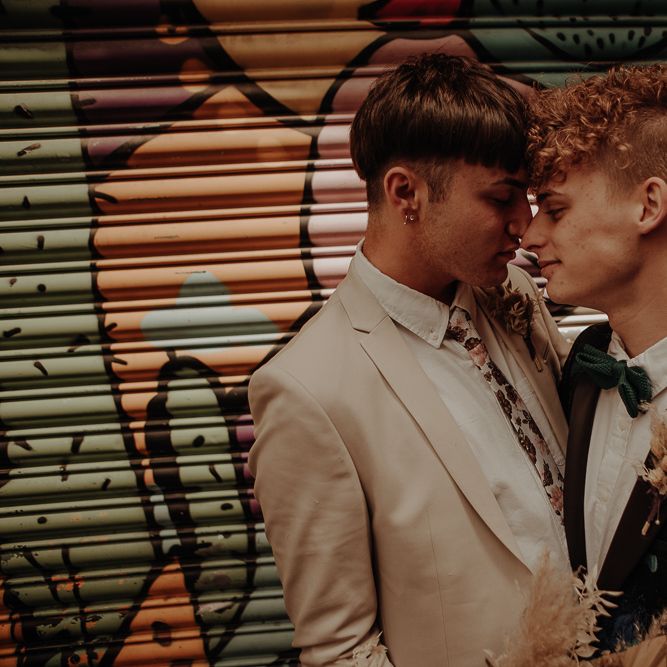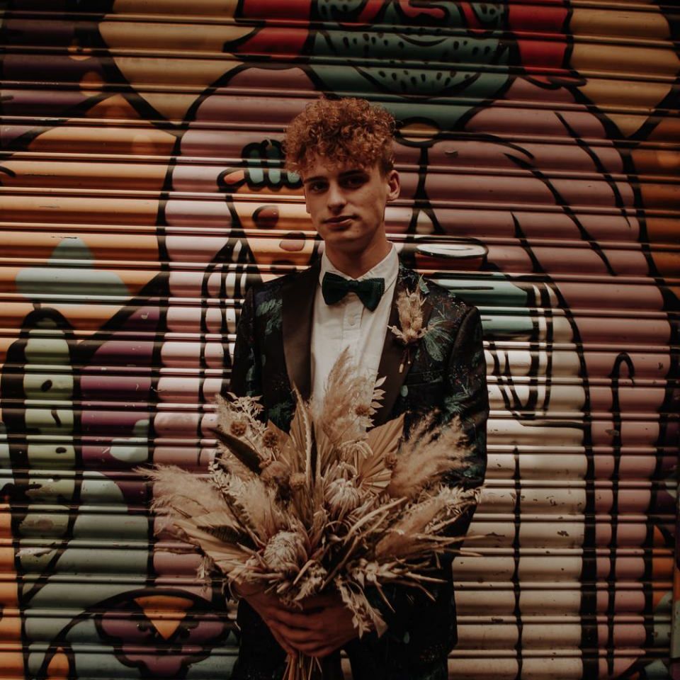 They chose their own suits, with Ben choosing a timeless, chic, stone-coloured suit from ASOS, which we matched with a blush pink floral tie from Twisted Tailor. Dylan opted for a loud blue floral suit from Moss London, which we matched with a teal bow tie, also from Twisted Tailor. The suits worked really well together – the pattern with the simplicity really paired well, without being at all matchy. When it came to florals, naturally, I asked Wildfire Floral Co to get involved. Sam and Emily have been doing dried florals since 2017, so I knew they’d deliver. We wanted a twist on a bouquet for the boys, so Wildfire created a striking, all dried arrangement, with creamy, beigey, browny tones featuring Protea, Palm Leaves, and Pampas. It tied in with the colours of the city and the urban theme. My photography style is very warm, rich, and romantic, and all the images in this shoot are really intimate and raw. The boys completely trusted me, and let themselves go in front of the camera, which always makes for the best images! Notable locations throughout the shoot were Canal Street, the Northern Quarter, and the Cathedral, creating perfect stylish elopement portrait shots that are timeless and full of PRIDE!