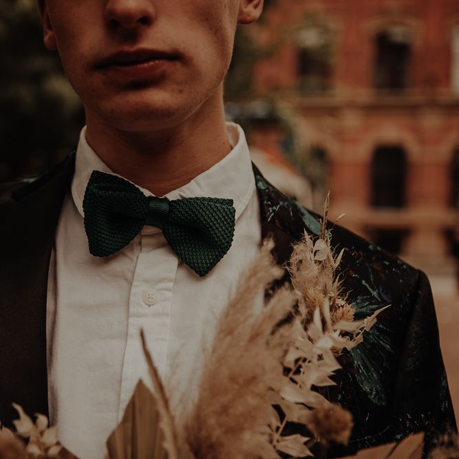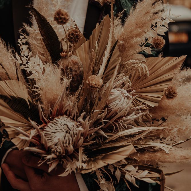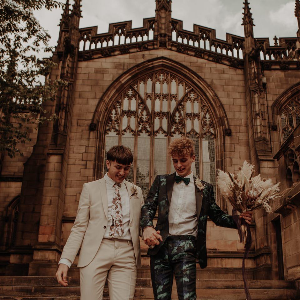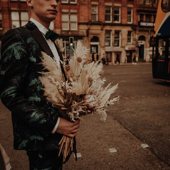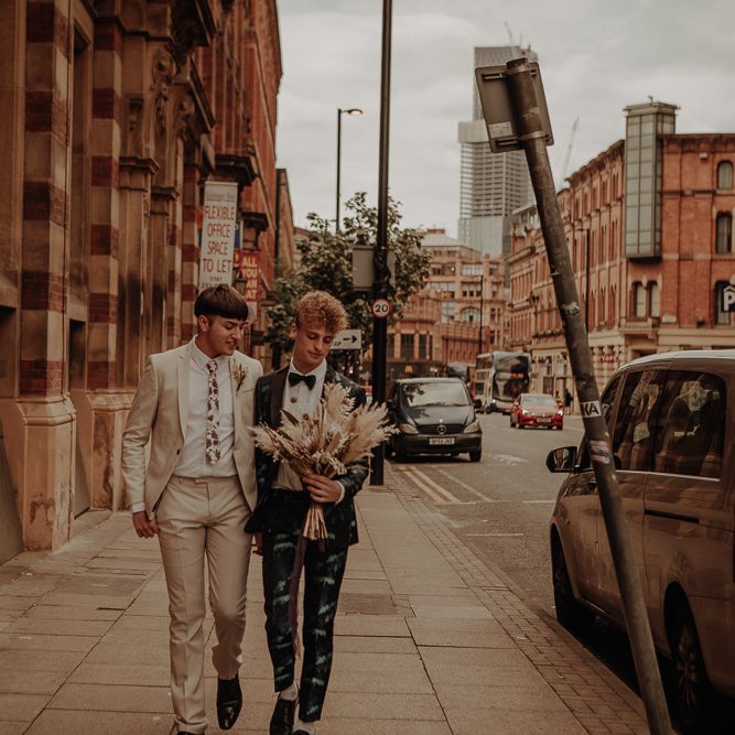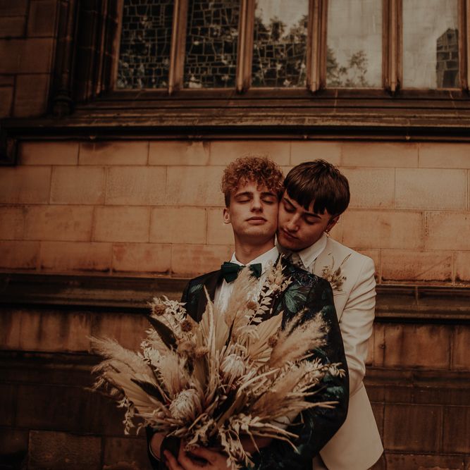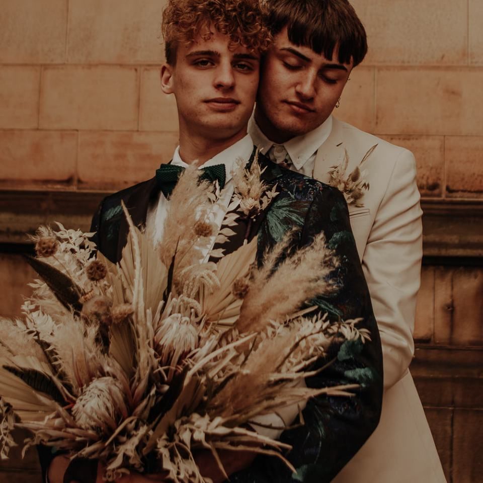 Intimate same-sex Manchester elopement with dried flower bouquet and stylish fashion