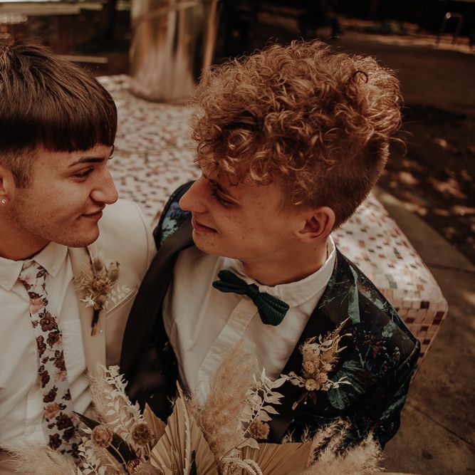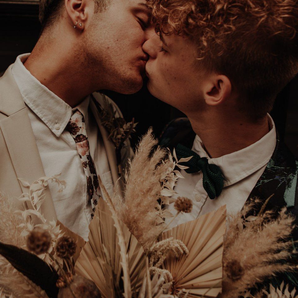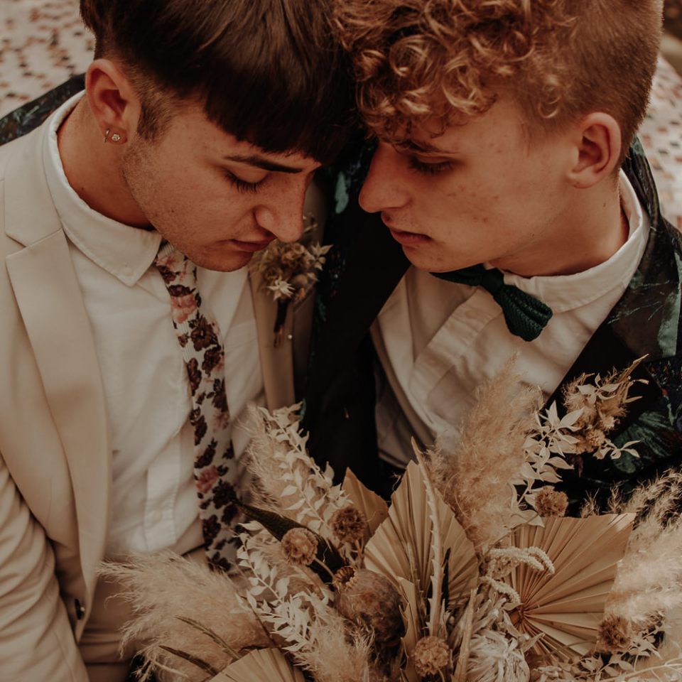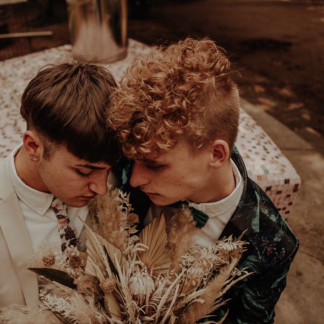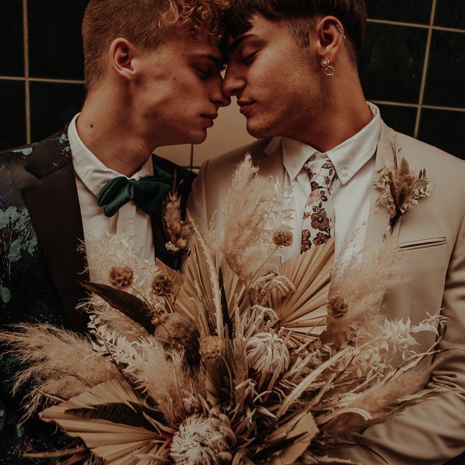 We knew we definitely wanted two grooms with a bouquet (and hoped the couple agreed!). Ben and Dylan absolutely loved the idea, and the collaboration between suppliers and the couple was a dream, for all of us, and so we ran (and skipped and danced) with it. It's no secret that generally speaking, bouquets have been pitched to brides, and button-holes to grooms, and we just don't understand why bouquets are not gender-neutral?! We wanted to break down this norm and show the industry, and couples everywhere, that bouquets for grooms, ARE and CAN be accessible! Florists, we bet you'd love to offer this too!