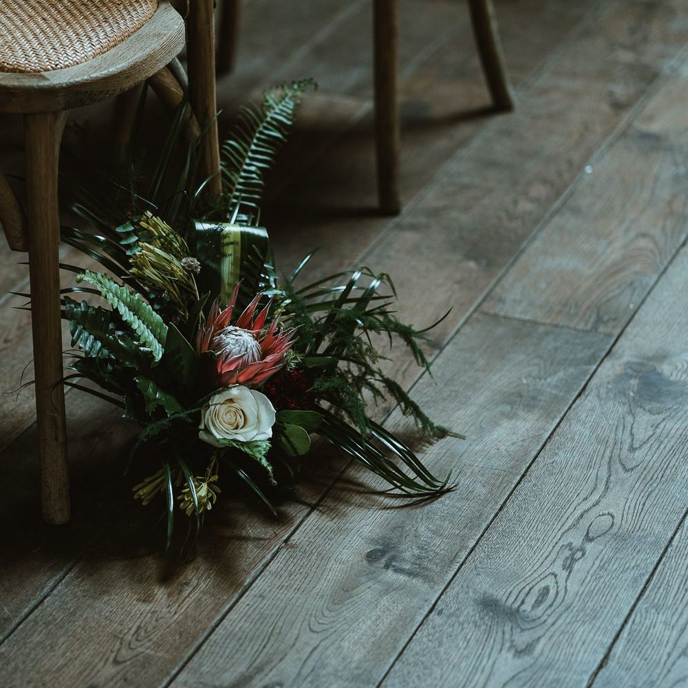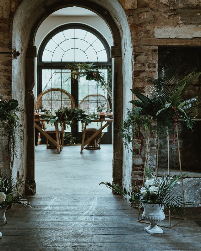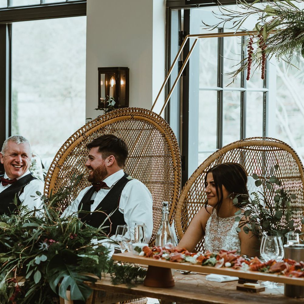 Boho-glam was our wedding vibe. We wanted the day to feel relaxed and the venue to be enhanced with natural beauty by filling it with flowers and foliage. We chose to have gold accents running throughout, which added an element of sophistication and glamour. Like most brides, I browsed Pinterest when searching for inspiration, but got creative by introducing modern, geometric gold structures. The hexagon moon gate was the star of the show, entwined with foliage and flowers, giving height to the floral arrangements that flowed throughout the venue.
