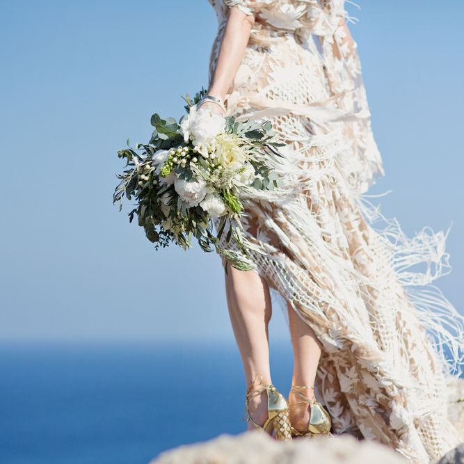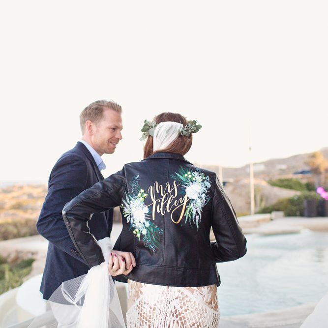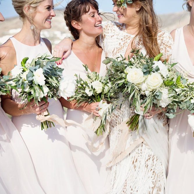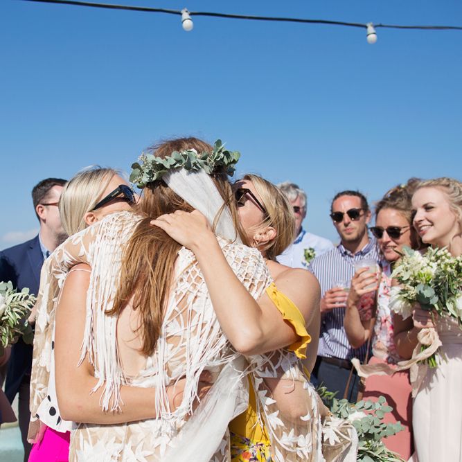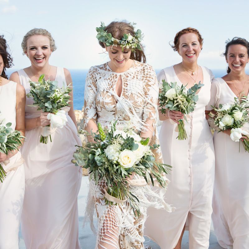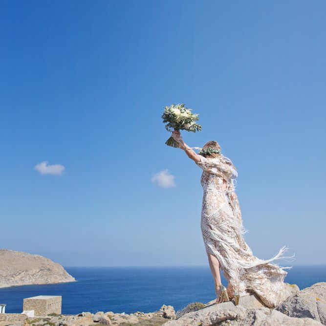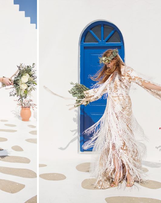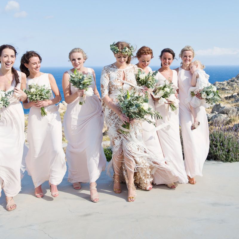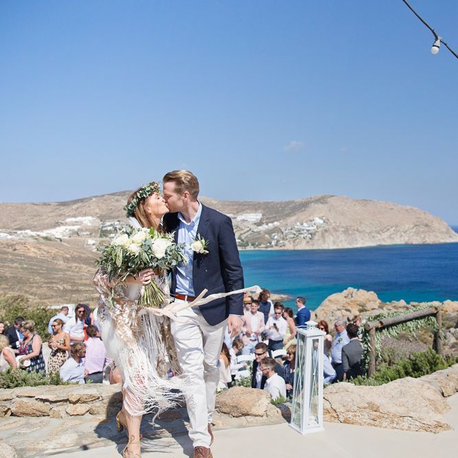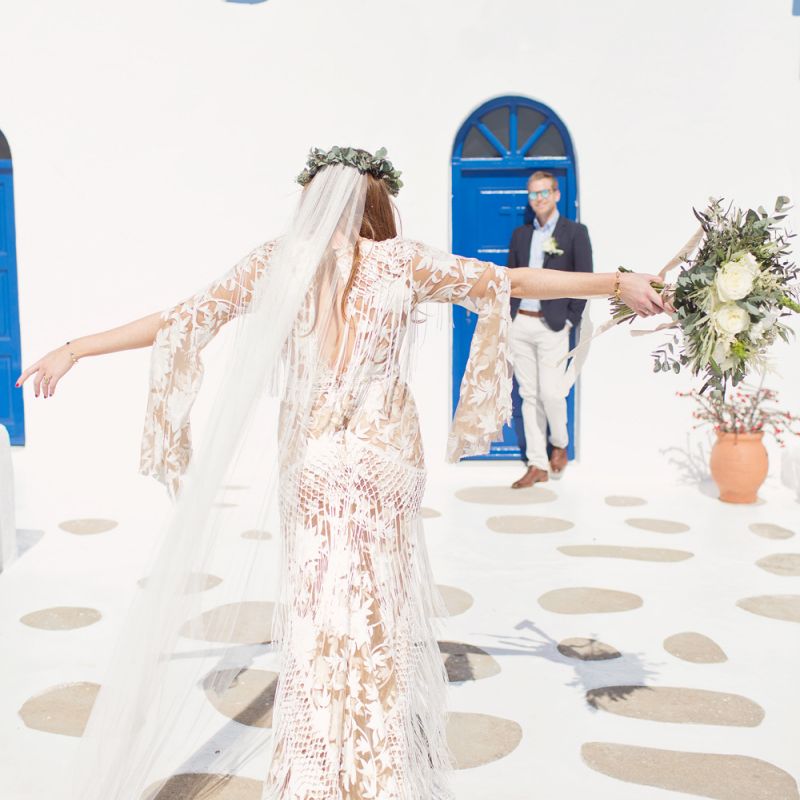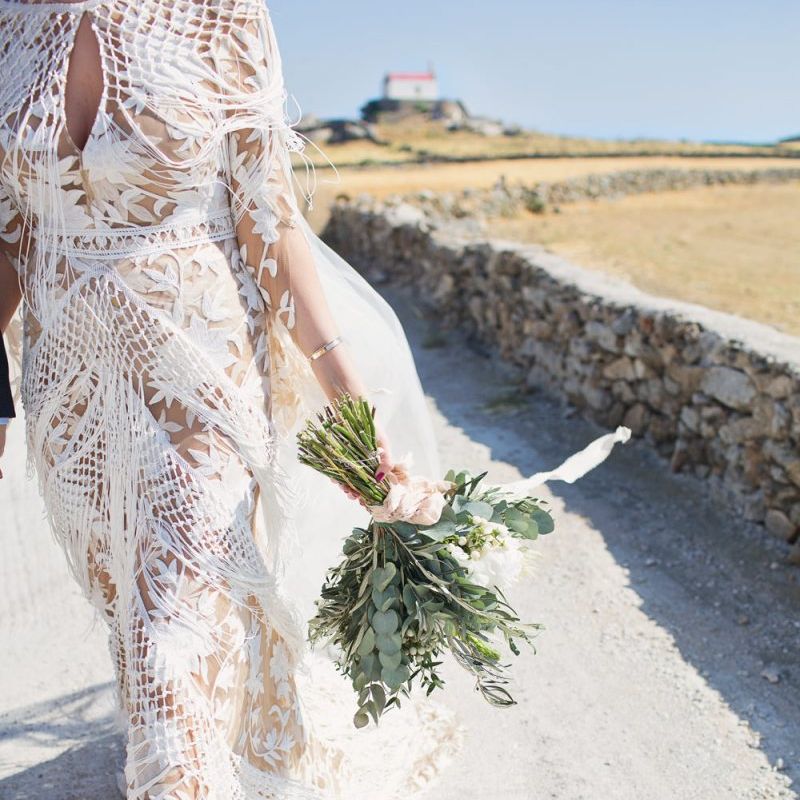 We wanted a very relaxed, untraditional style that encapsulated Mykonos Island’s vibe. Our rocky villas set in the cliffs overlooking the ocean set our scene, so our styling of neutral colours and bohemian accessories complimented this. My dress was also a big factor and the fringing inspired all the macramé elements. For the general atmosphere, we really wanted a relaxed holiday that our friends and family would love, not just a wedding day for us. The vibe for the whole week was incredible, everyone was so relaxed and had so much fun! We were all on such a high!