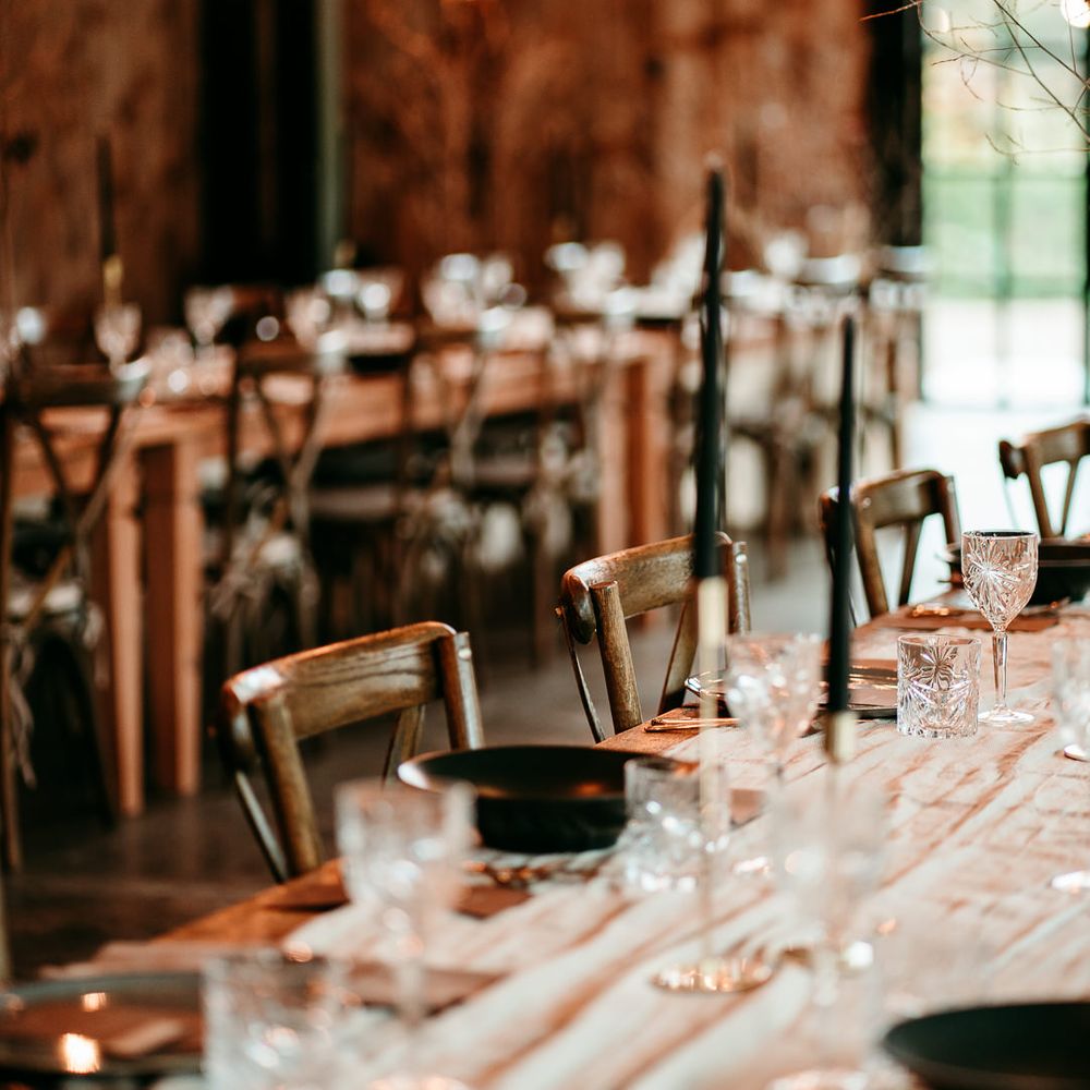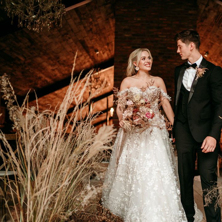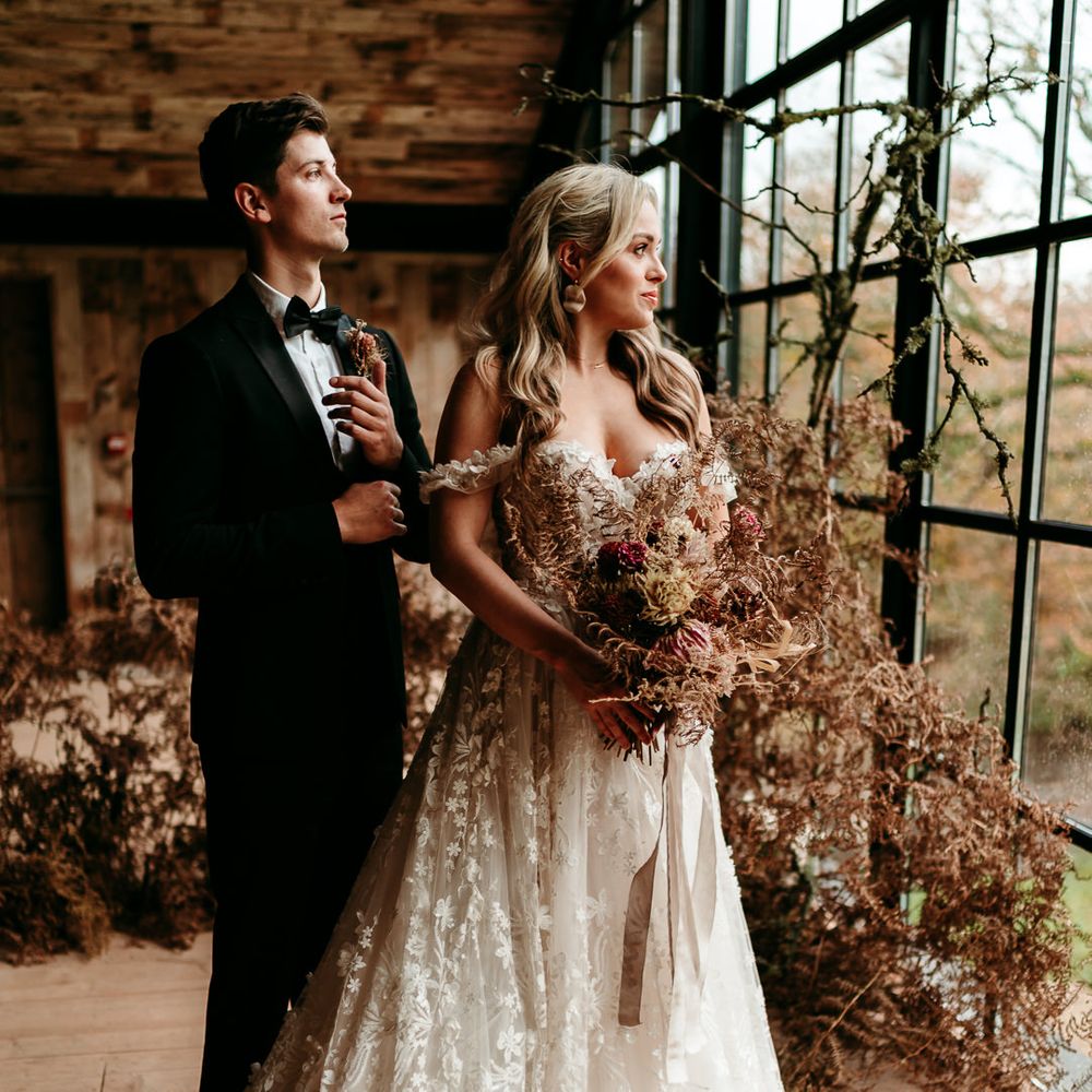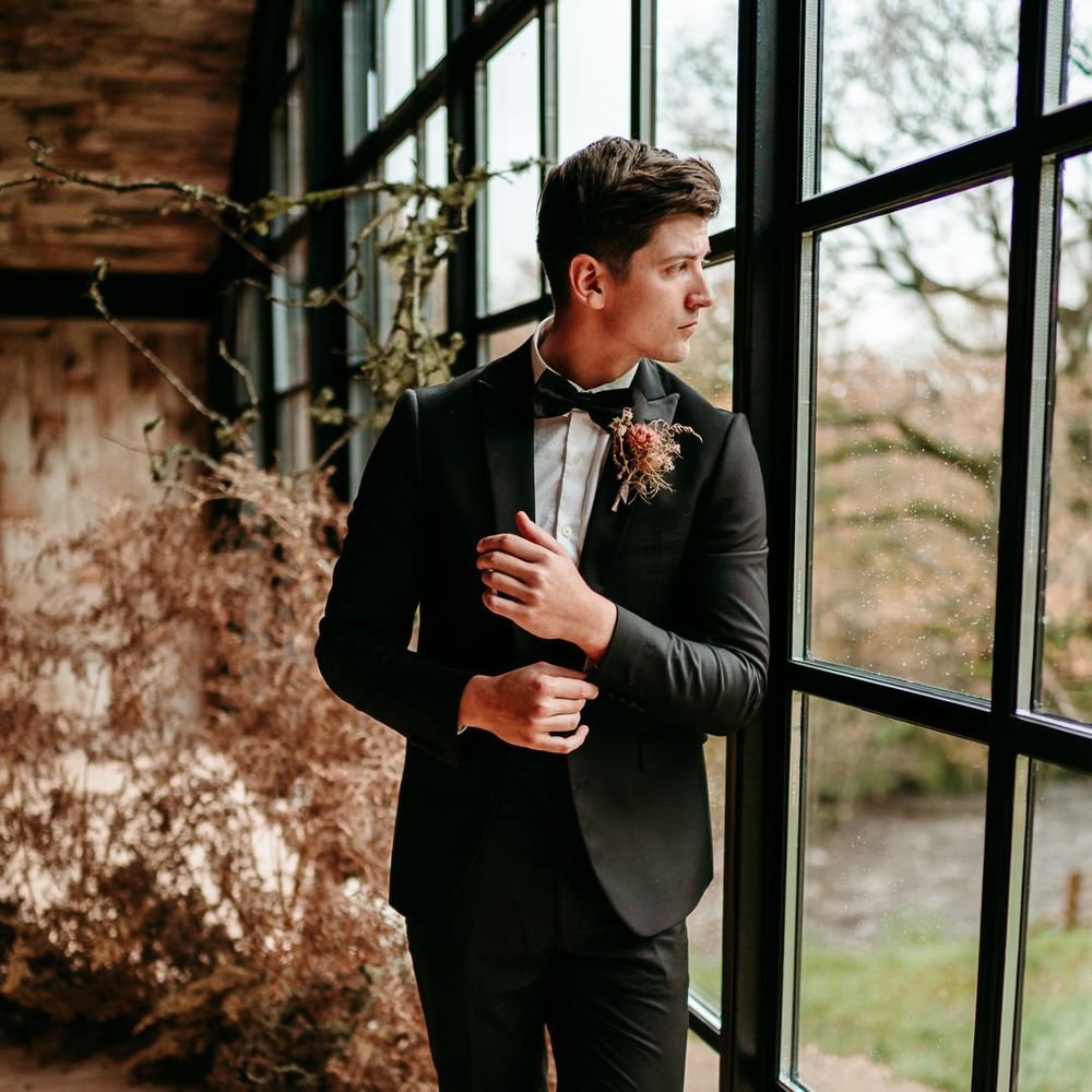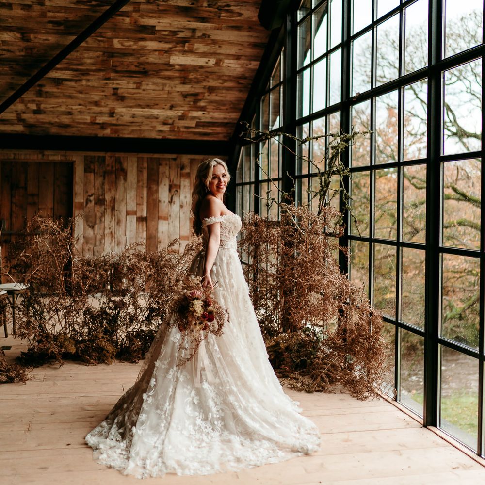 Hidden River is set in a beautifully untouched corner of the Cumbrian countryside along a winding river. The styling for the shoot at Hidden River was very much inspired by the venue and the season. The stylist wanted to incorporate the textures of dried materials and florals and show that a darker colour palette can be just as beautiful, in the right setting.