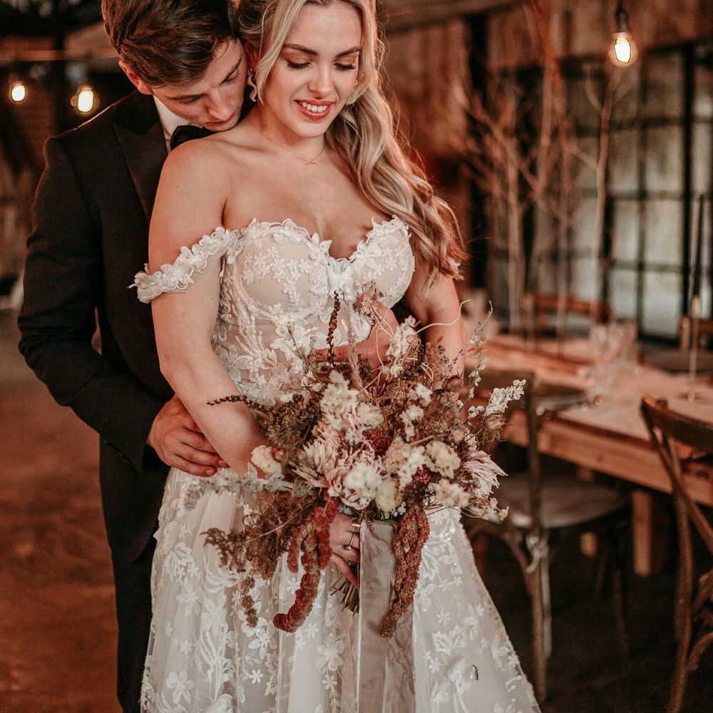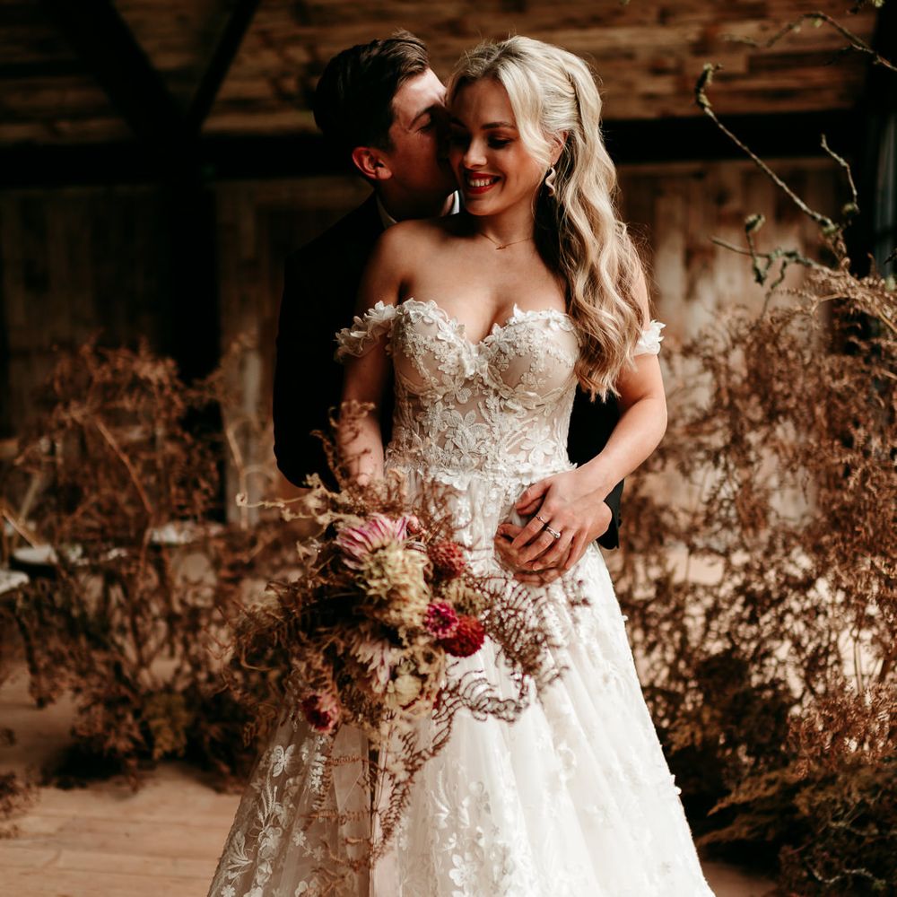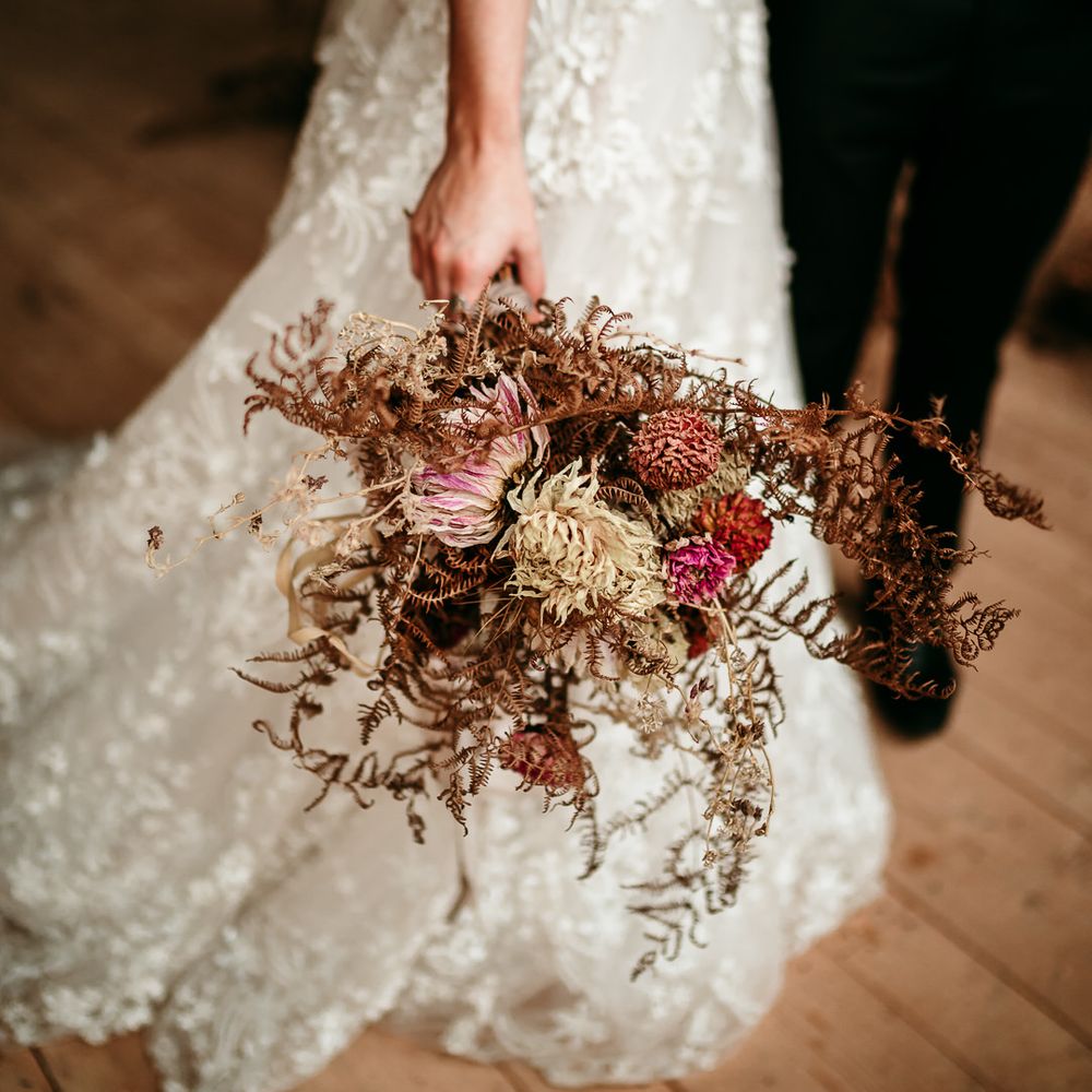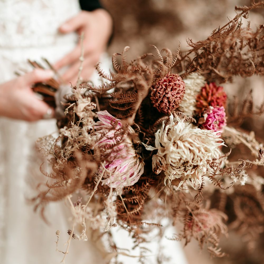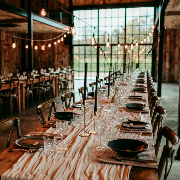 Hidden River is set in a beautifully untouched corner of the Cumbrian countryside along a winding river. The styling for the shoot at Hidden River was very much inspired by the venue and the season. The stylist wanted to incorporate the textures of dried materials and florals and show that a darker colour palette can be just as beautiful, in the right setting.