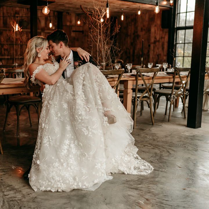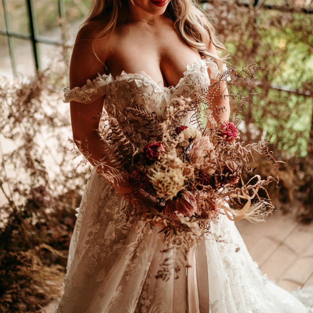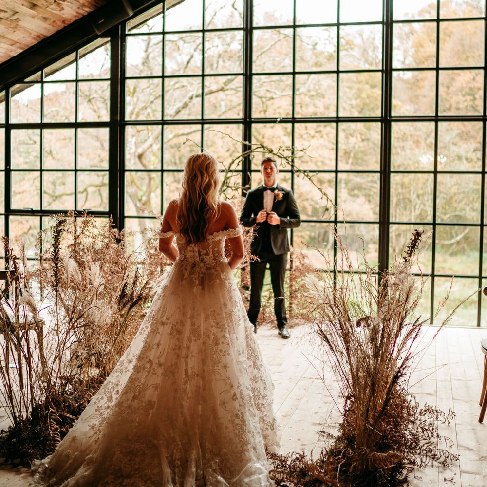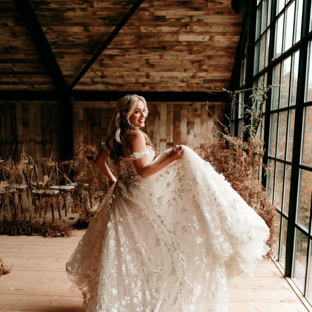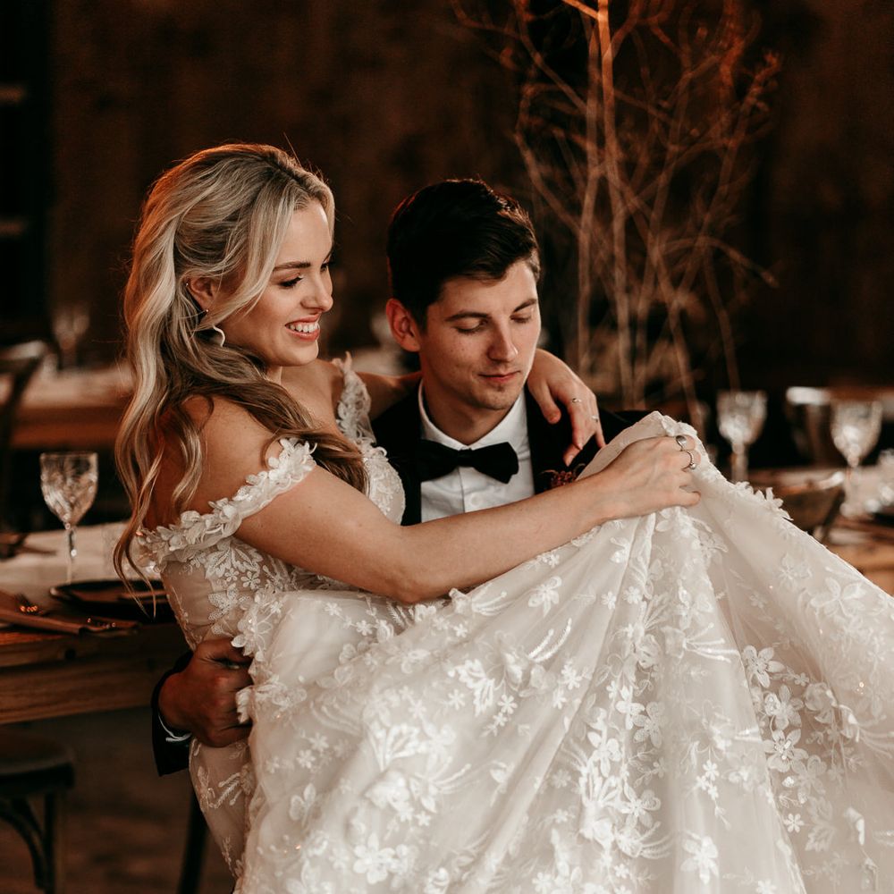 Hidden River is set in a beautifully untouched corner of the Cumbrian countryside along a winding river. The styling for the shoot at Hidden River was very much inspired by the venue and the season. The stylist wanted to incorporate the textures of dried materials and florals and show that a darker colour palette can be just as beautiful, in the right setting.