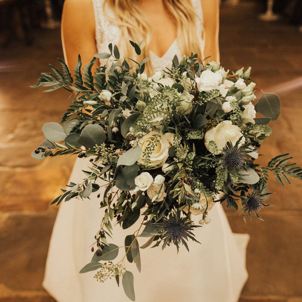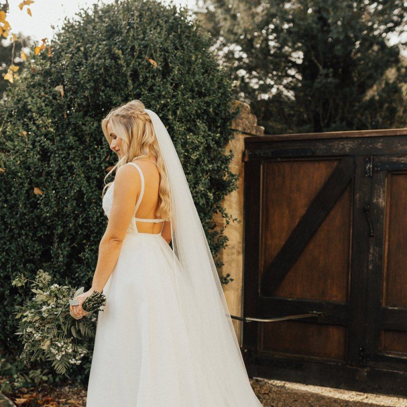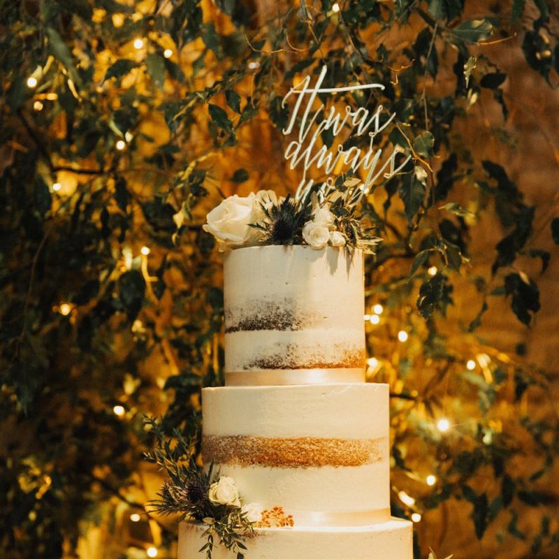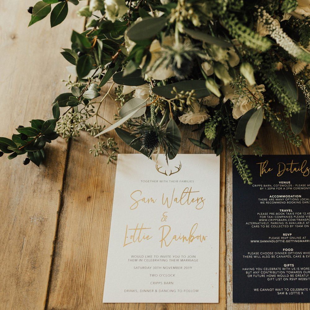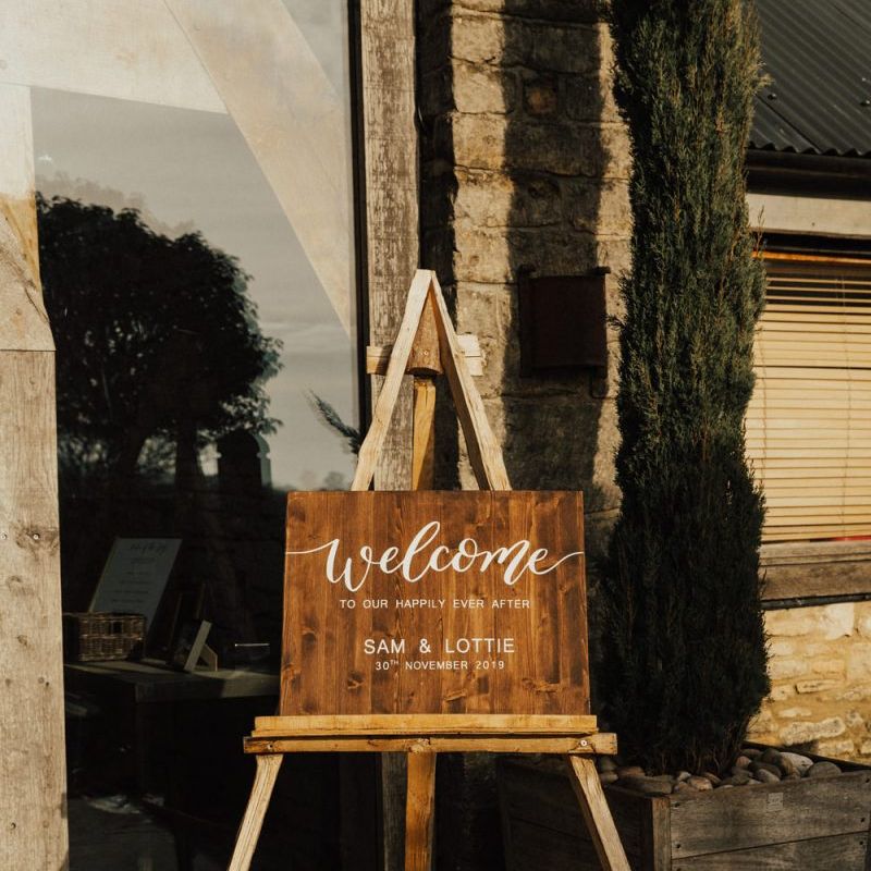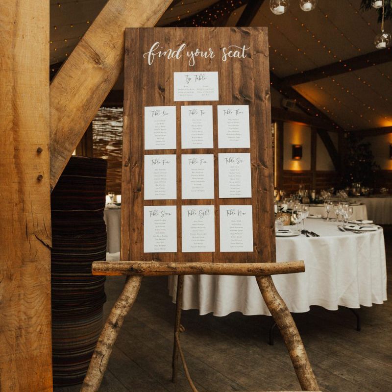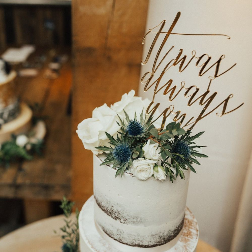 The vibe was rustic and MAGICAL. We wanted everyone to feel warm and cosy inside the barn - the decor/styling was rustic wood with golds and navy to match the bridesmaid dresses and stationery. Lots of candles, fairy lights and hanging tealights, along with a wood-burning fire, foliage wrapped beams and beautiful rustic bouquets with white flowers and blue thistles. The inspiration behind the styling was wanting to match the vibe of Cripps Barn itself but really bringing it to life with romantic, personal touches (lots of photo frames and homemade signs).