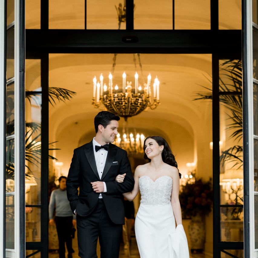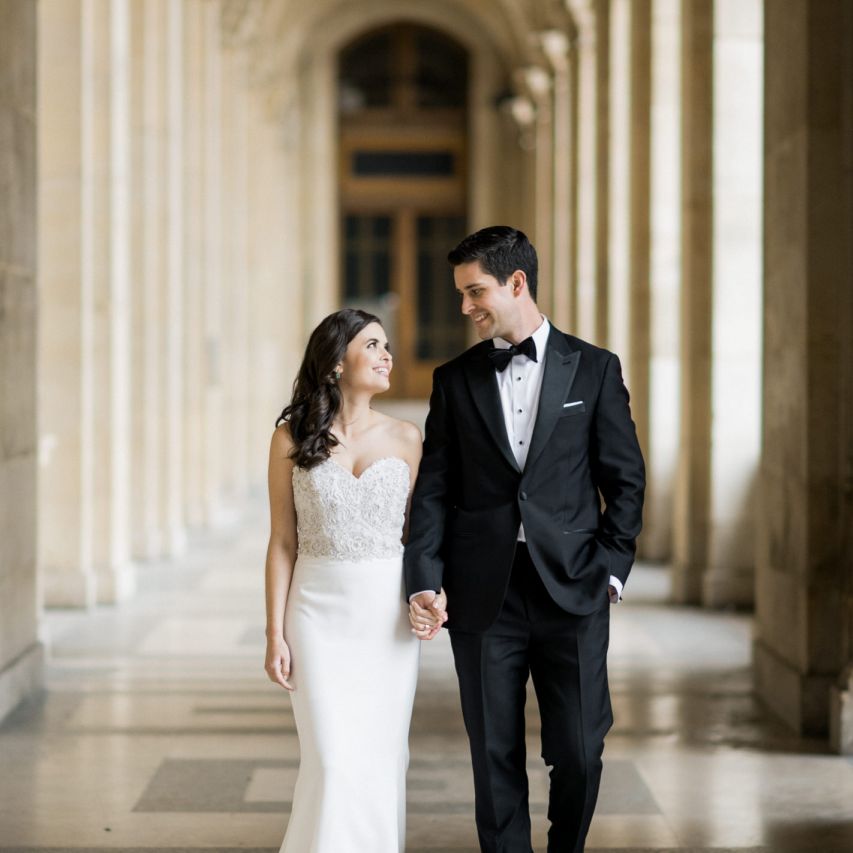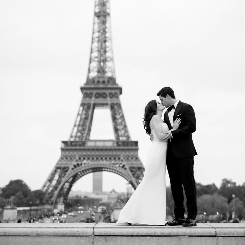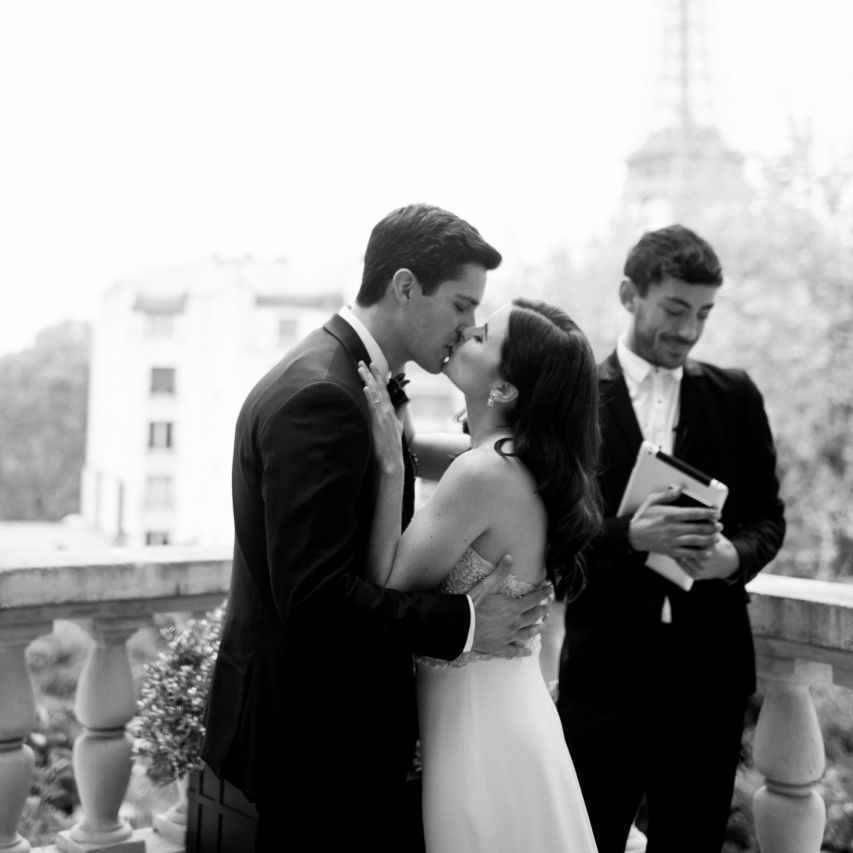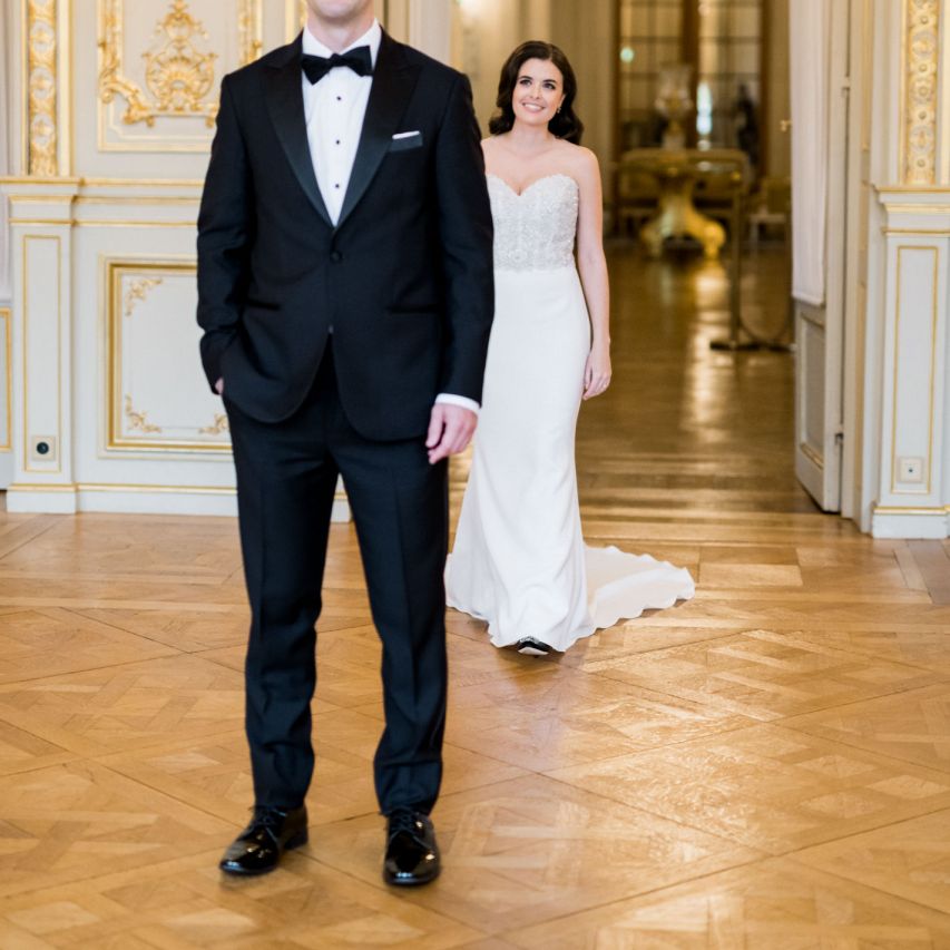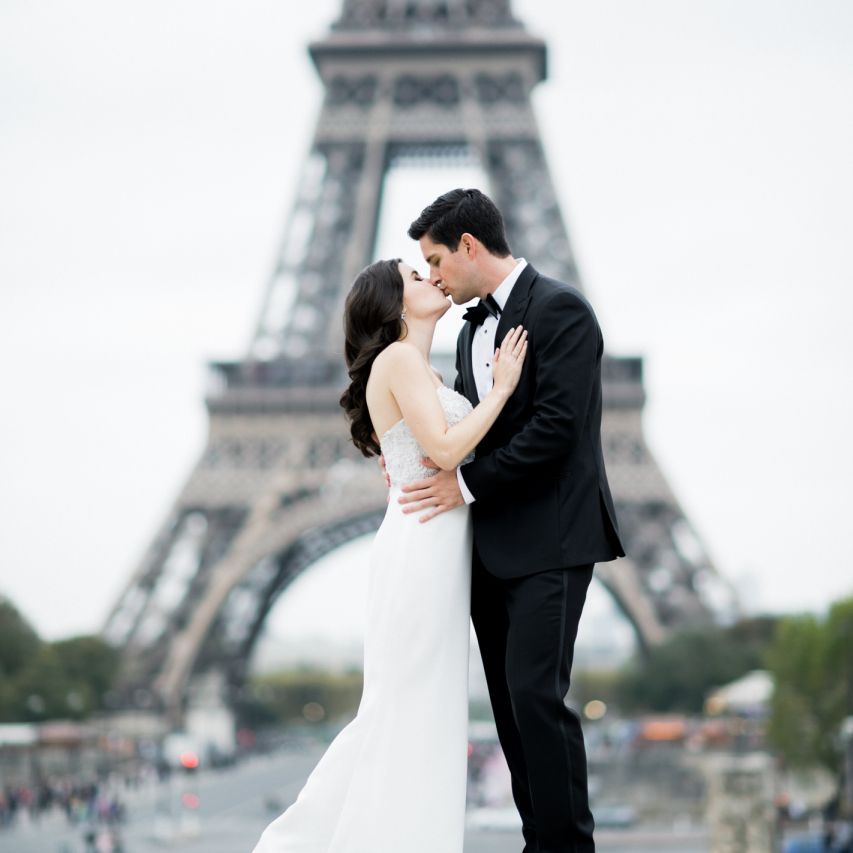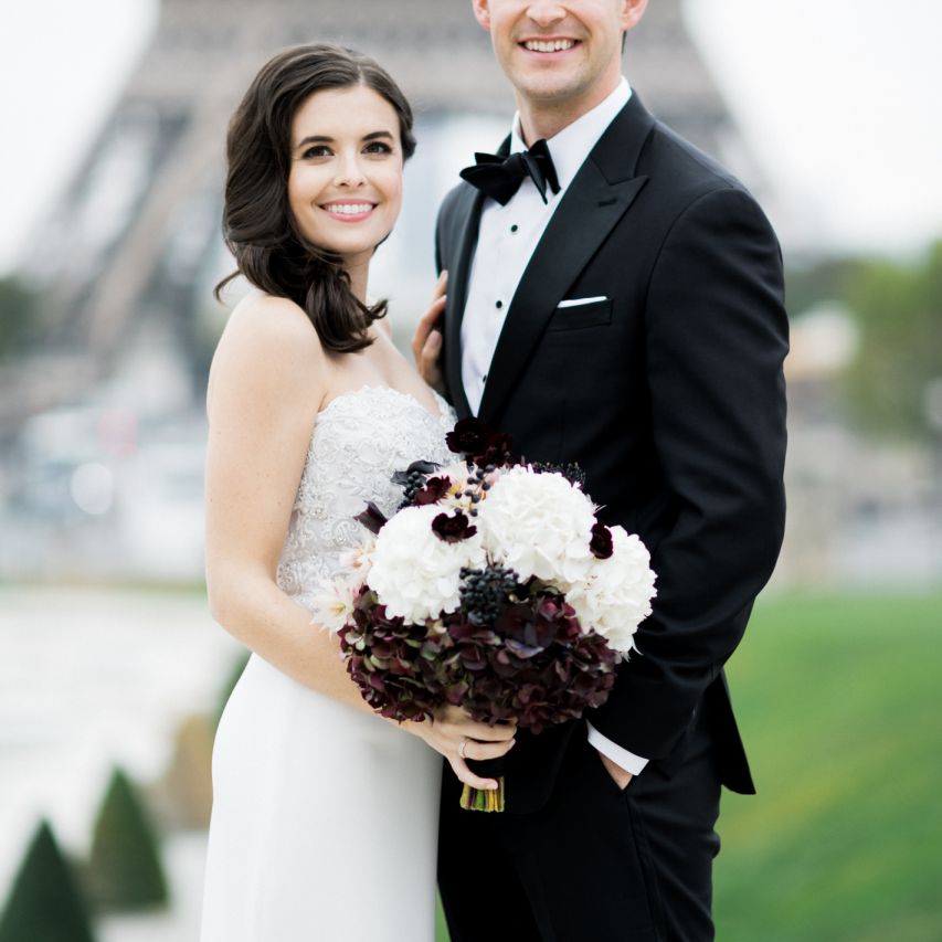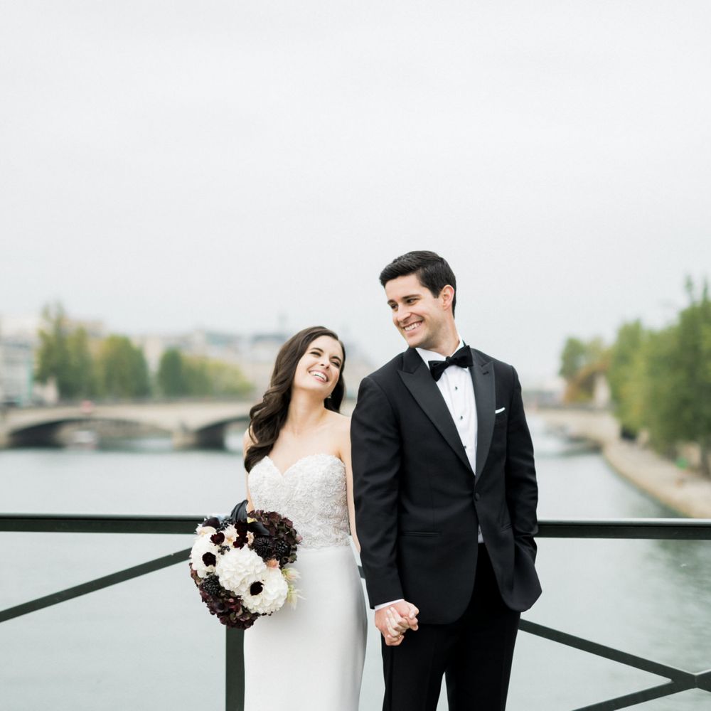 Although Paris is not known for being sunny in October, the days leading up to our wedding were unseasonably warm and absolutely gorgeous for that time of year. On our wedding day we woke up to overcast skies, wet weather, and a big drop in temperature, I was so down. Adam assured me it would be okay and we'd make the best of it. In the end, it turned out better than okay. The rain cleared up just in time for pictures around the city and ready for our outdoor ceremony. For dinner, we had originally planned to be served outside on the terrace but it was moved inside into the Shangri-La's incredible Grand Salon. We ended up having the entire space to ourselves and it truly could not have been a more magical setting. - Brooke & Adam