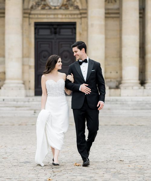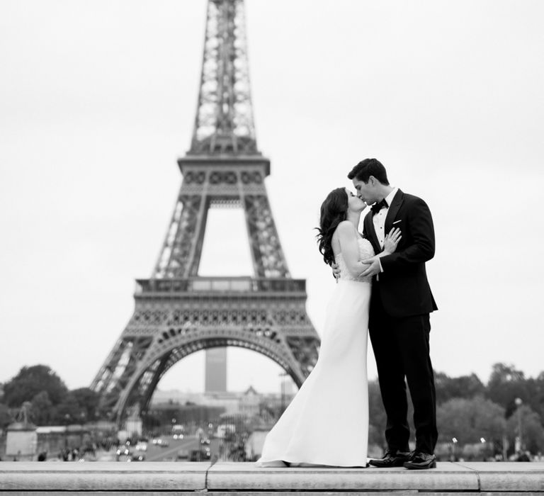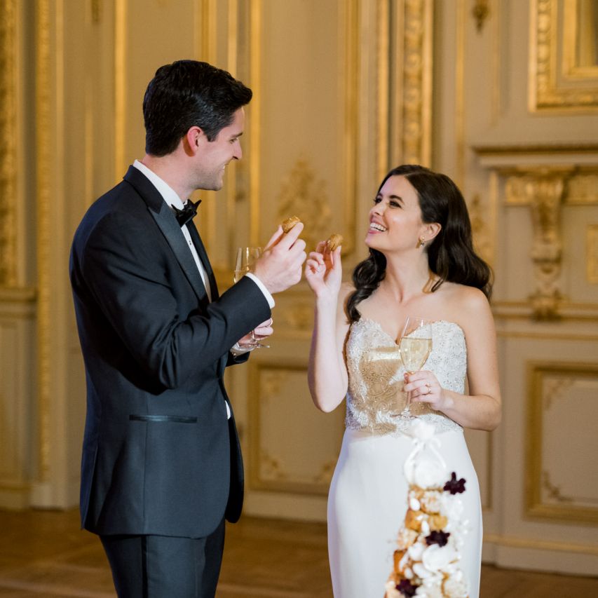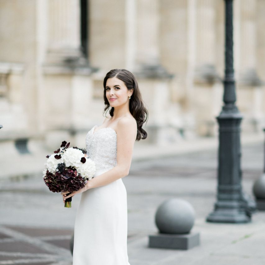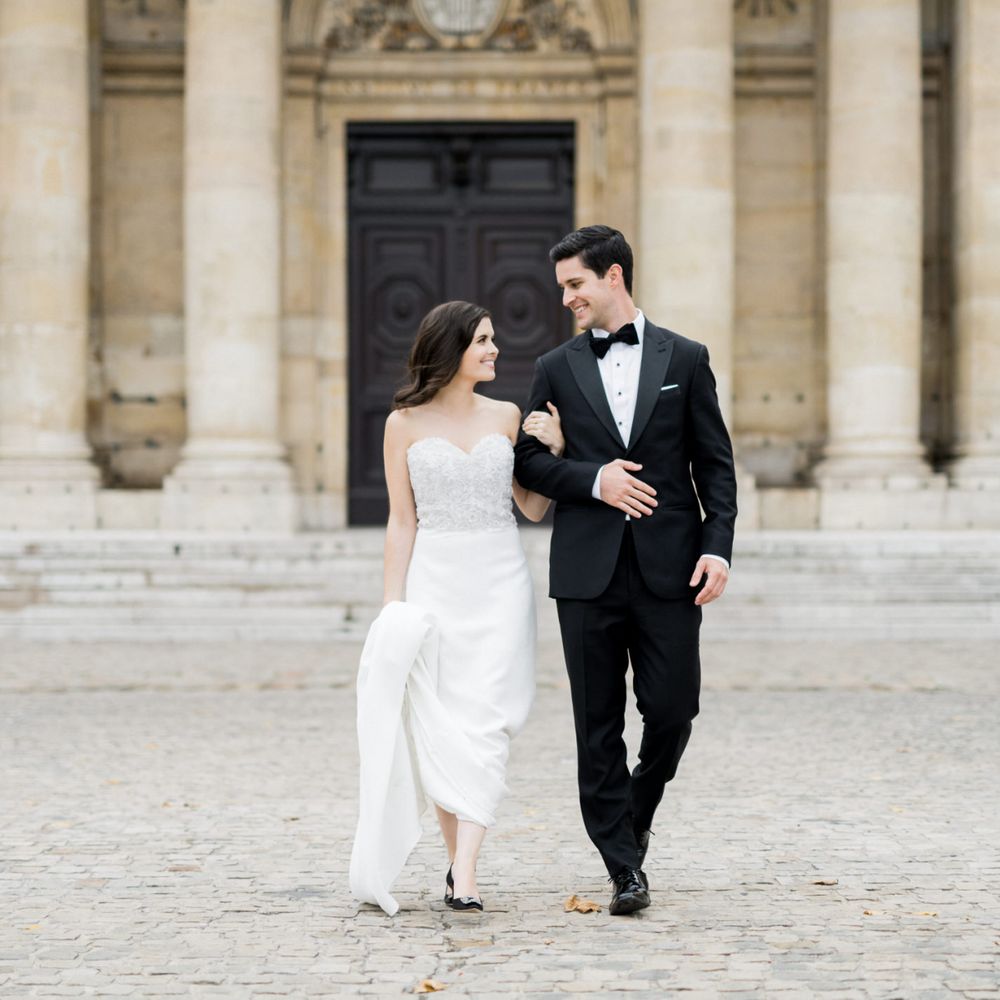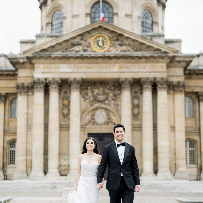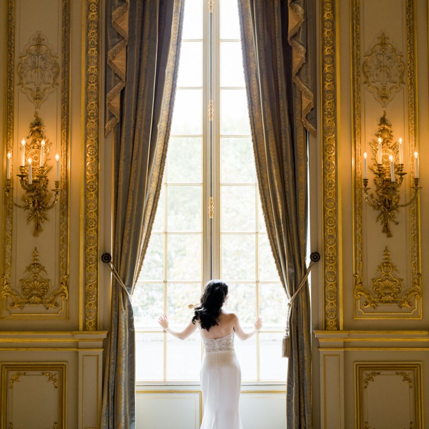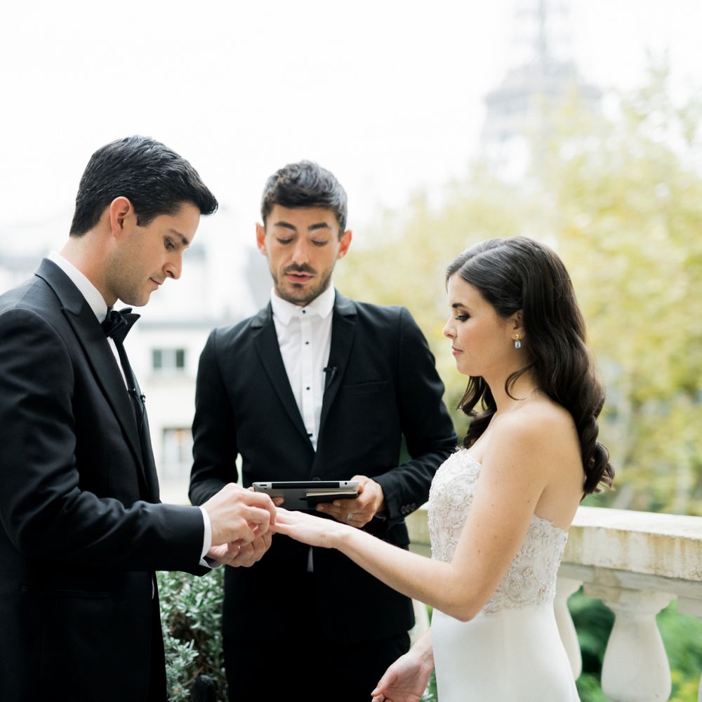 Although Paris is not known for being sunny in October, the days leading up to our wedding were unseasonably warm and absolutely gorgeous for that time of year. On our wedding day we woke up to overcast skies, wet weather, and a big drop in temperature, I was so down. Adam assured me it would be okay and we'd make the best of it. In the end, it turned out better than okay. The rain cleared up just in time for pictures around the city and ready for our outdoor ceremony. For dinner, we had originally planned to be served outside on the terrace but it was moved inside into the Shangri-La's incredible Grand Salon. We ended up having the entire space to ourselves and it truly could not have been a more magical setting. - Brooke & Adam
