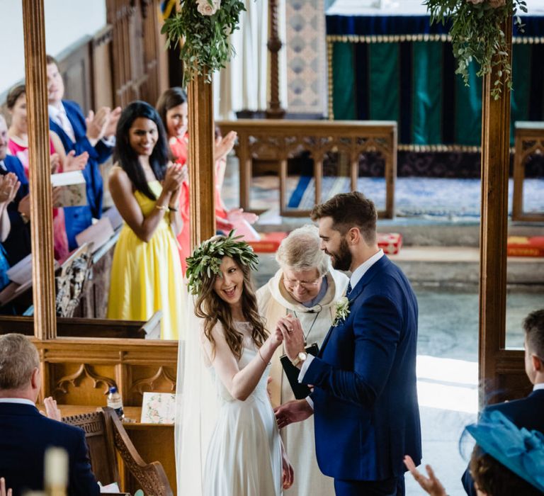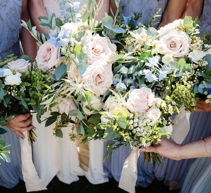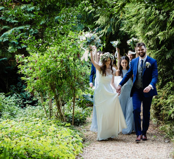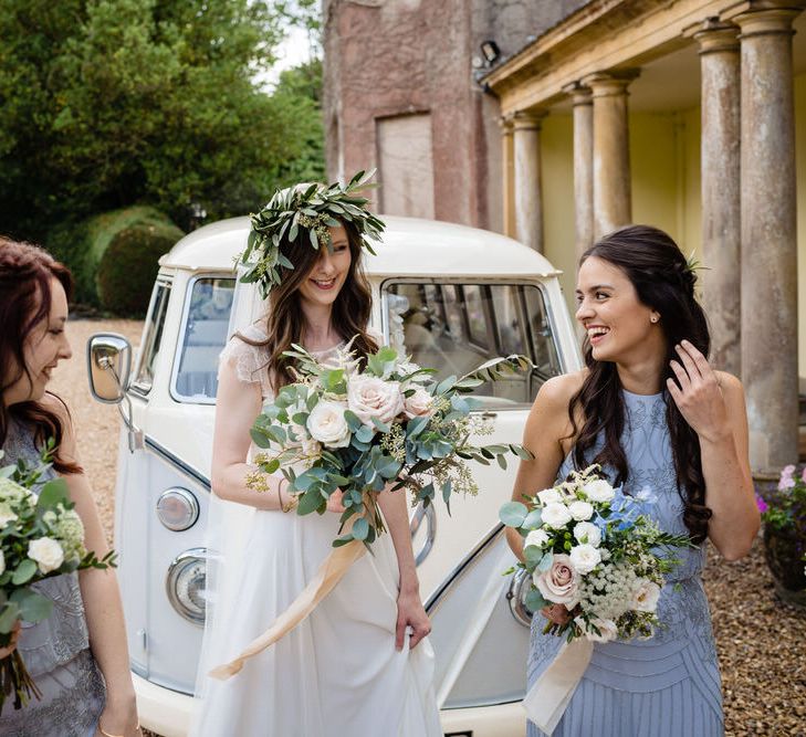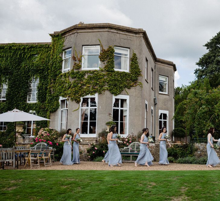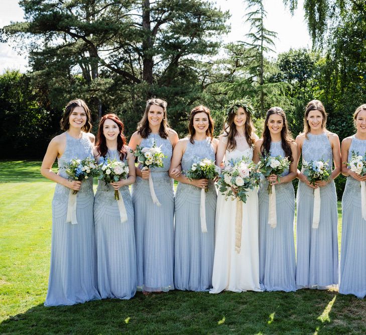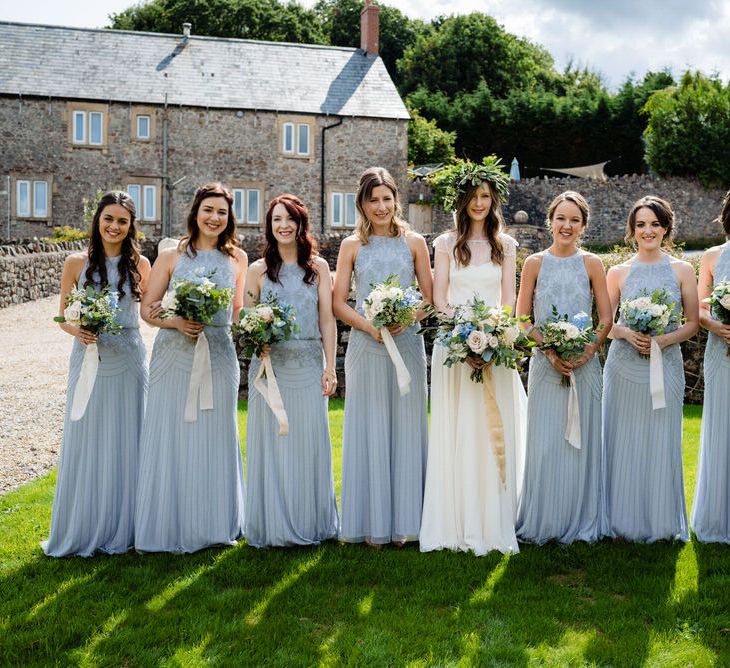 I found my wedding dress at Perfect Day Bridal in Bradford Upon Avon. The shop is beautiful and the girls who work there made me, my Mum and Granny feel so welcome! I chose a Charlie Brear dress with a separate French lace top and cathedral length veil. I wore my Mum’s rose gold bracelet, which she wore on her wedding day and Bob’s Mum bought me gold earrings. With eight bridesmaids – I originally thought I would get the girls to choose their own dresses in a similar shade and then found these dresses from Monsoon which they all loved and looked amazing in!