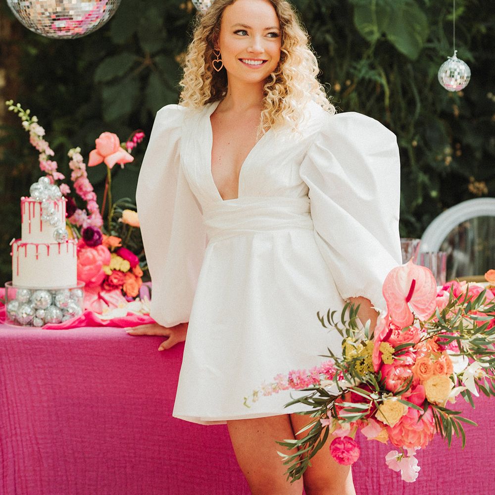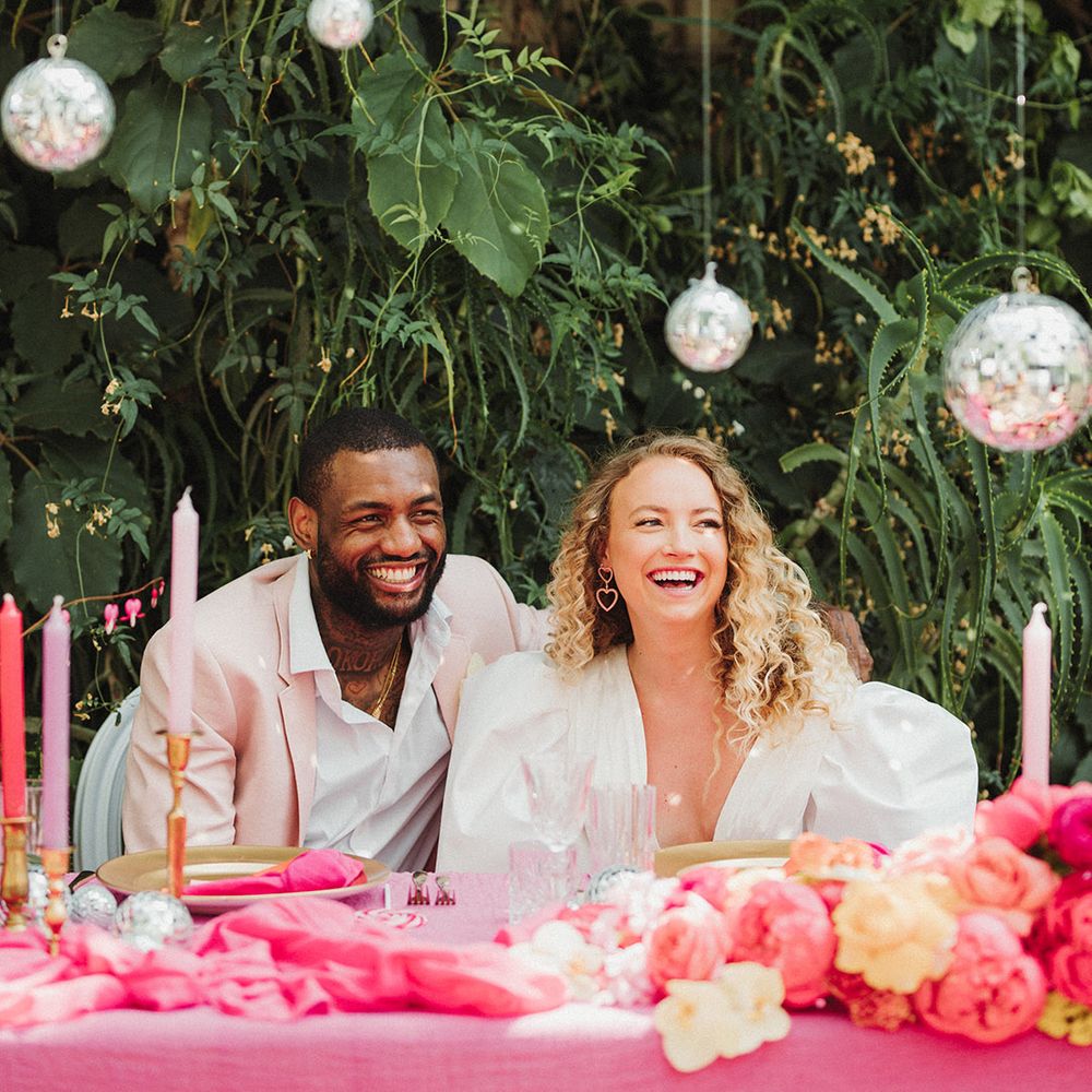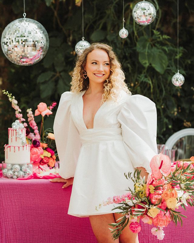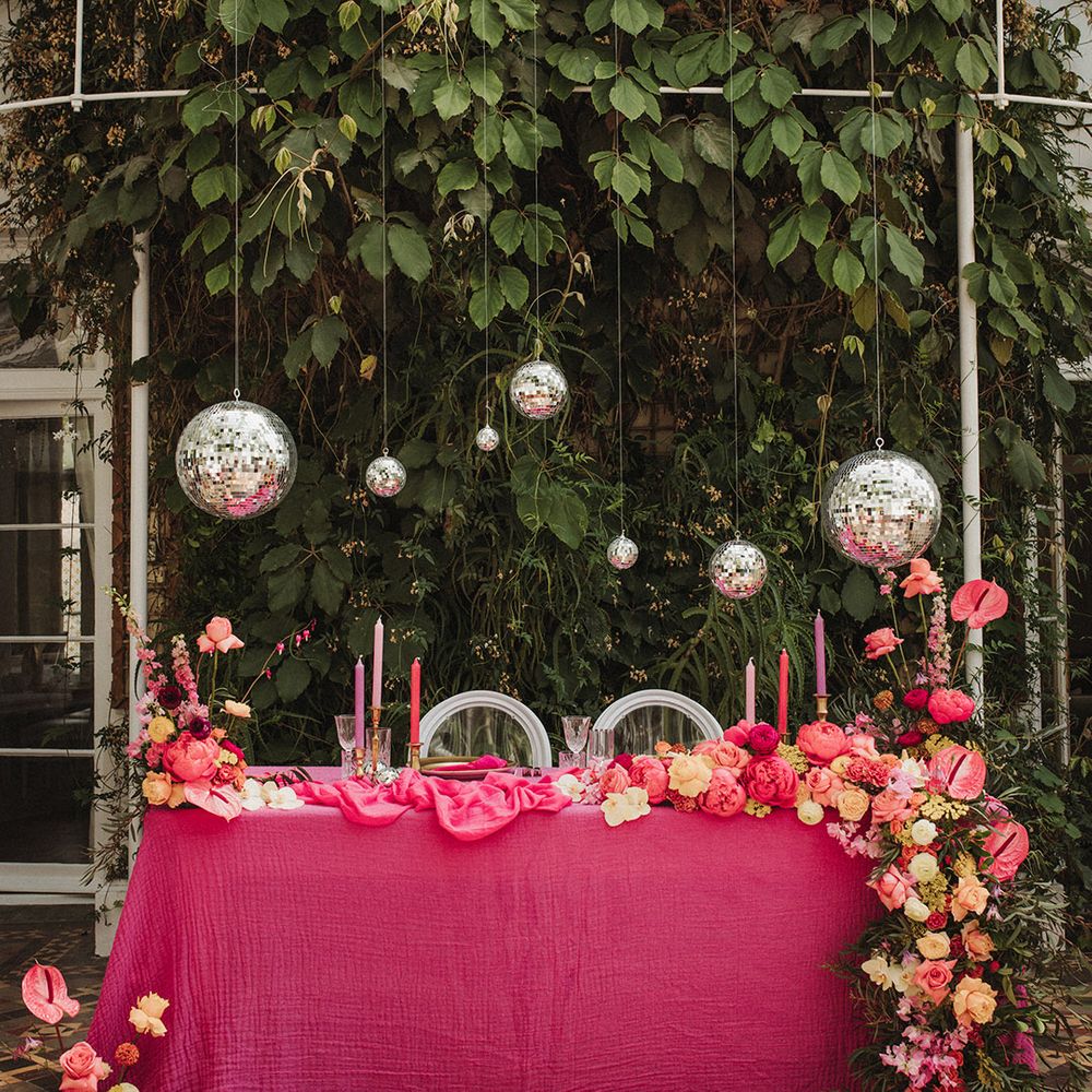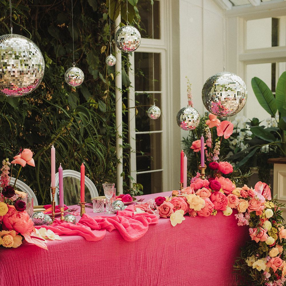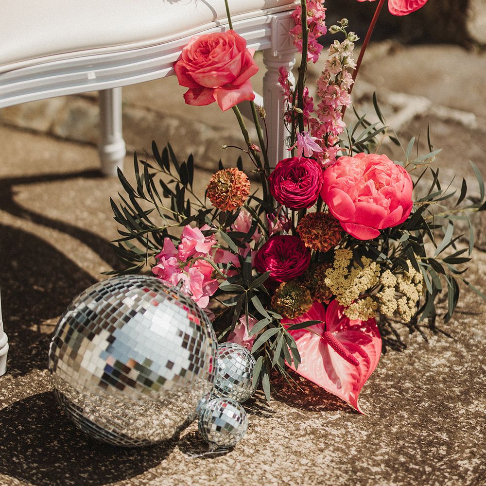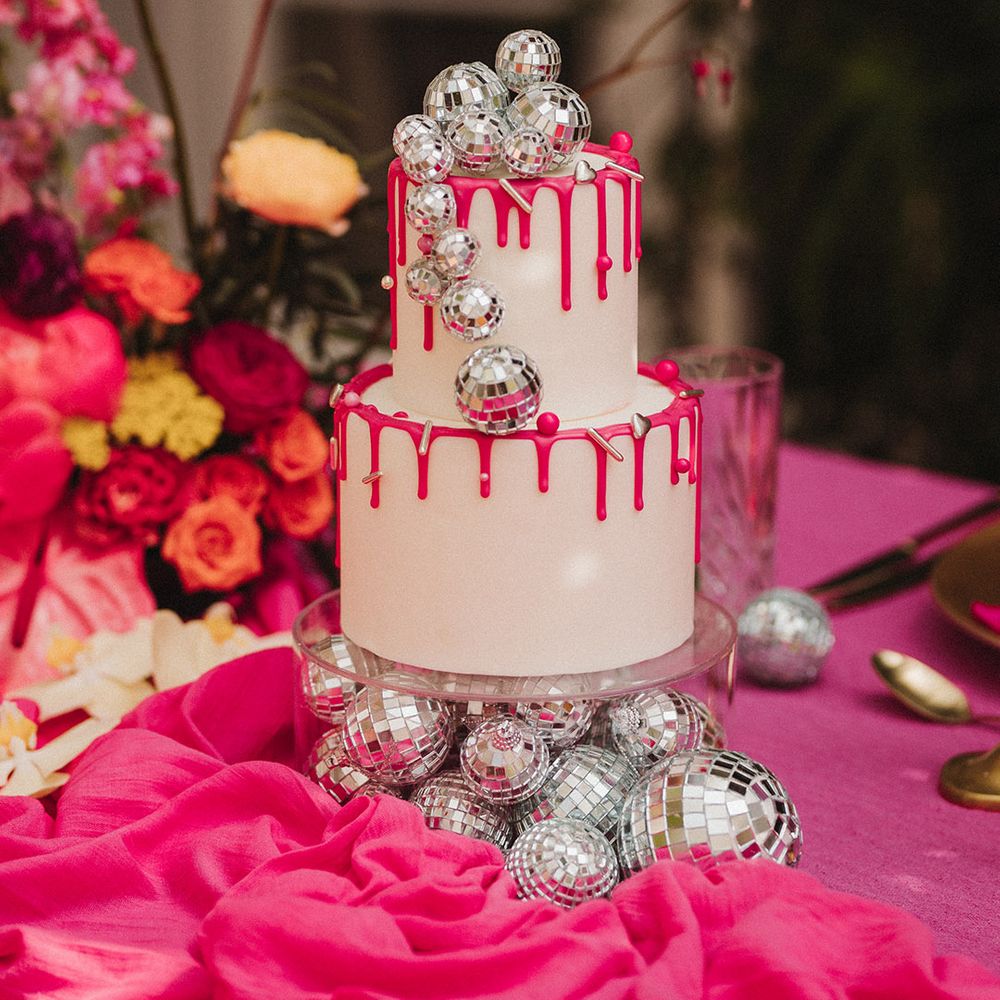 We included disco balls in our table set-up and biodegradable confetti canons full of colour for that extra wow factor. The wedding cake also reflected the style of the shoot with disco balls and bright pink colouring.