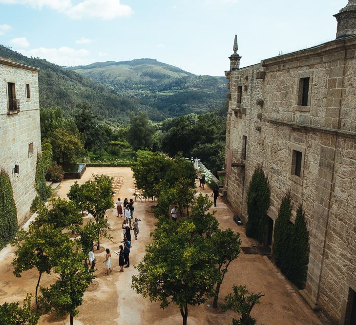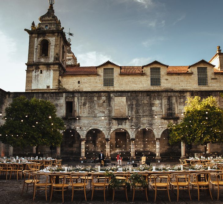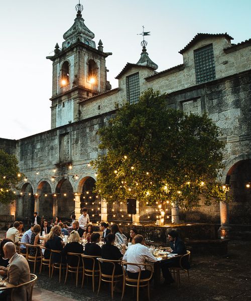 The vibe was influenced by the Portuguese people and their hospitality. They are so warm/lively and friendly and the food is incredible. We could really feel that the staff at the Pousada wanted us to be well-fed, have a great time, and party. This meant that despite the surreal and luxurious setting, everyone felt comfortable and almost at home. The Pousada’s majestic buildings and surrounds, thanks to the elegant restoration, did all the work for us - it only needed minimal styling. We used the Pousada’s beautiful Thonet chairs for both the ceremony and the reception. The main styling element we added was the lighting in the cloisters. The dress code was formal but we left it open to creative freedom. Because it was in the middle of a hot Portuguese summer we saw lots of beautiful, colourful outfits which really added to the setting and aesthetics. Everyone looked so beautiful.