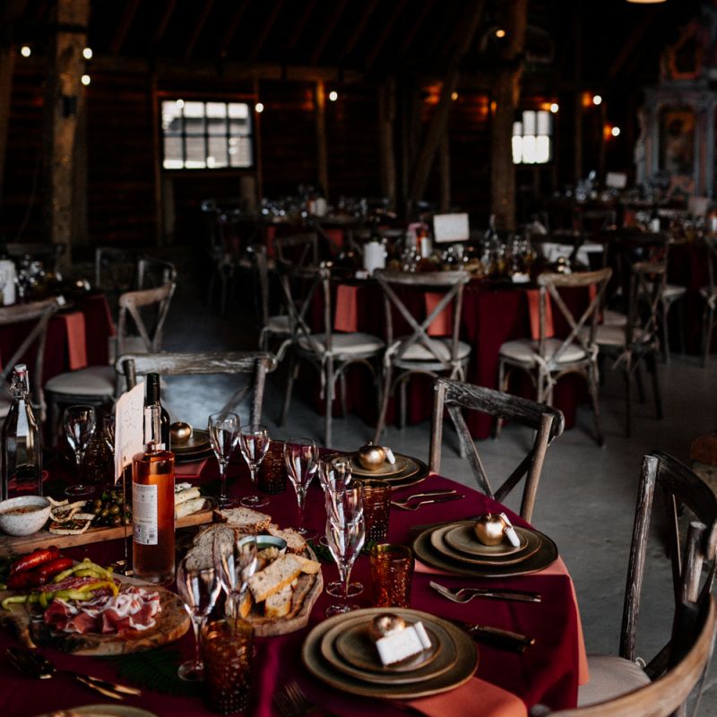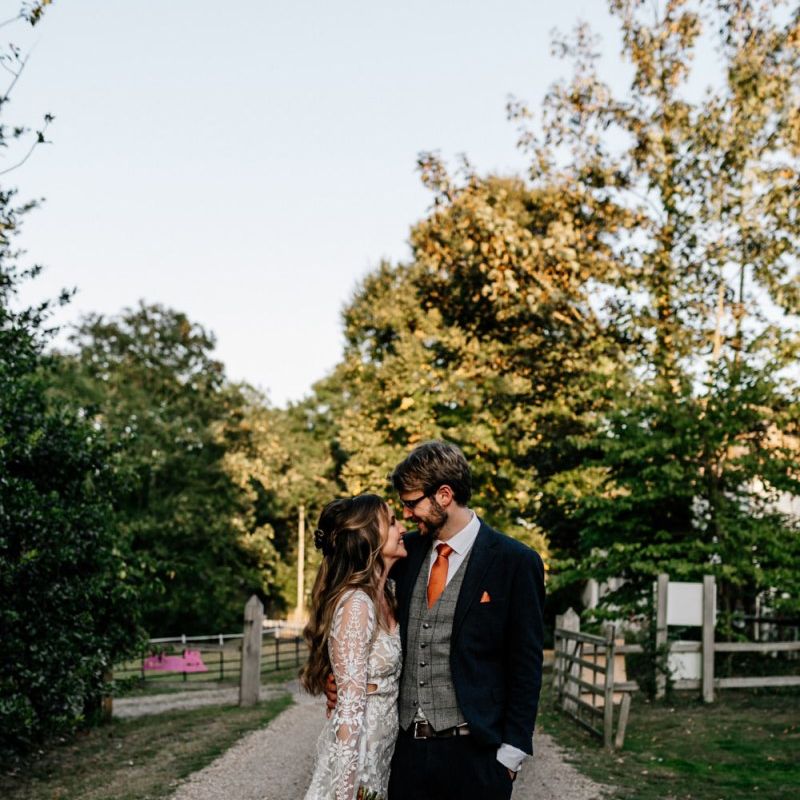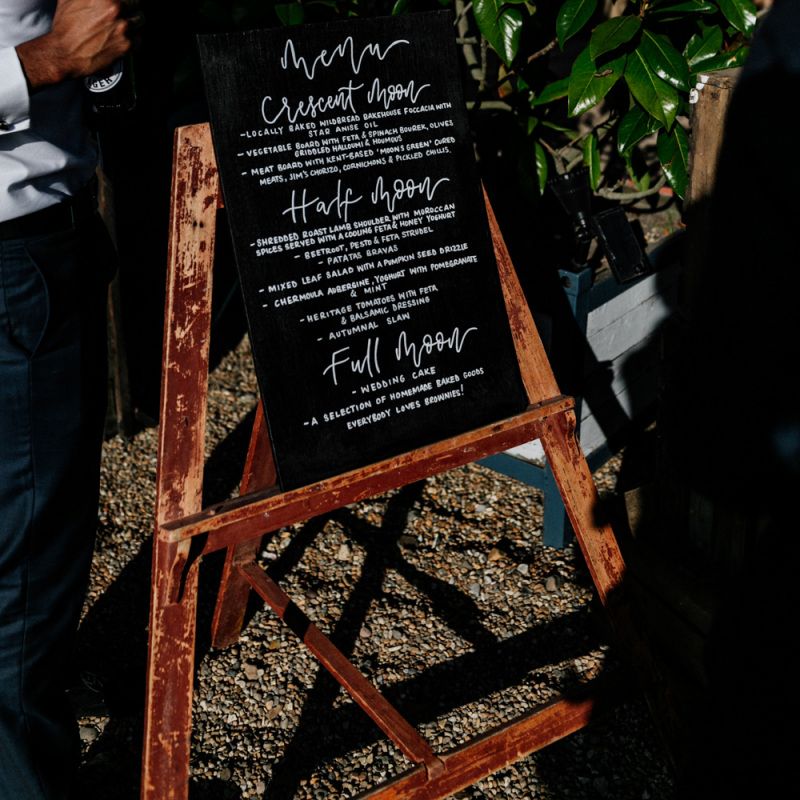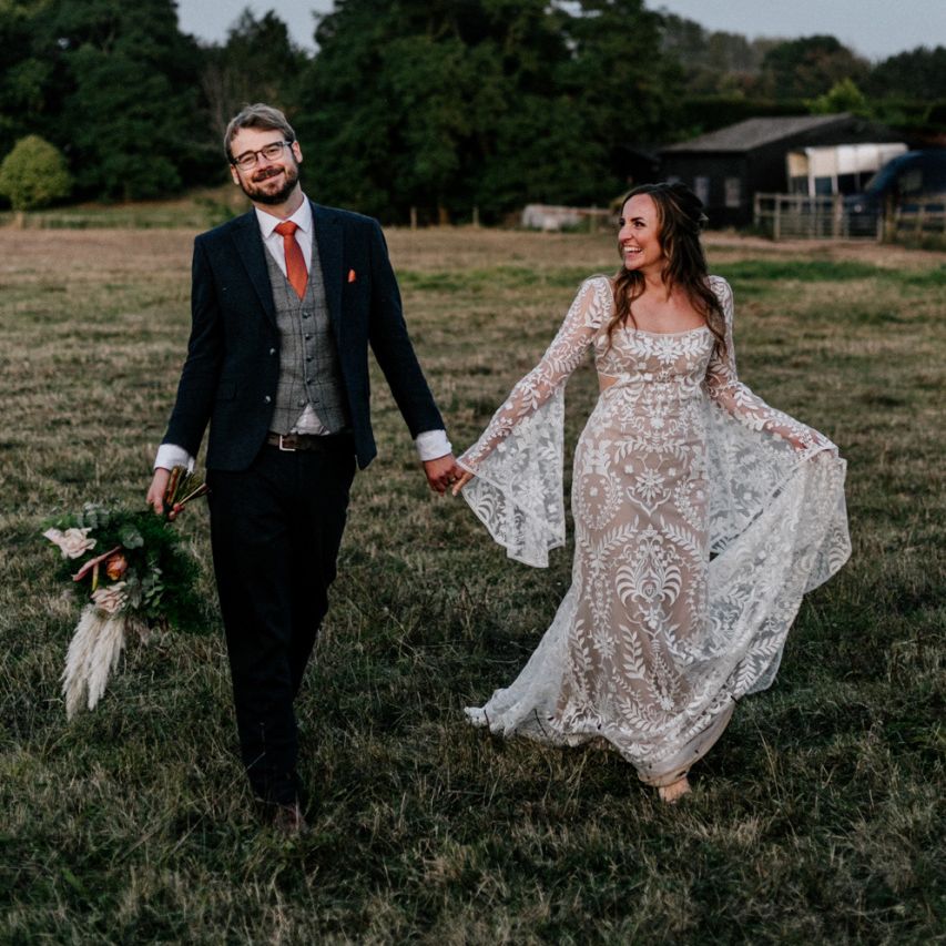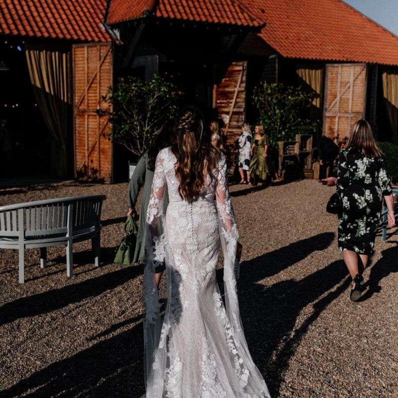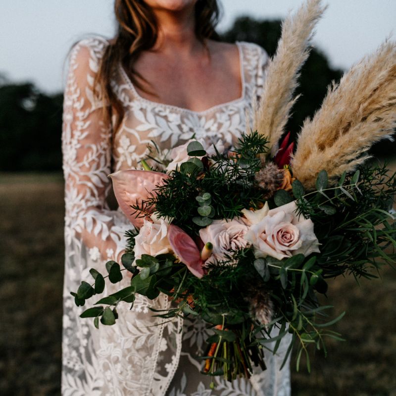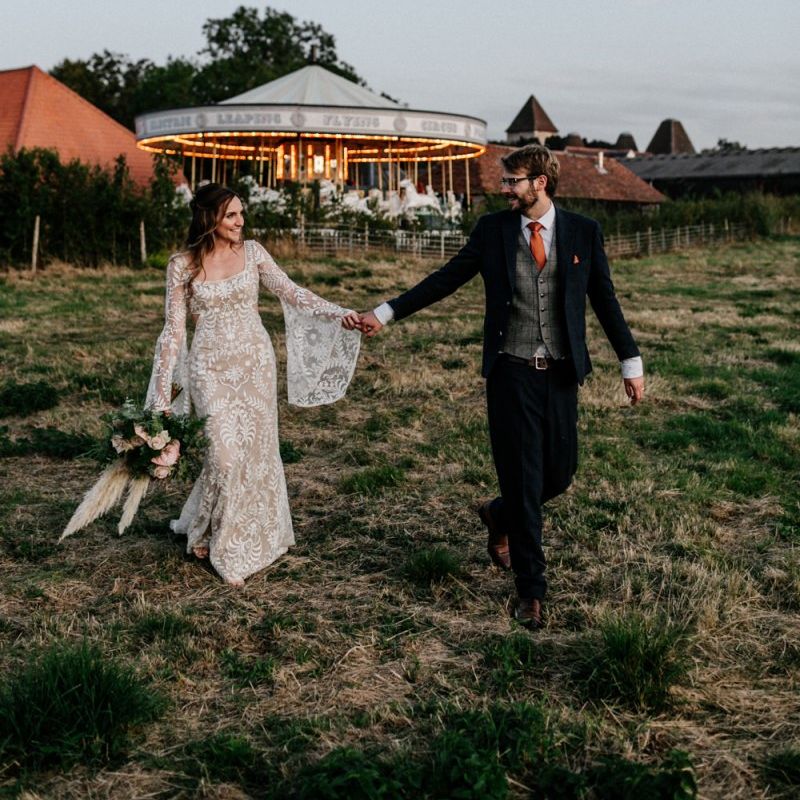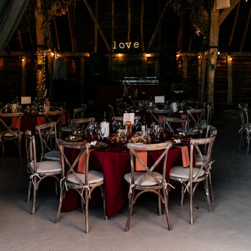 Many of the guests at our wedding made the journey to Kent from abroad or from other parts of the country- we wanted them to come and experience the best of Kent in September. We worked with our caterer to create a menu which showcased local and seasonal ingredients such as locally baked bread, smoked fish and cheeses. For the toasts, we used a sparkling wine produced down the road from the venue. We also used an autumnal colour palette with shades of burgundy, burnt orange, and peach. We hired Persian rugs, macrame chandeliers and had plenty of pampas grass to keep the space looking rustic and bohemian.