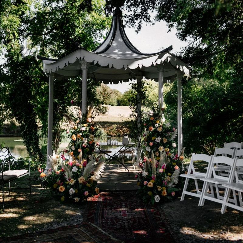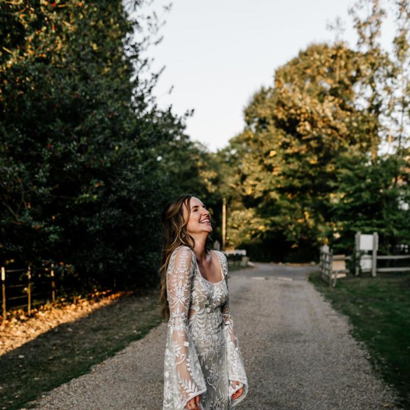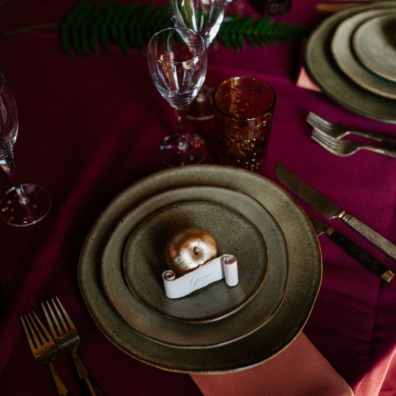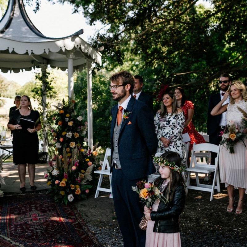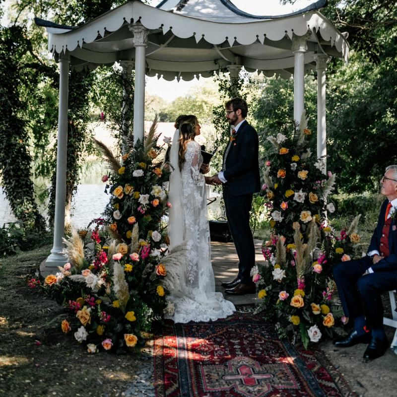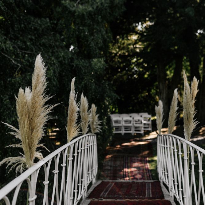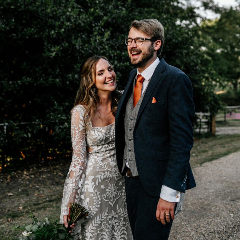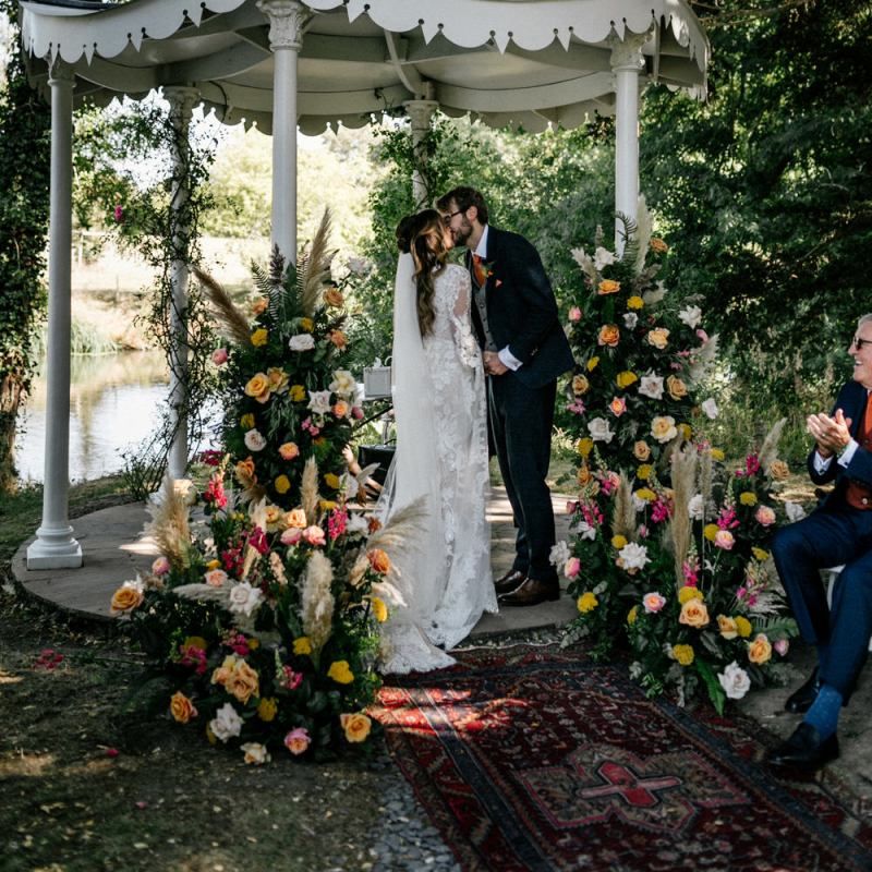 Many of the guests at our wedding made the journey to Kent from abroad or from other parts of the country- we wanted them to come and experience the best of Kent in September. We worked with our caterer to create a menu which showcased local and seasonal ingredients such as locally baked bread, smoked fish and cheeses. For the toasts, we used a sparkling wine produced down the road from the venue. We also used an autumnal colour palette with shades of burgundy, burnt orange, and peach. We hired Persian rugs, macrame chandeliers and had plenty of pampas grass to keep the space looking rustic and bohemian.
