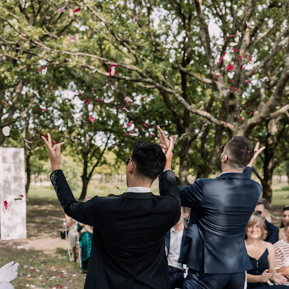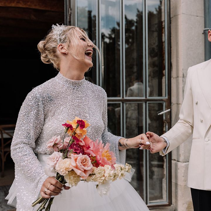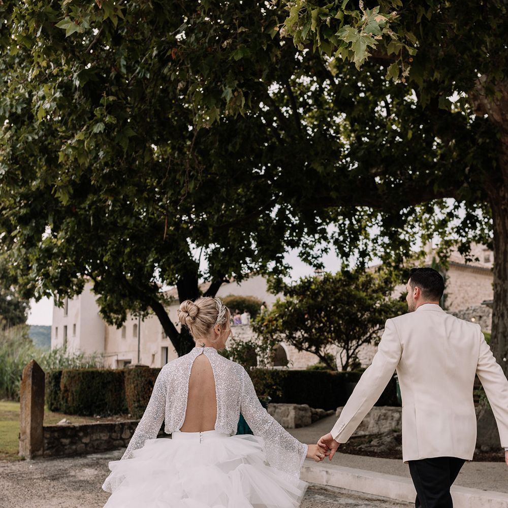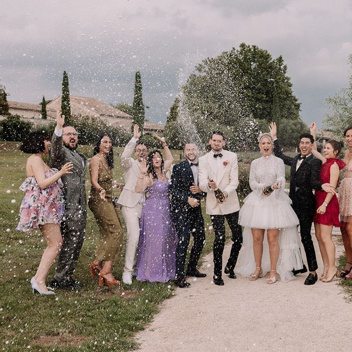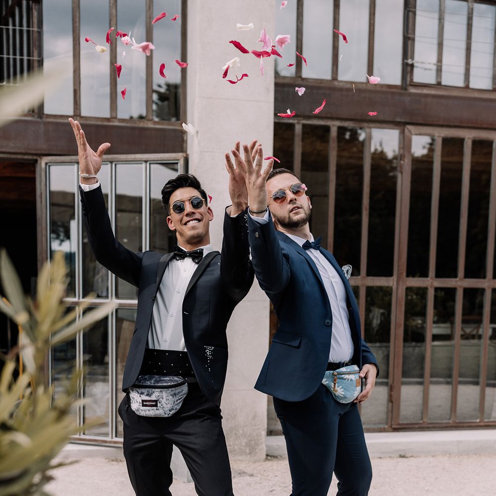 Alix & Raphaël chose to celebrate their wedding day in one of the most memorable ways by choosing The Domaines de Patras for their venue. Built in 1735, the Estate was once a holiday resort for the last kings of France before it was a coaching inn after the Revolution. Completely renovated ten years ago, the Estate has used its luxurious history to show off pure luxurious Provençal tradition. With stunning sparkly bridal separates, an epic champagne spray and iconic flower men, Alix & Raphaël completely nailed the balance of luxury and glamour while still being modern and relaxed. One epic DIY project we have to mention is that the couple wrote their names across many pink heart-shaped sunglasses for the wedding reception, which made for some truly iconic wedding photos!