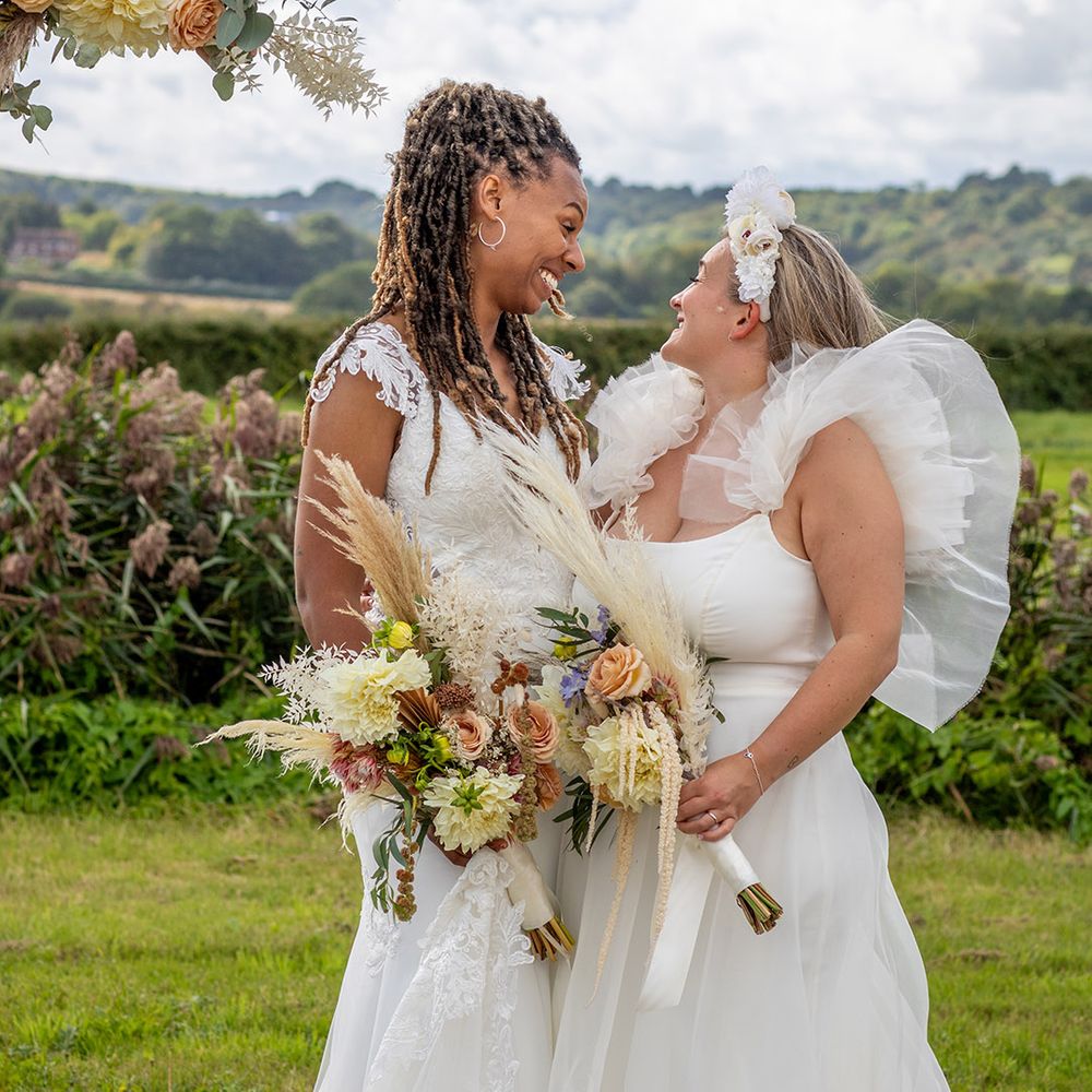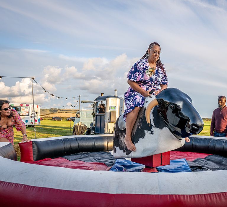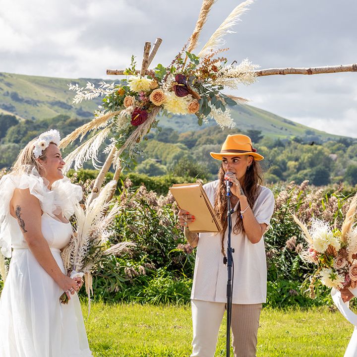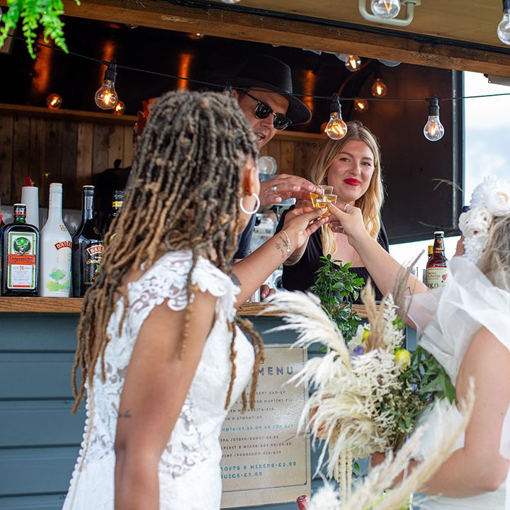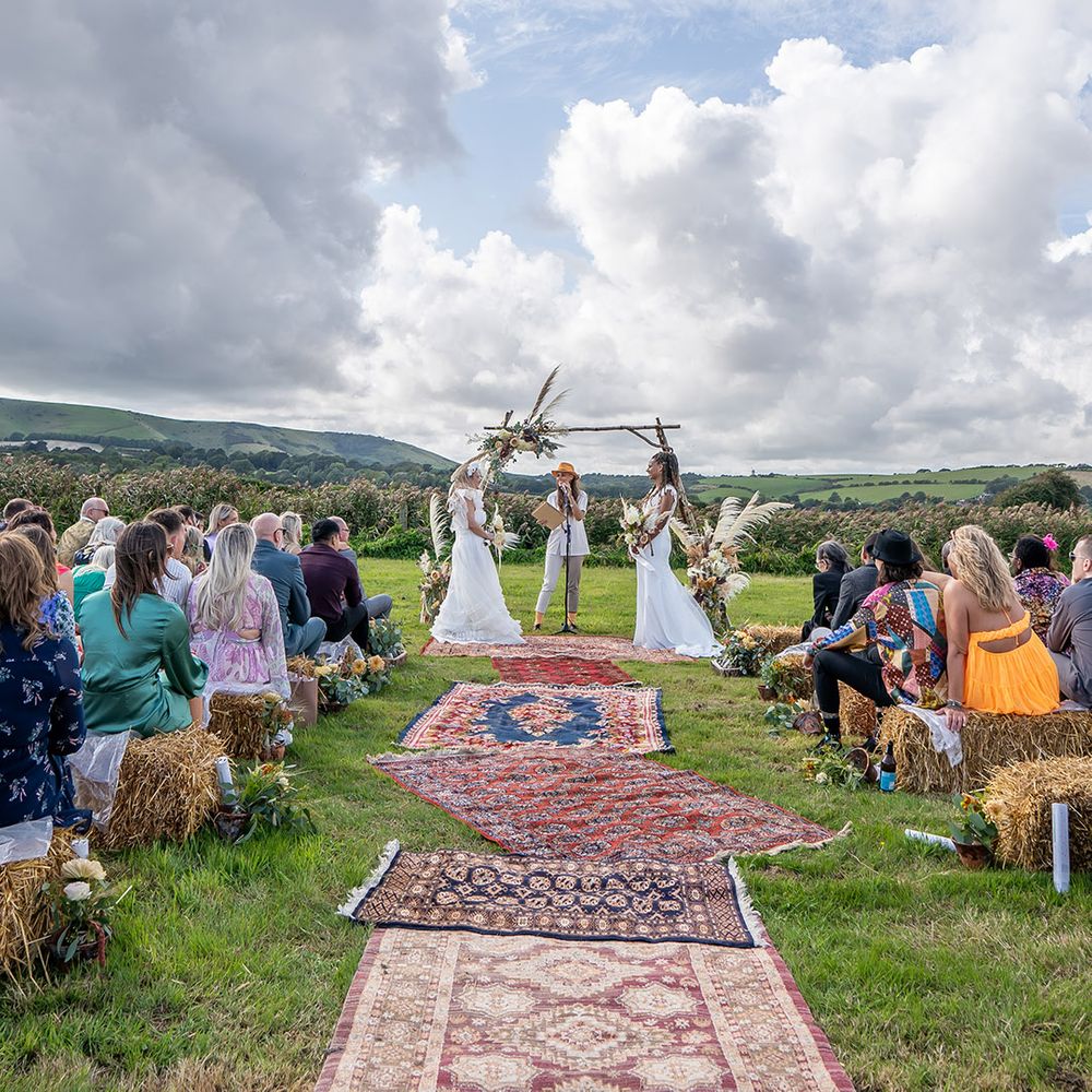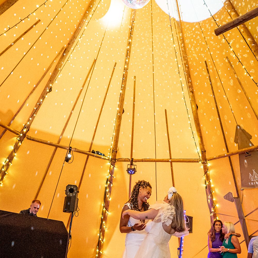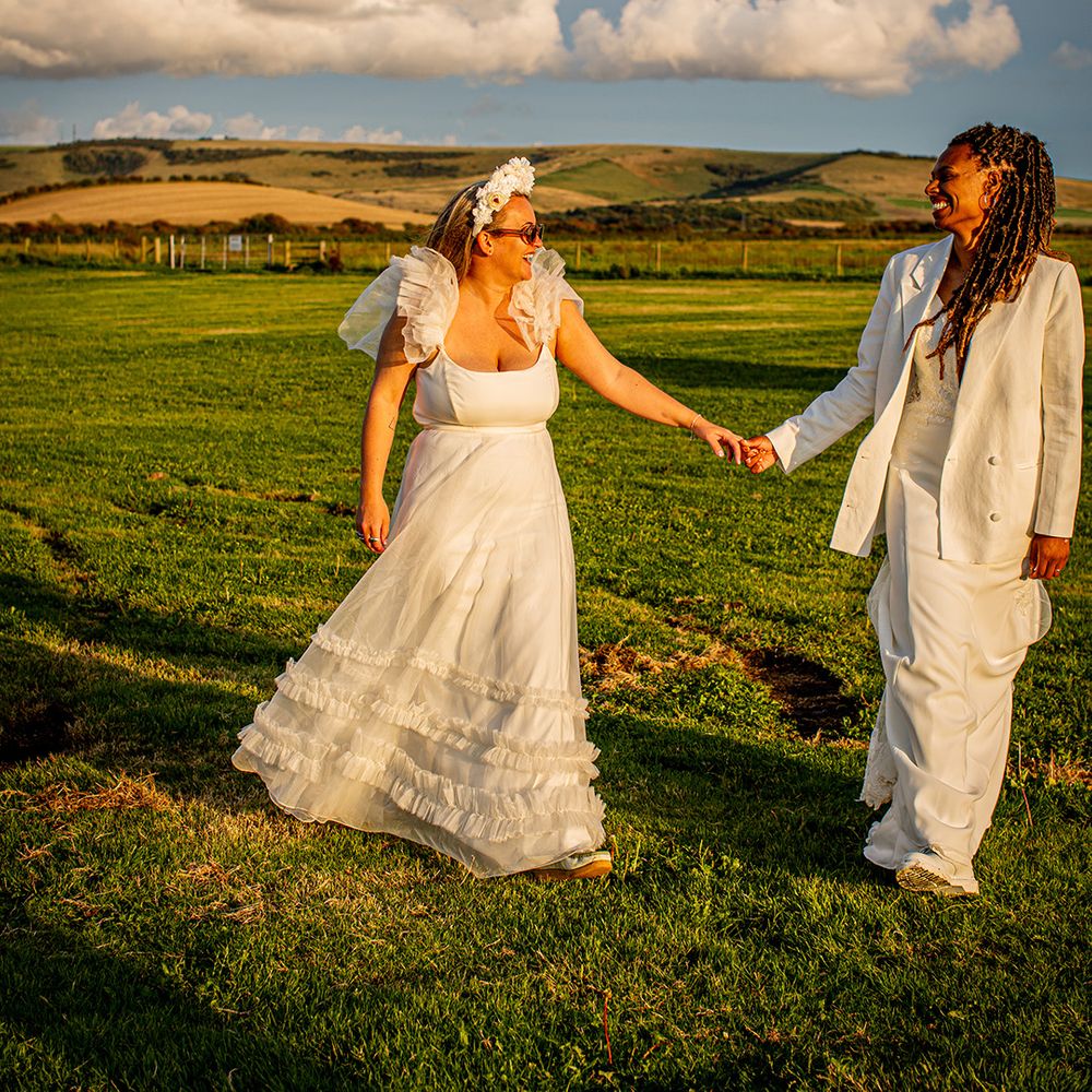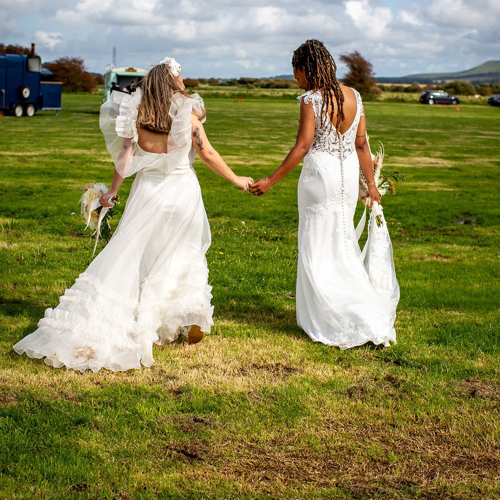 The location of Amy & Rebecca’s wedding at The Party Fields meant that the backdrop of the wedding was the beautiful South Downs National Park. Amy & Rebecca absolutely love music so it was obvious for them to choose a natural boho theme with festival elements. The couple had an outdoor wedding ceremony complete with hay bale aisle seats for that rustic and relaxed boho festival vibe. For the reception, Amy & Rebecca had a large 4-hat tipi. Guests dined from different food trucks and partied into the night with the live wedding band. For entertainment throughout the day, there were carnival games including a mechanical bull that had everyone giggling.