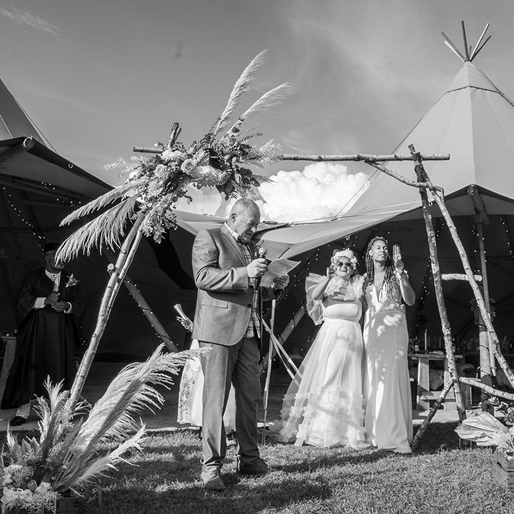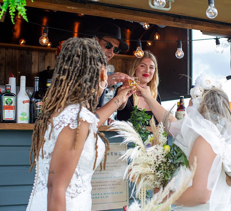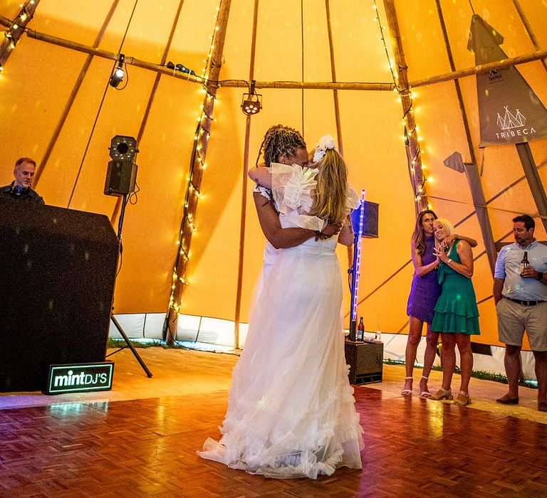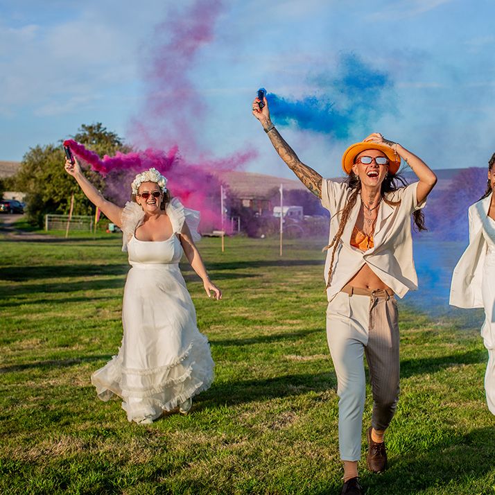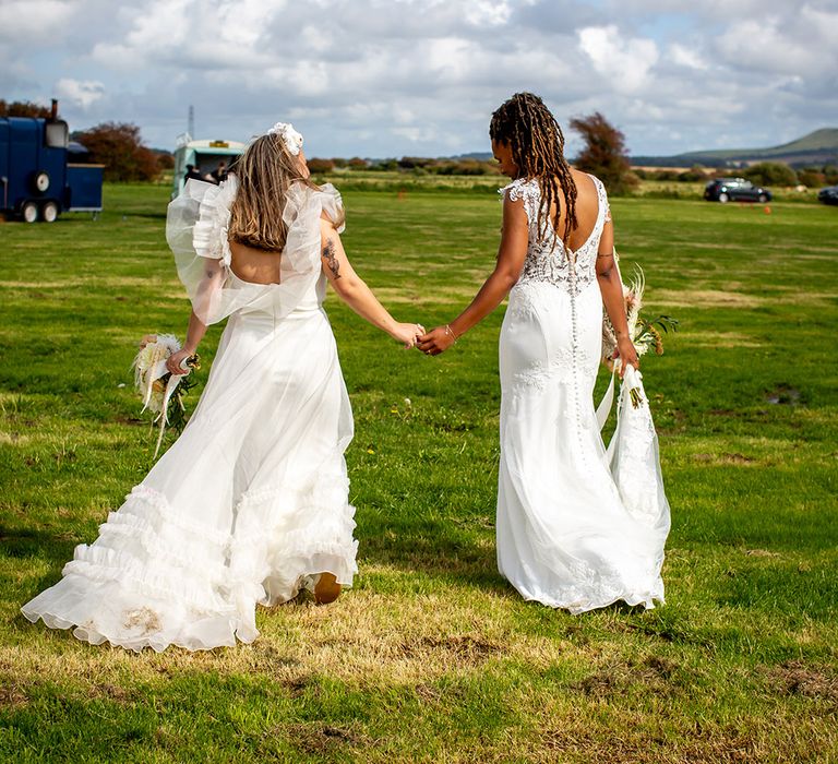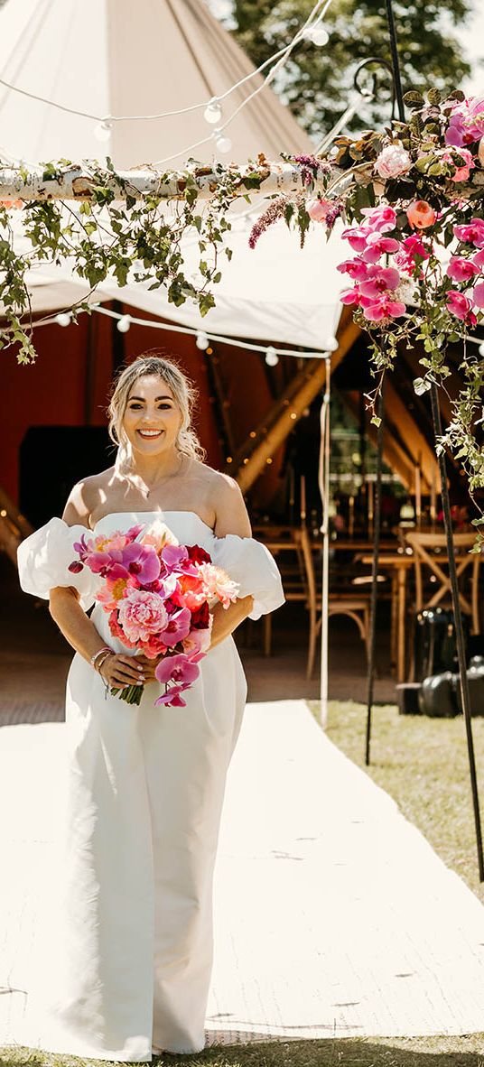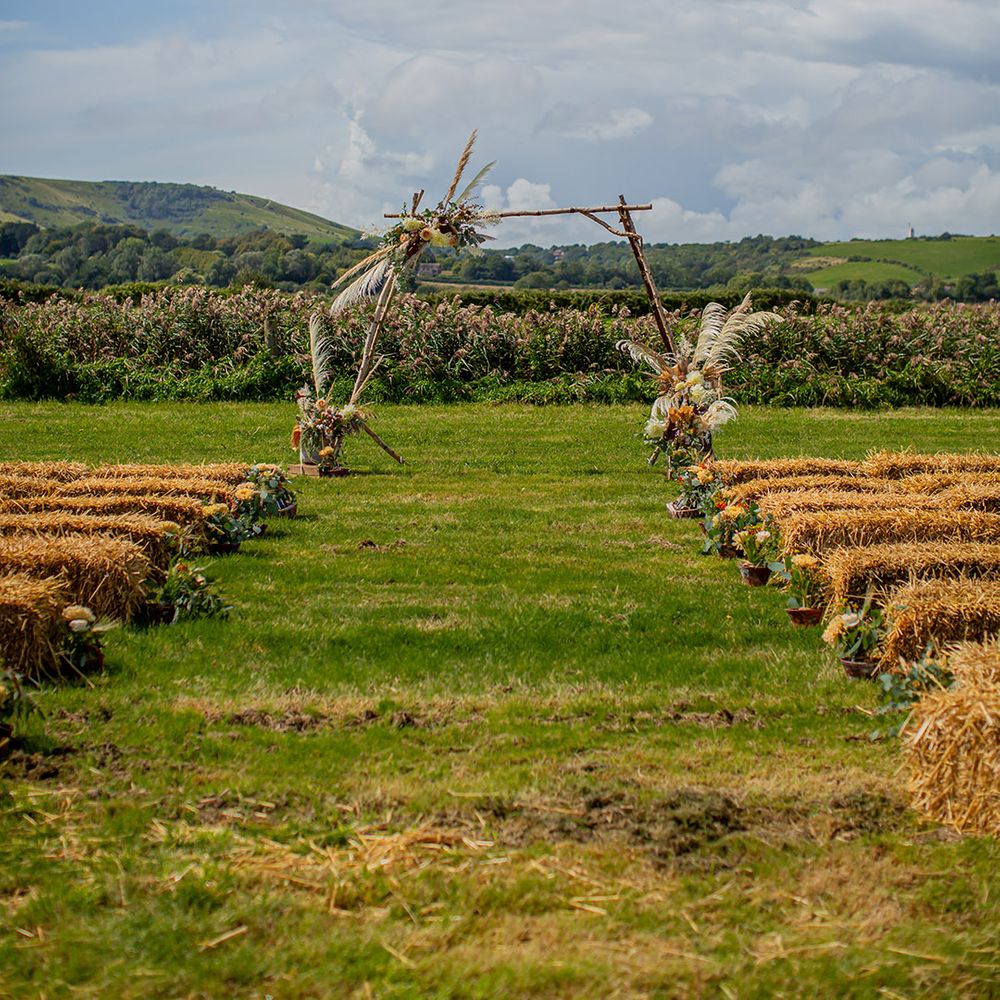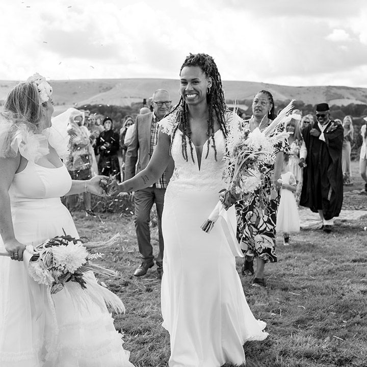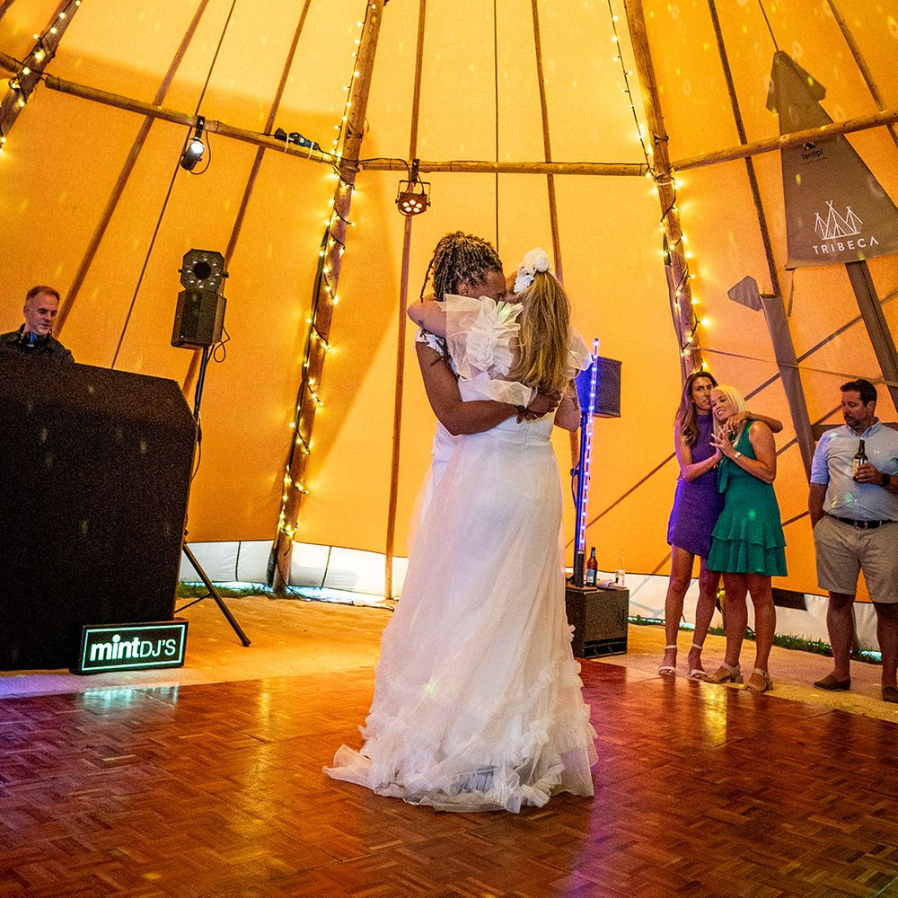 The location of Amy & Rebecca’s wedding at The Party Fields meant that the backdrop of the wedding was the beautiful South Downs National Park. Amy & Rebecca absolutely love music so it was obvious for them to choose a natural boho theme with festival elements. The couple had an outdoor wedding ceremony complete with hay bale aisle seats for that rustic and relaxed boho festival vibe. For the reception, Amy & Rebecca had a large 4-hat tipi. Guests dined from different food trucks and partied into the night with the live wedding band. For entertainment throughout the day, there were carnival games including a mechanical bull that had everyone giggling.