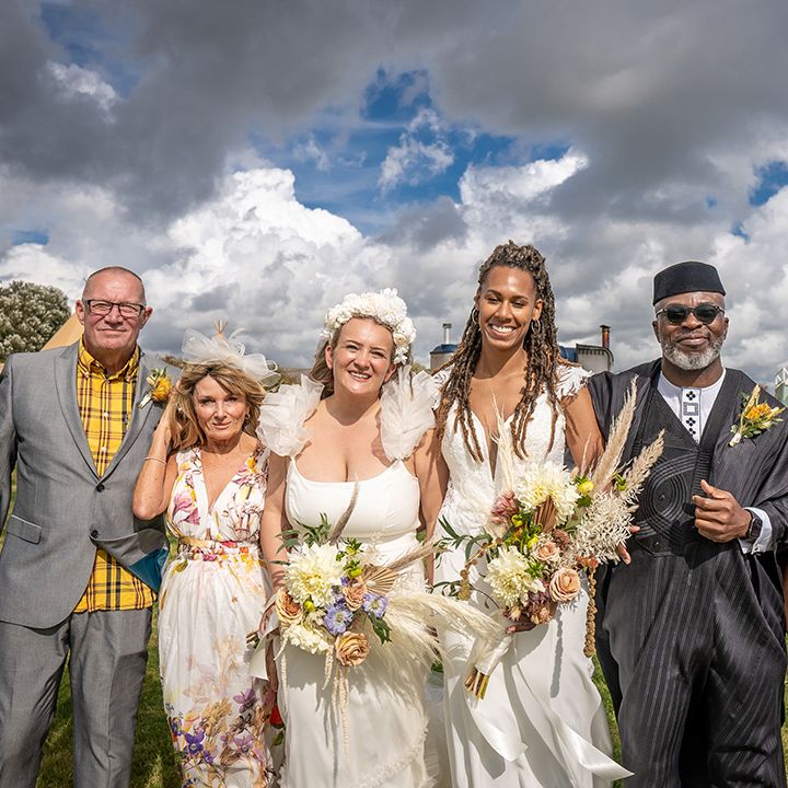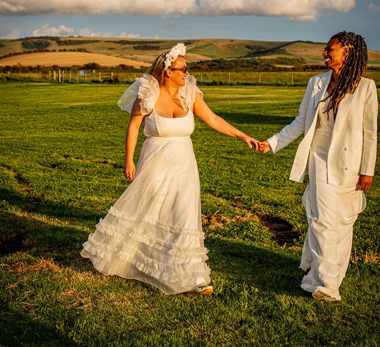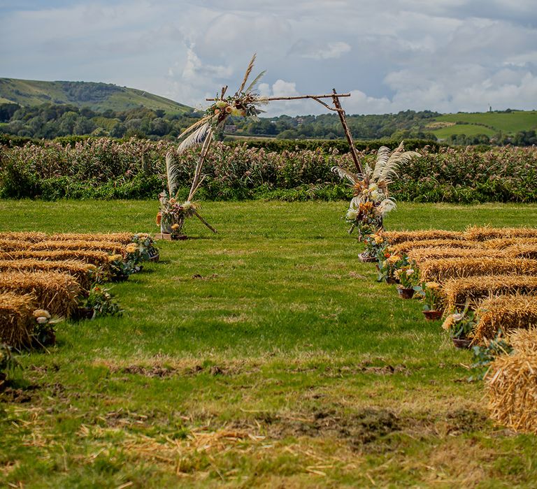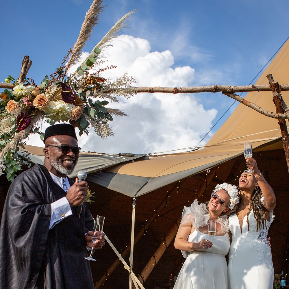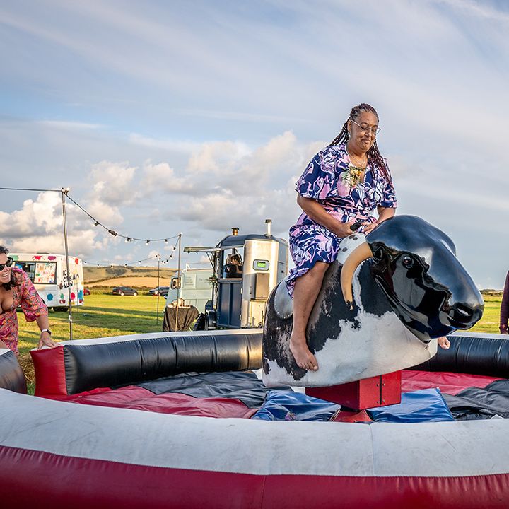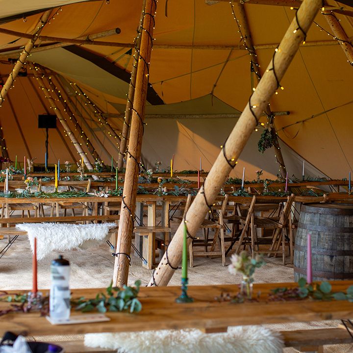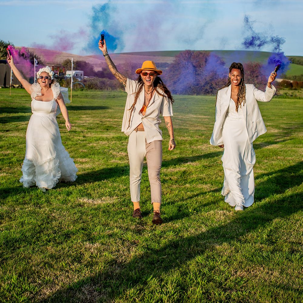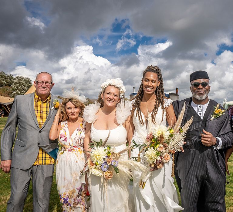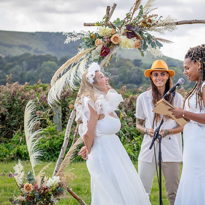 The location of Amy & Rebecca’s wedding at The Party Fields meant that the backdrop of the wedding was the beautiful South Downs National Park. Amy & Rebecca absolutely love music so it was obvious for them to choose a natural boho theme with festival elements. The couple had an outdoor wedding ceremony complete with hay bale aisle seats for that rustic and relaxed boho festival vibe. For the reception, Amy & Rebecca had a large 4-hat tipi. Guests dined from different food trucks and partied into the night with the live wedding band. For entertainment throughout the day, there were carnival games including a mechanical bull that had everyone giggling.