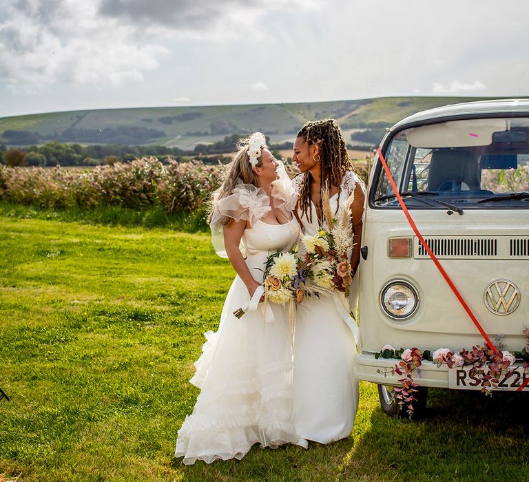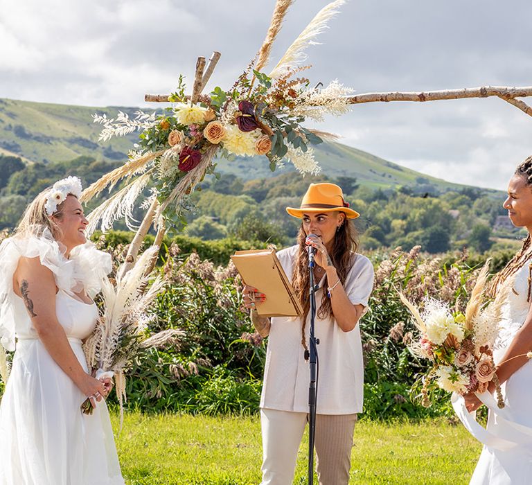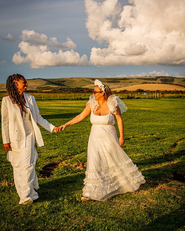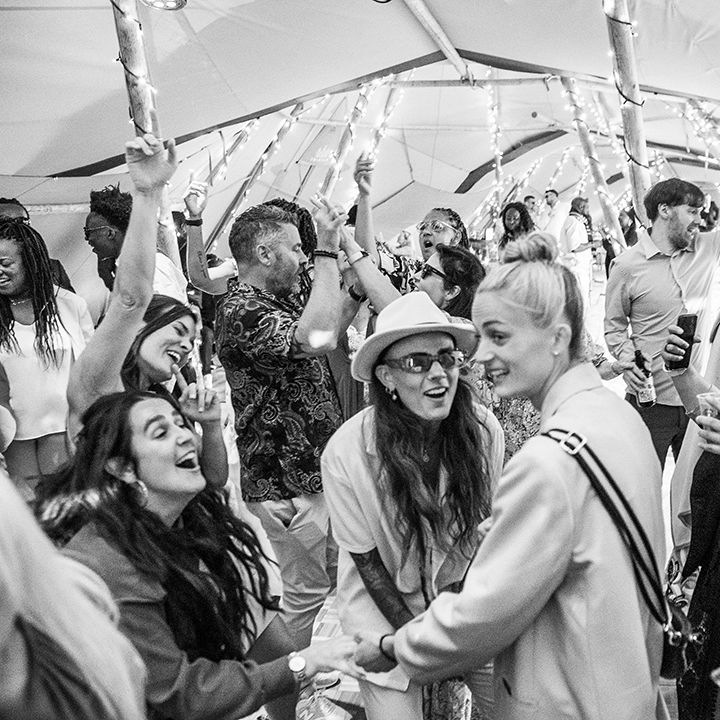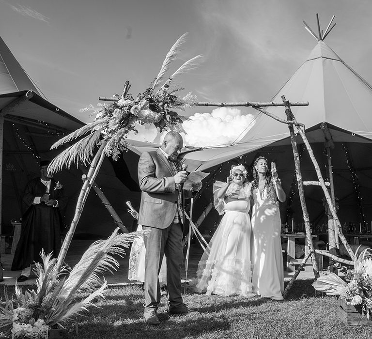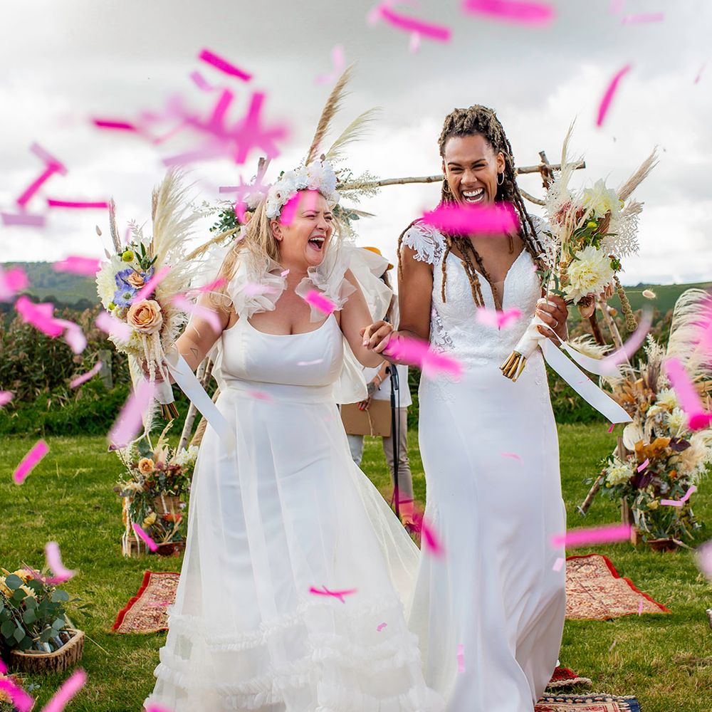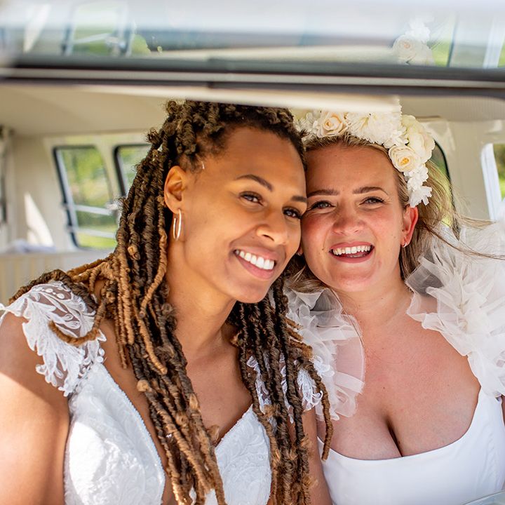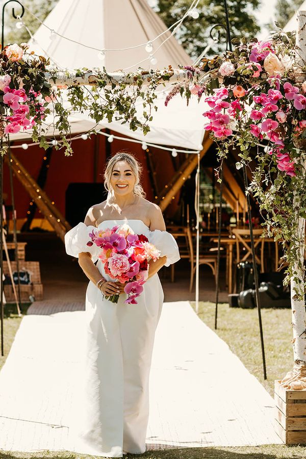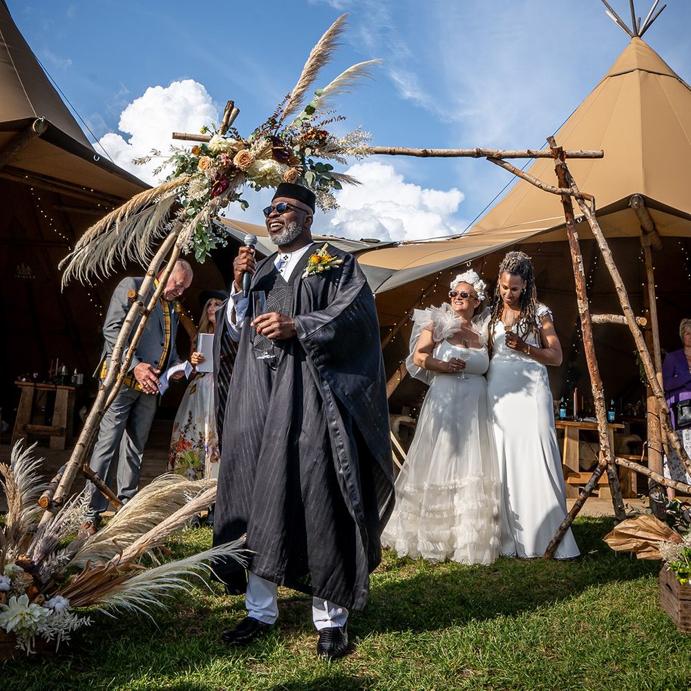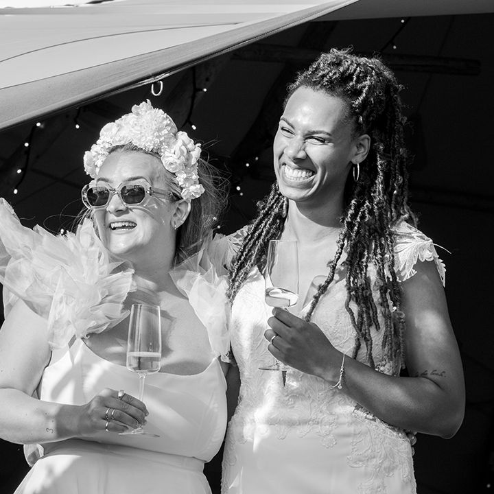The location of Amy & Rebecca’s wedding at The Party Fields meant that the backdrop of the wedding was the beautiful South Downs National Park. Amy & Rebecca absolutely love music so it was obvious for them to choose a natural boho theme with festival elements. The couple had an outdoor wedding ceremony complete with hay bale aisle seats for that rustic and relaxed boho festival vibe. For the reception, Amy & Rebecca had a large 4-hat tipi. Guests dined from different food trucks and partied into the night with the live wedding band. For entertainment throughout the day, there were carnival games including a mechanical bull that had everyone giggling.