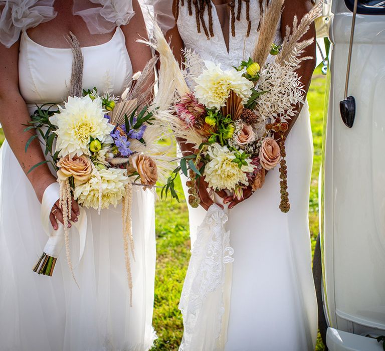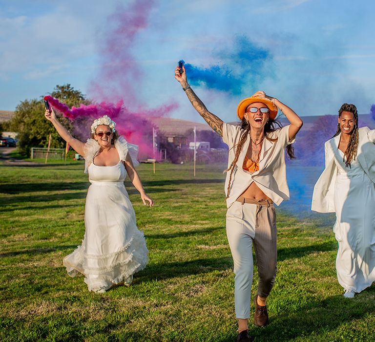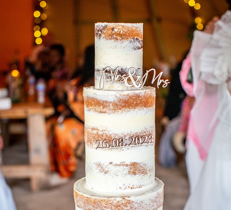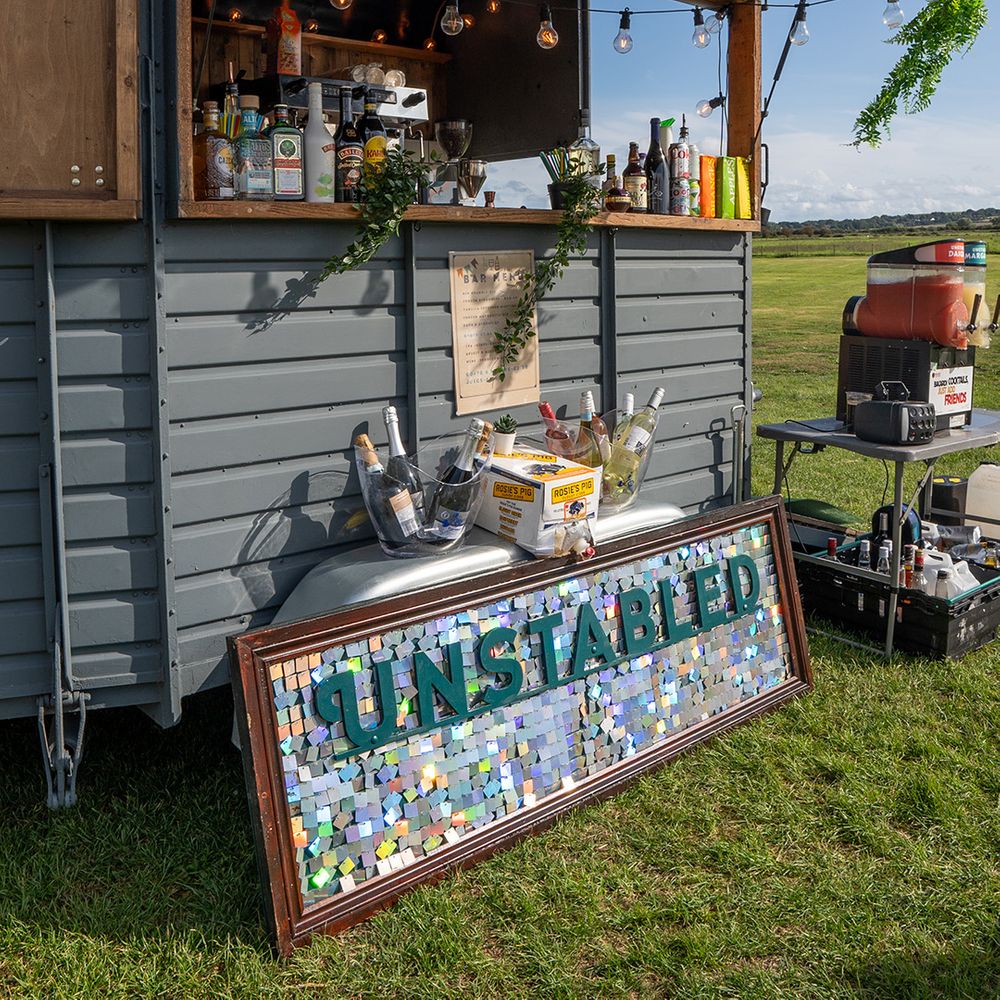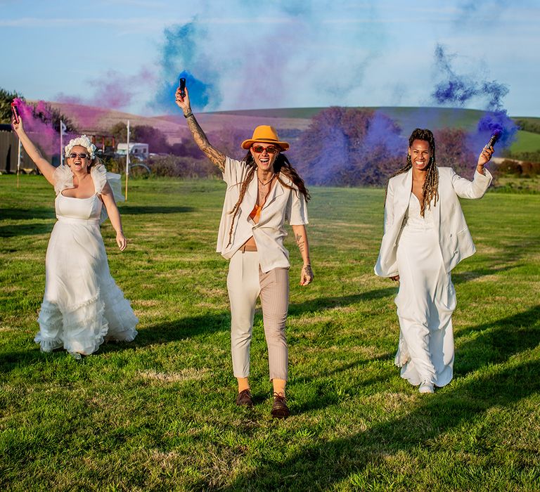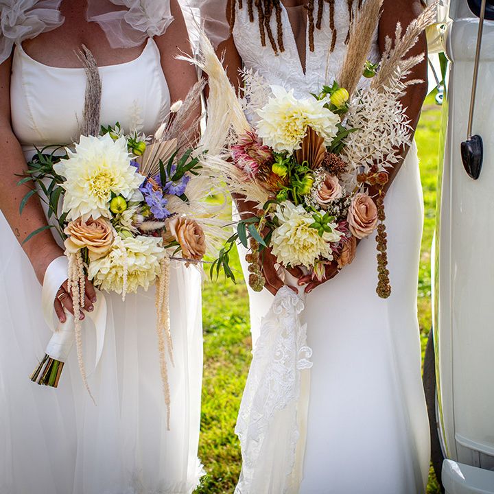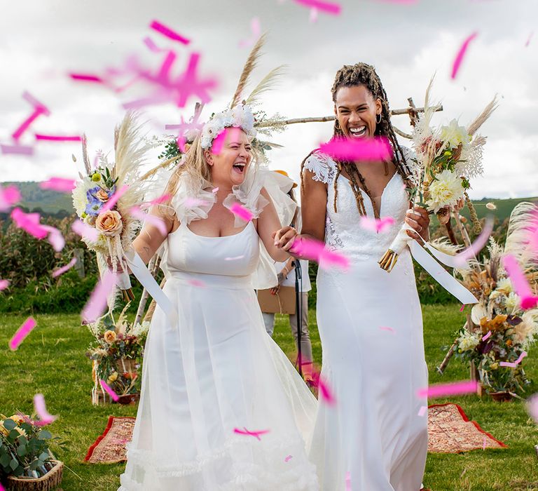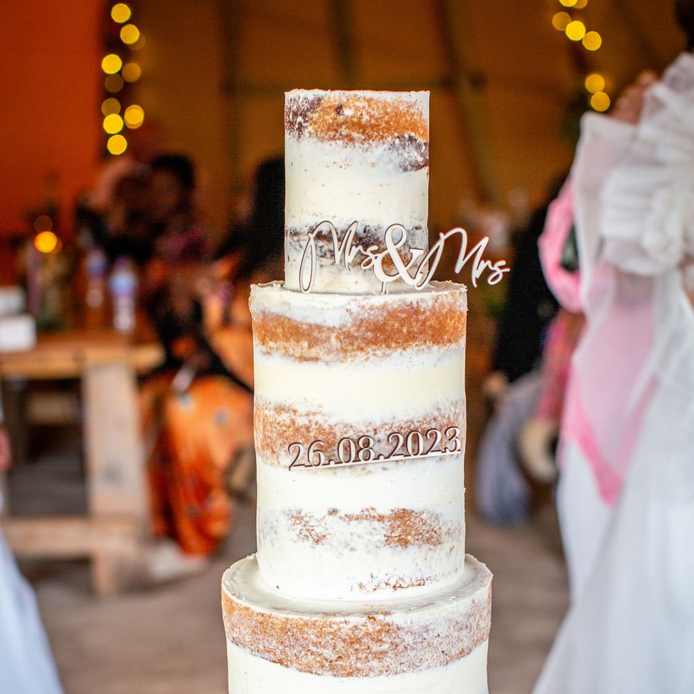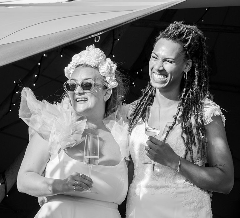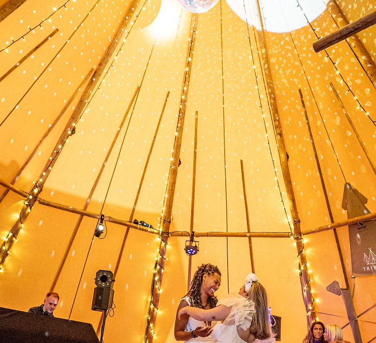 The location of Amy & Rebecca’s wedding at The Party Fields meant that the backdrop of the wedding was the beautiful South Downs National Park. Amy & Rebecca absolutely love music so it was obvious for them to choose a natural boho theme with festival elements. The couple had an outdoor wedding ceremony complete with hay bale aisle seats for that rustic and relaxed boho festival vibe. For the reception, Amy & Rebecca had a large 4-hat tipi. Guests dined from different food trucks and partied into the night with the live wedding band. For entertainment throughout the day, there were carnival games including a mechanical bull that had everyone giggling.