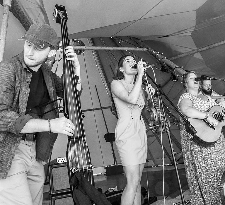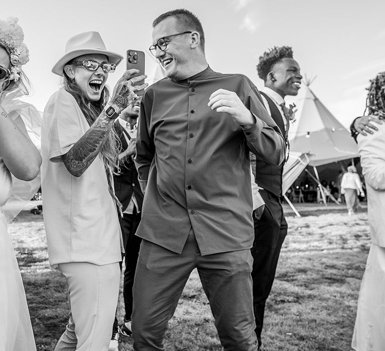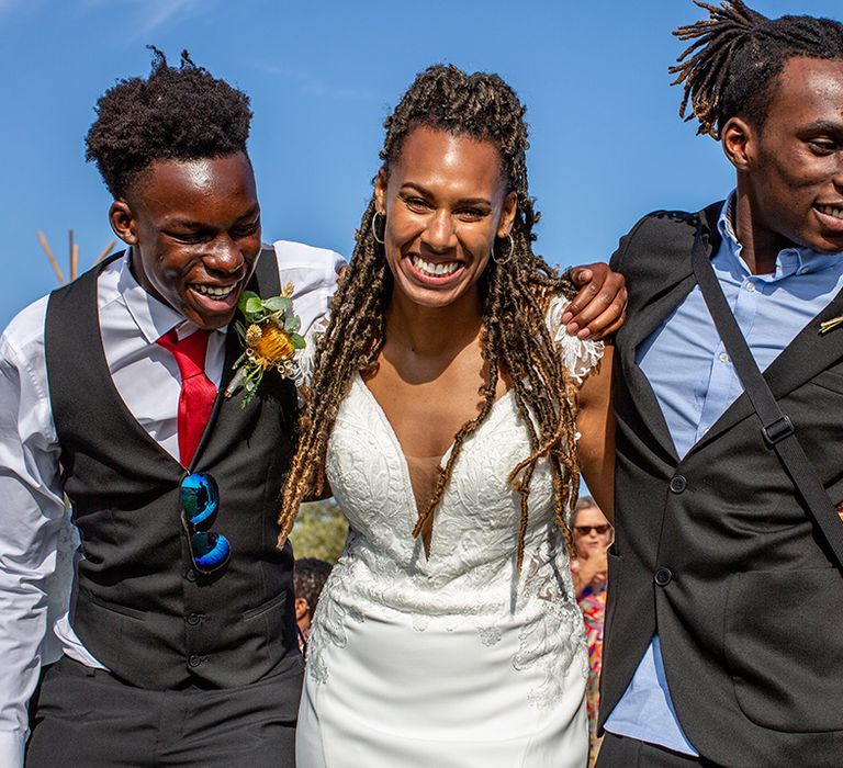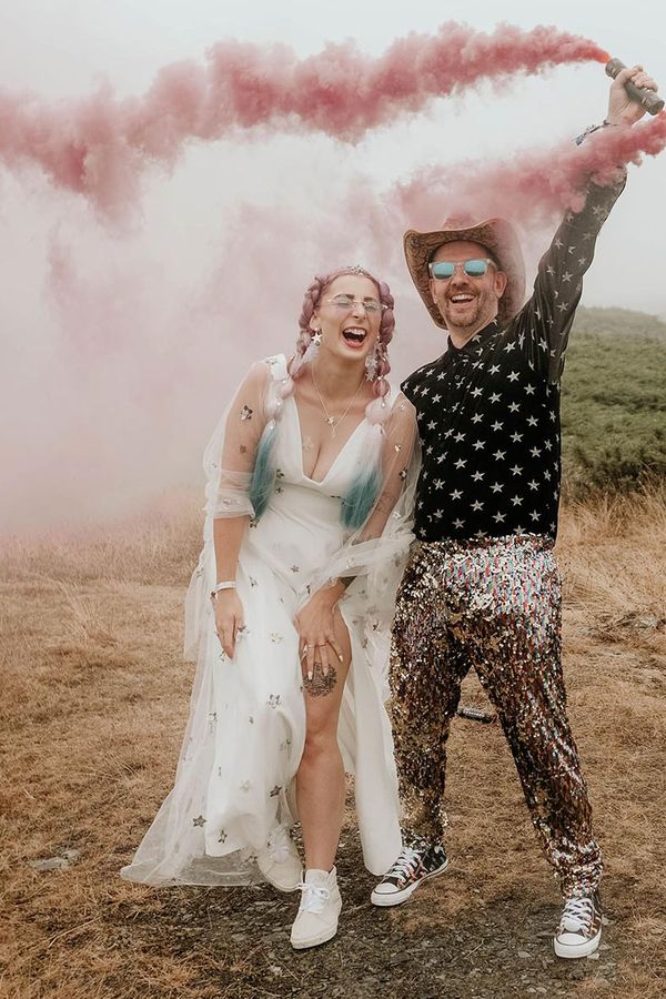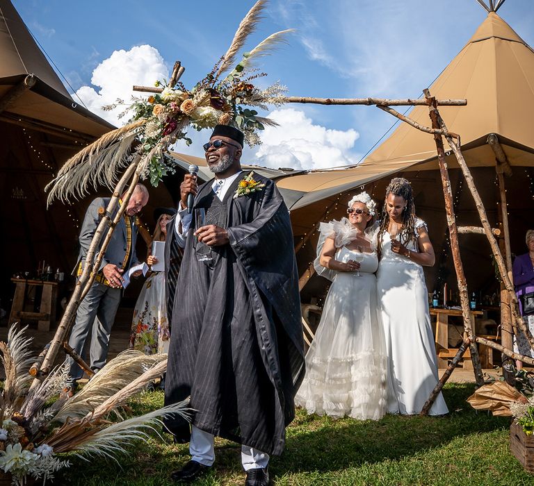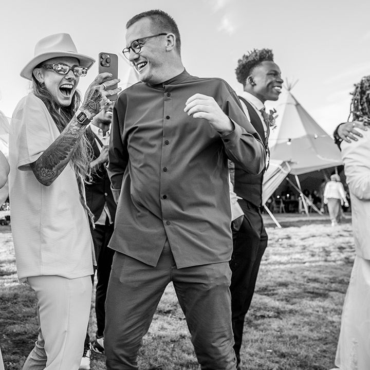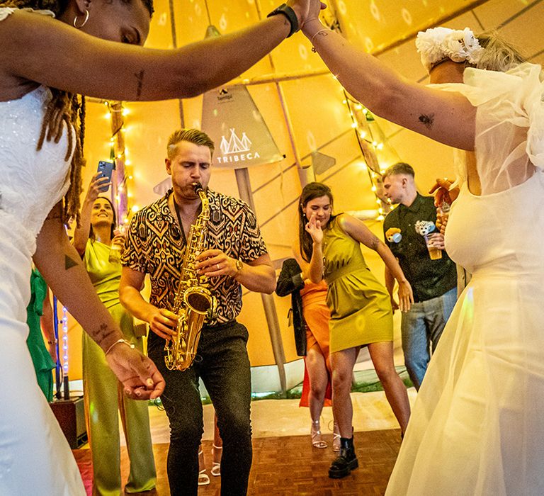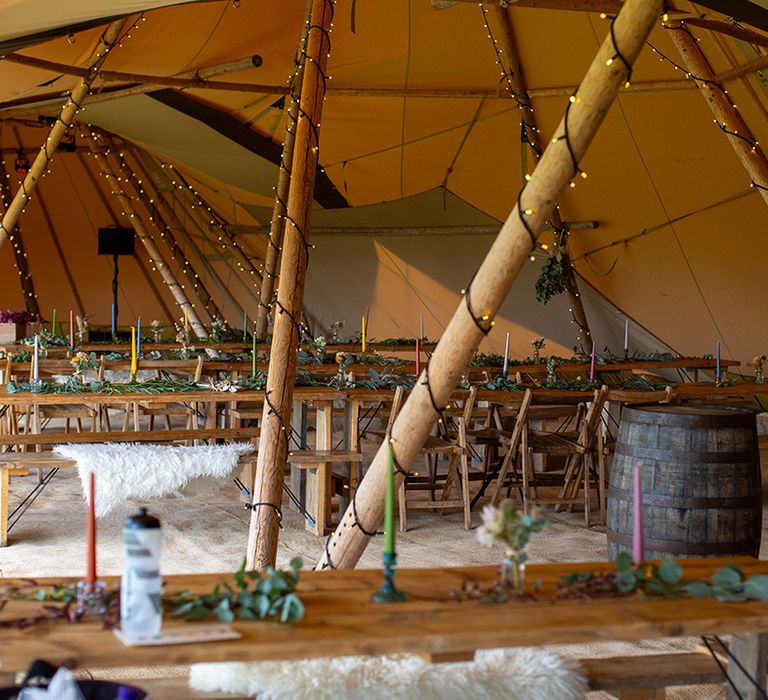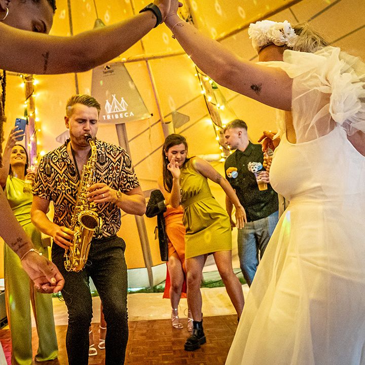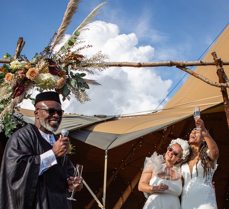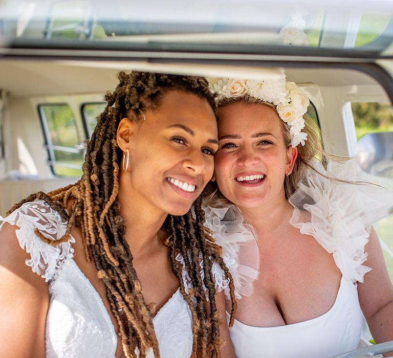 The location of Amy & Rebecca’s wedding at The Party Fields meant that the backdrop of the wedding was the beautiful South Downs National Park. Amy & Rebecca absolutely love music so it was obvious for them to choose a natural boho theme with festival elements. The couple had an outdoor wedding ceremony complete with hay bale aisle seats for that rustic and relaxed boho festival vibe. For the reception, Amy & Rebecca had a large 4-hat tipi. Guests dined from different food trucks and partied into the night with the live wedding band. For entertainment throughout the day, there were carnival games including a mechanical bull that had everyone giggling.