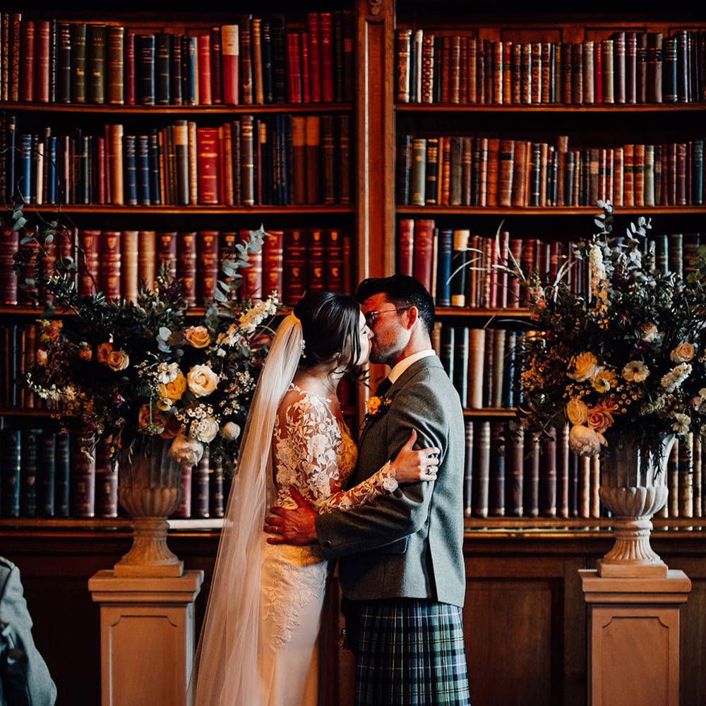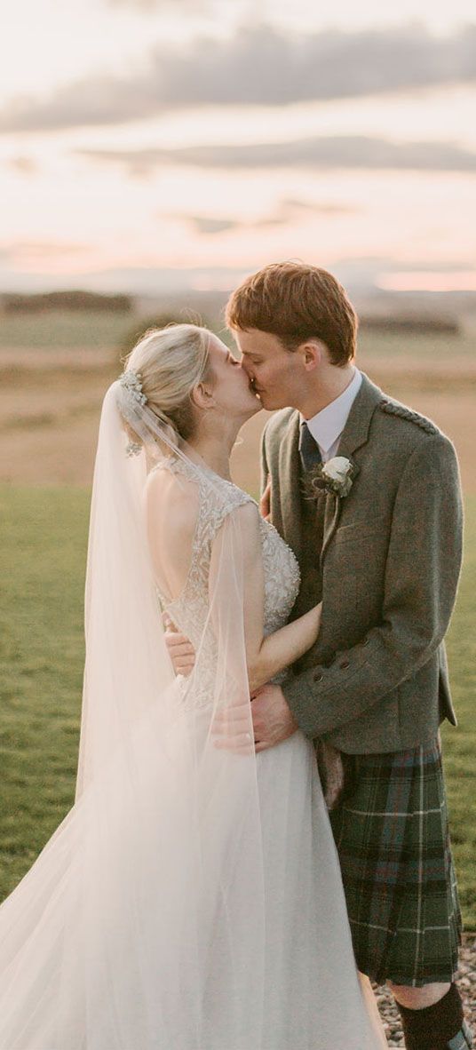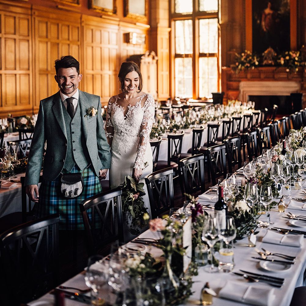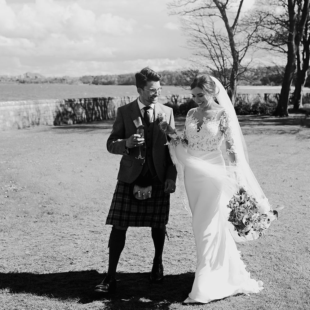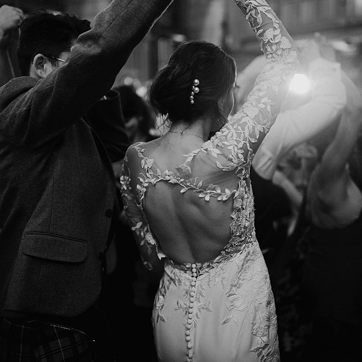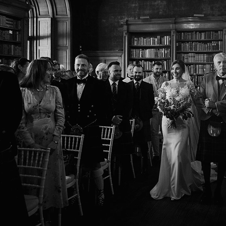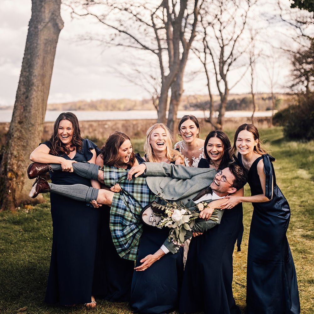 Bryony & Andrew’s wedding day can be described as traditional vintage luxury. The couple wanted to celebrate their Scottish roots woven with parts of their personalities and shared experiences. They decided Barnbougle Castle was the perfect choice for them as the venue is full of unique and charming character. That being said, despite the luxury vibes of the castle, they still aimed for a relaxed and fun-loving vibe. For decor, Bryony & Andrew kept things traditional with white flowers and lots of foliage. The bridesmaids also looked so elegant in navy blue bridesmaid dresses. For the evening, the bridesmaids and groomsmen, along with the incredible band, were amazing at keeping the dance floor jumping all night long. Bryony & Andrew’s first dance was a ceilidh dance that included all of our friends and family and also really helped get the party started.