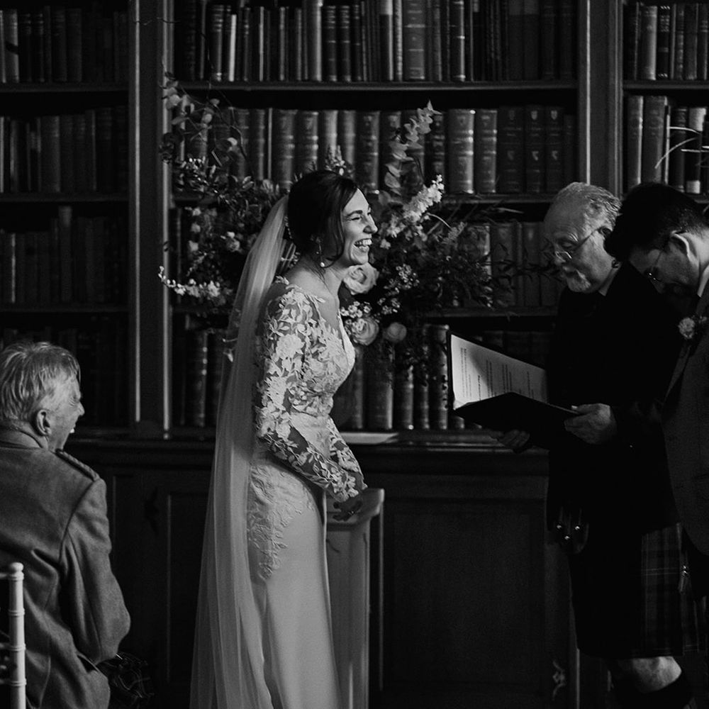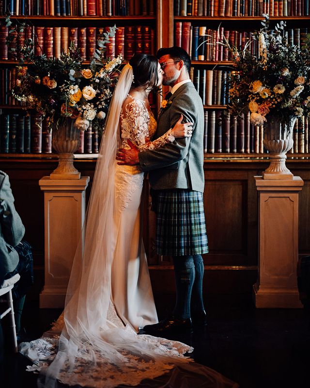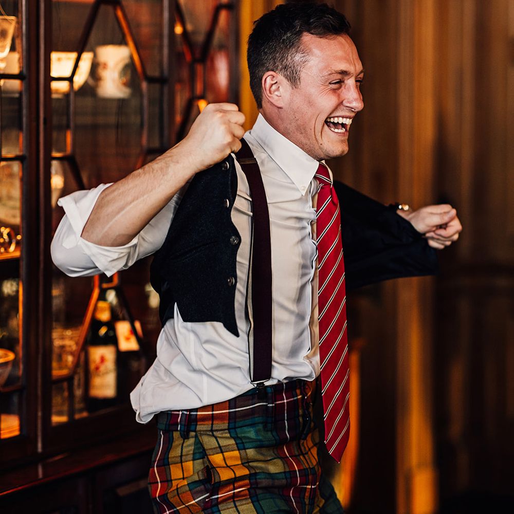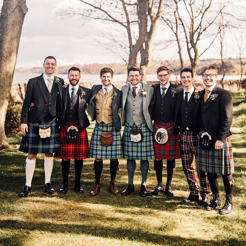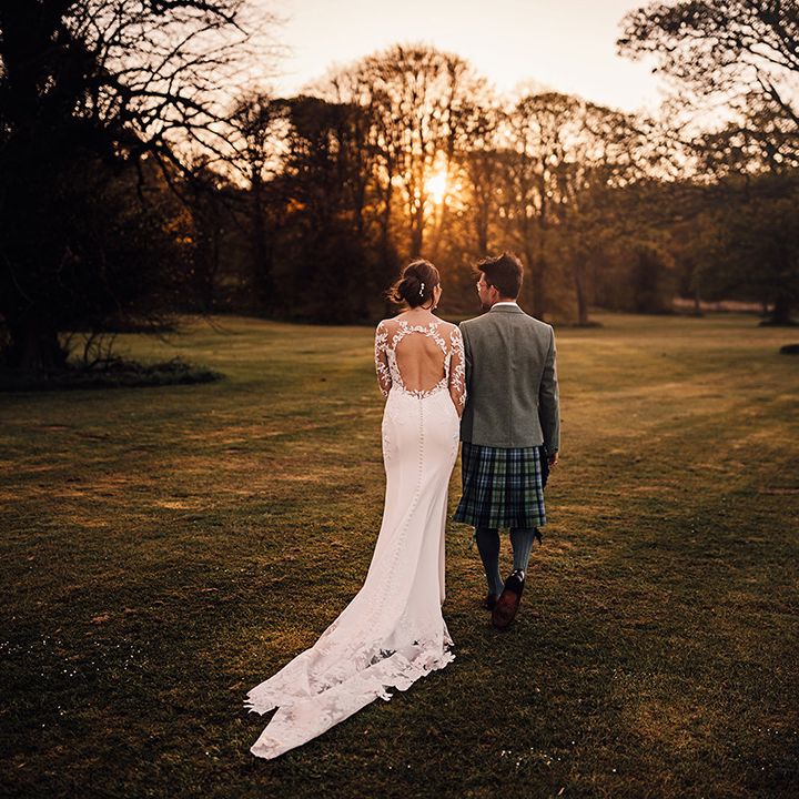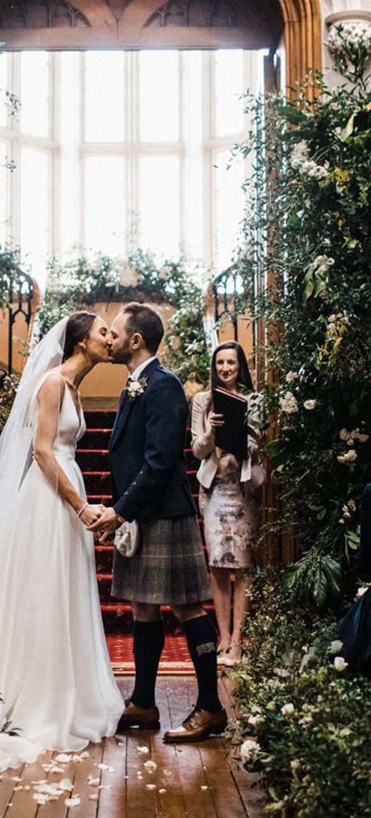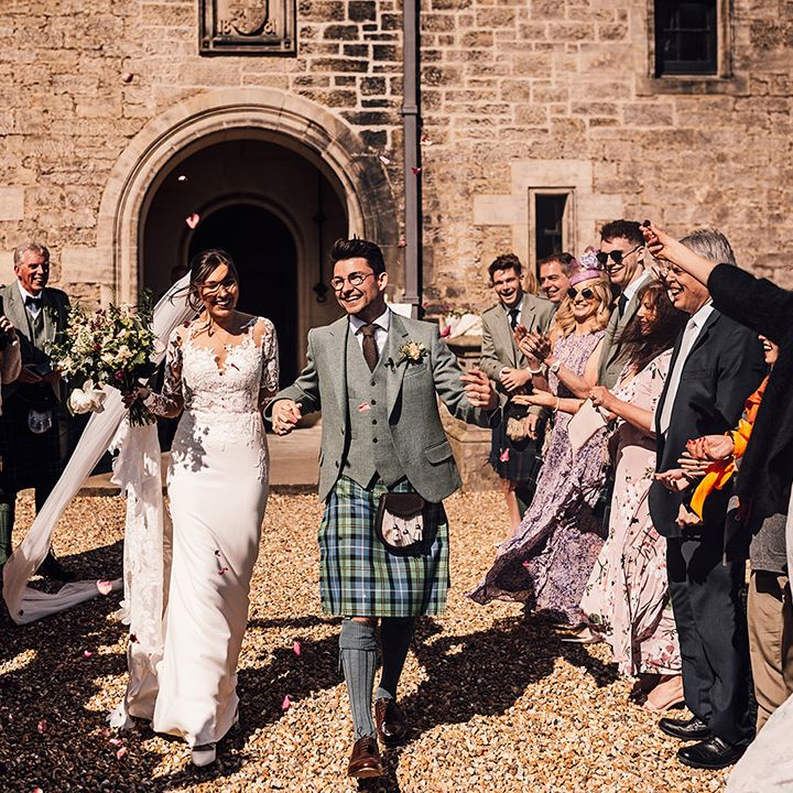 Bryony & Andrew’s wedding day can be described as traditional vintage luxury. The couple wanted to celebrate their Scottish roots woven with parts of their personalities and shared experiences. They decided Barnbougle Castle was the perfect choice for them as the venue is full of unique and charming character. That being said, despite the luxury vibes of the castle, they still aimed for a relaxed and fun-loving vibe. For decor, Bryony & Andrew kept things traditional with white flowers and lots of foliage. The bridesmaids also looked so elegant in navy blue bridesmaid dresses. For the evening, the bridesmaids and groomsmen, along with the incredible band, were amazing at keeping the dance floor jumping all night long. Bryony & Andrew’s first dance was a ceilidh dance that included all of our friends and family and also really helped get the party started.
