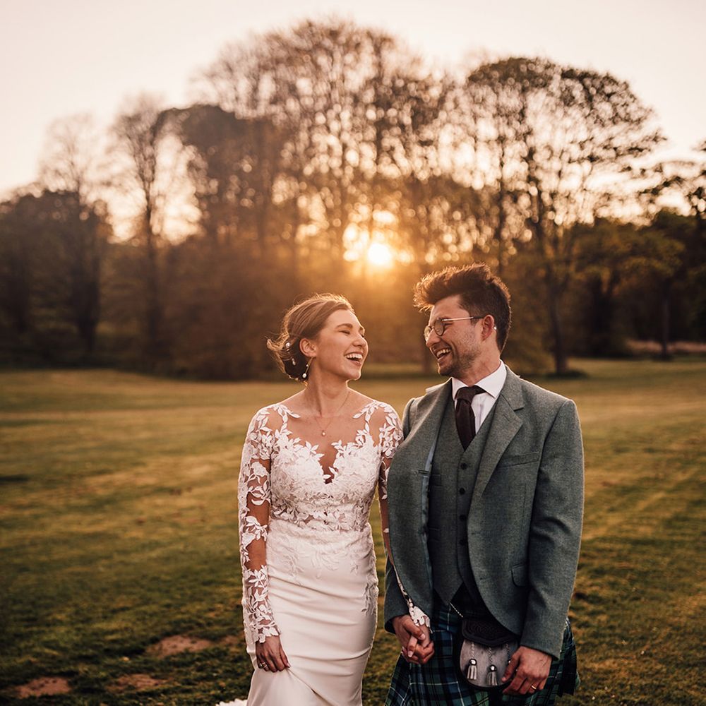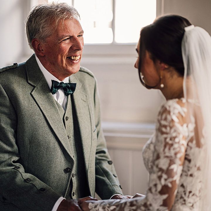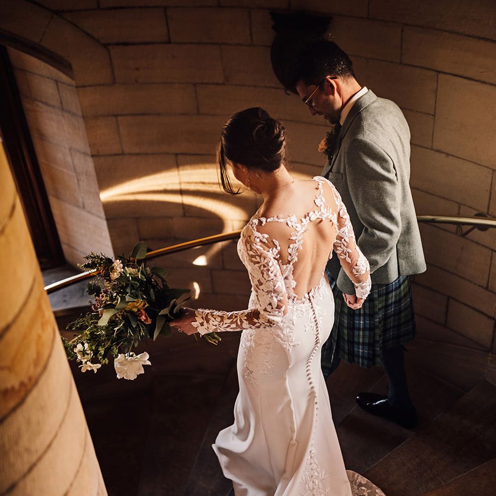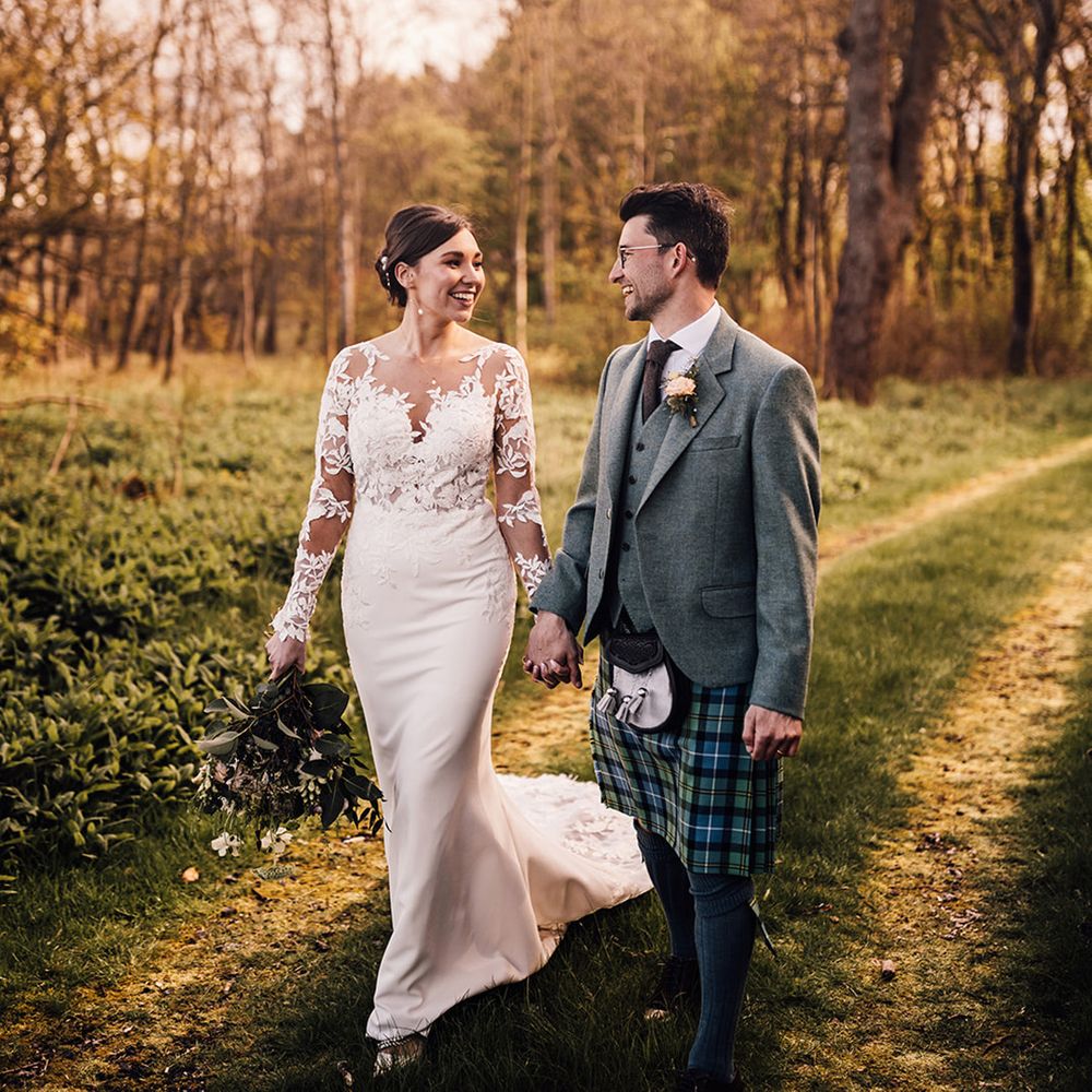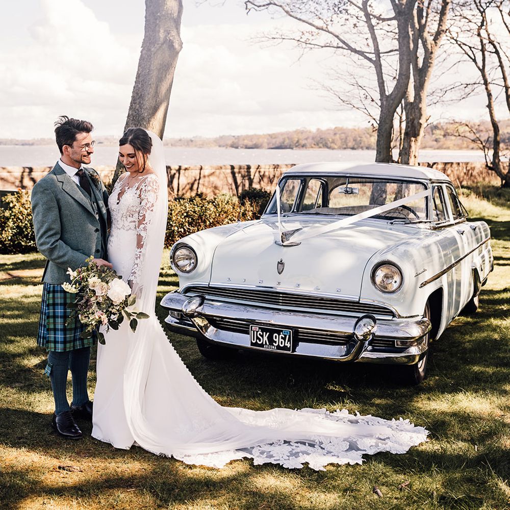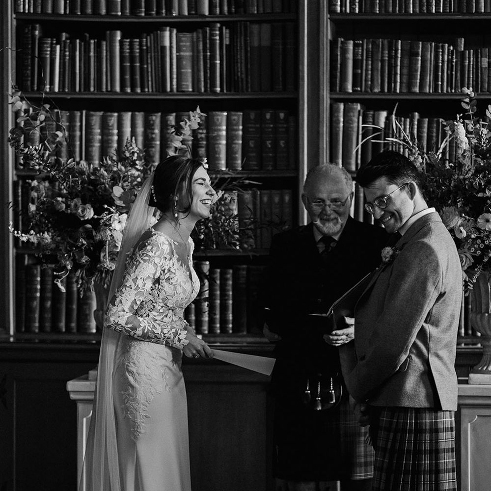 Bryony & Andrew’s wedding day can be described as traditional vintage luxury. The couple wanted to celebrate their Scottish roots woven with parts of their personalities and shared experiences. They decided Barnbougle Castle was the perfect choice for them as the venue is full of unique and charming character. That being said, despite the luxury vibes of the castle, they still aimed for a relaxed and fun-loving vibe. For decor, Bryony & Andrew kept things traditional with white flowers and lots of foliage. The bridesmaids also looked so elegant in navy blue bridesmaid dresses. For the evening, the bridesmaids and groomsmen, along with the incredible band, were amazing at keeping the dance floor jumping all night long. Bryony & Andrew’s first dance was a ceilidh dance that included all of our friends and family and also really helped get the party started.