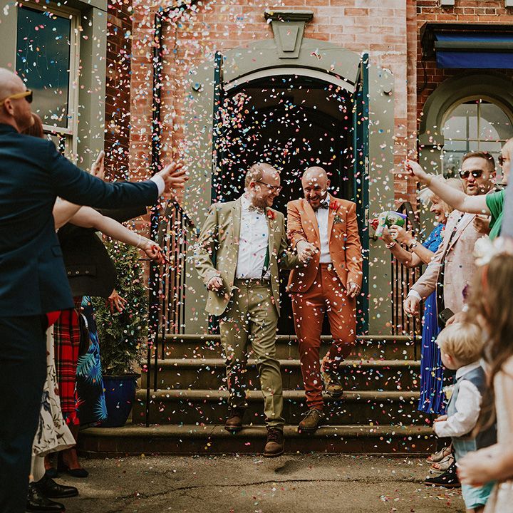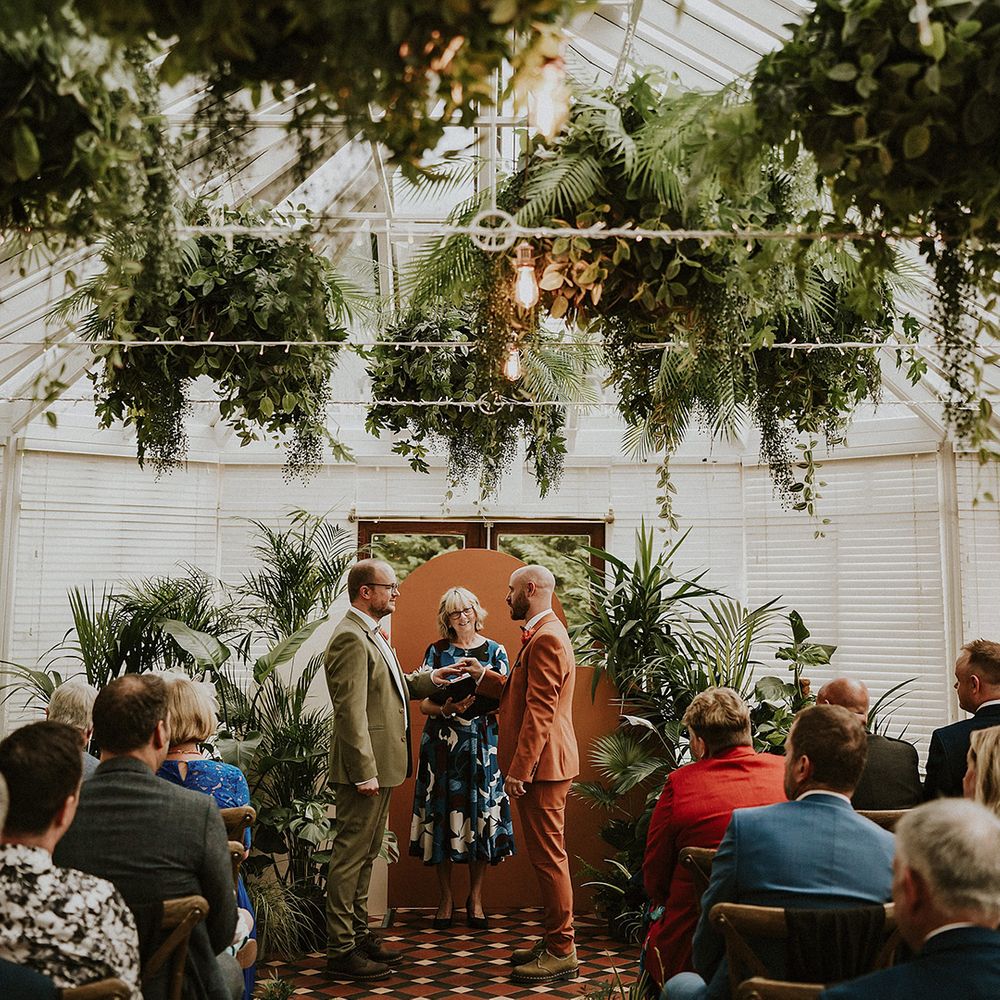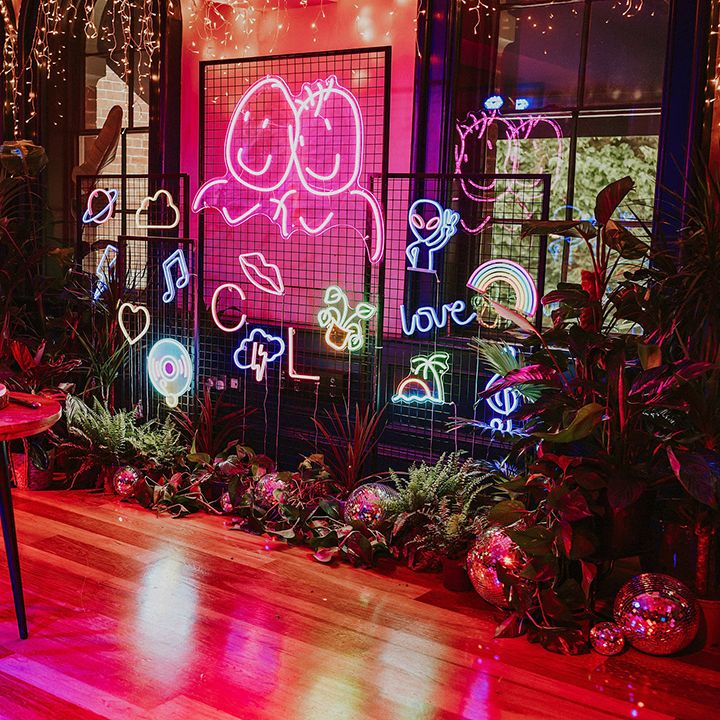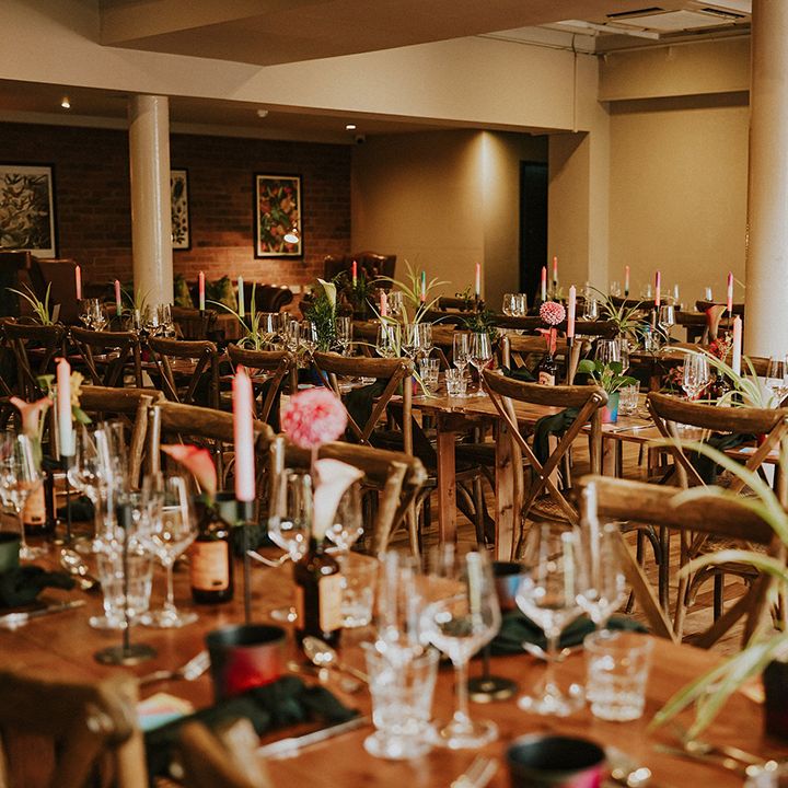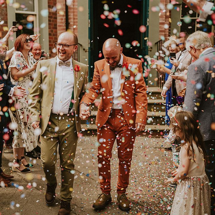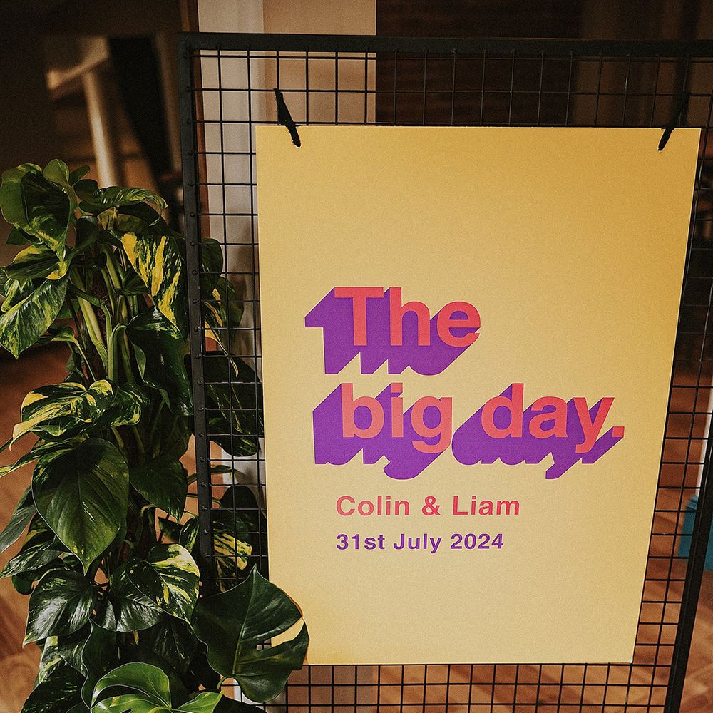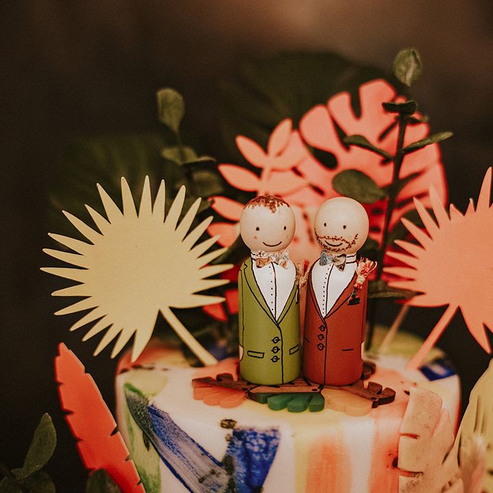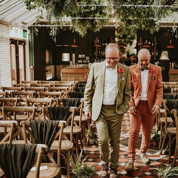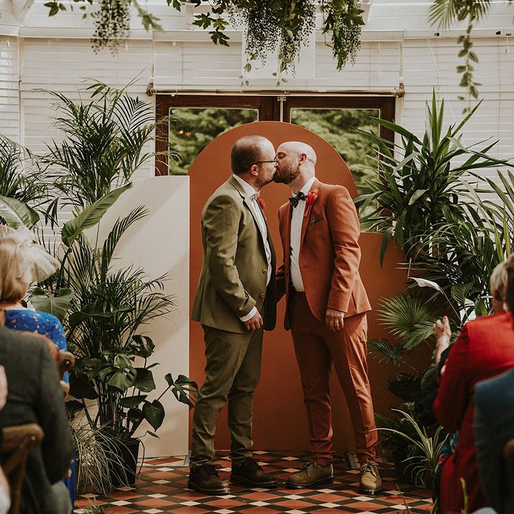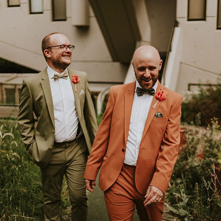 A vibrant wedding bursting with plants, personal touches, and a neon twist. Discover inspiration for colourful suits, DIY florals, and bold wedding style.