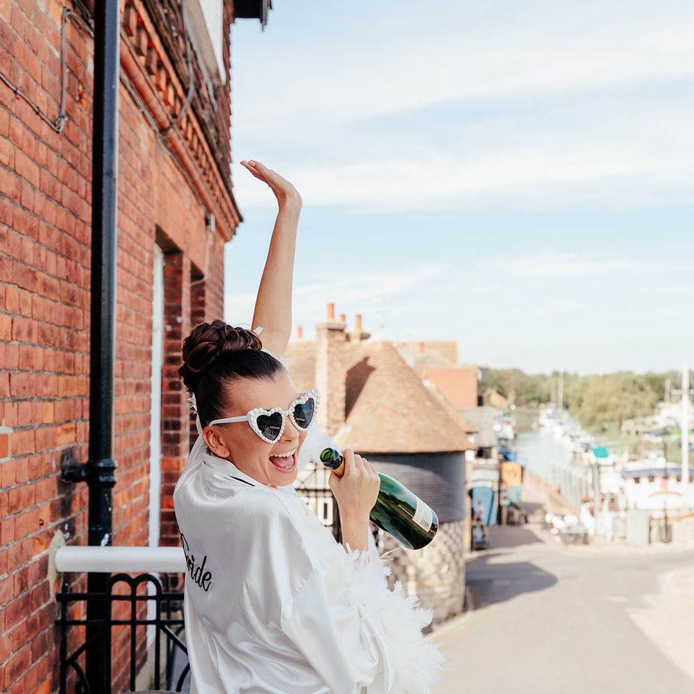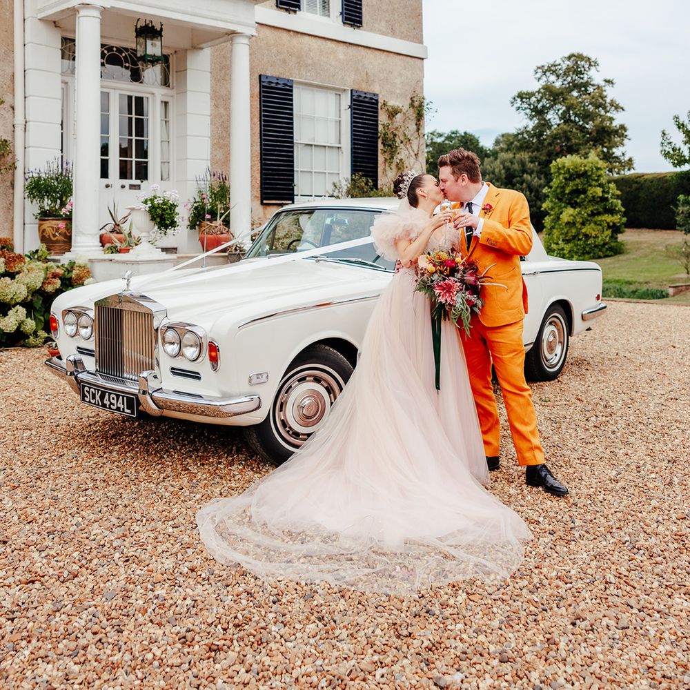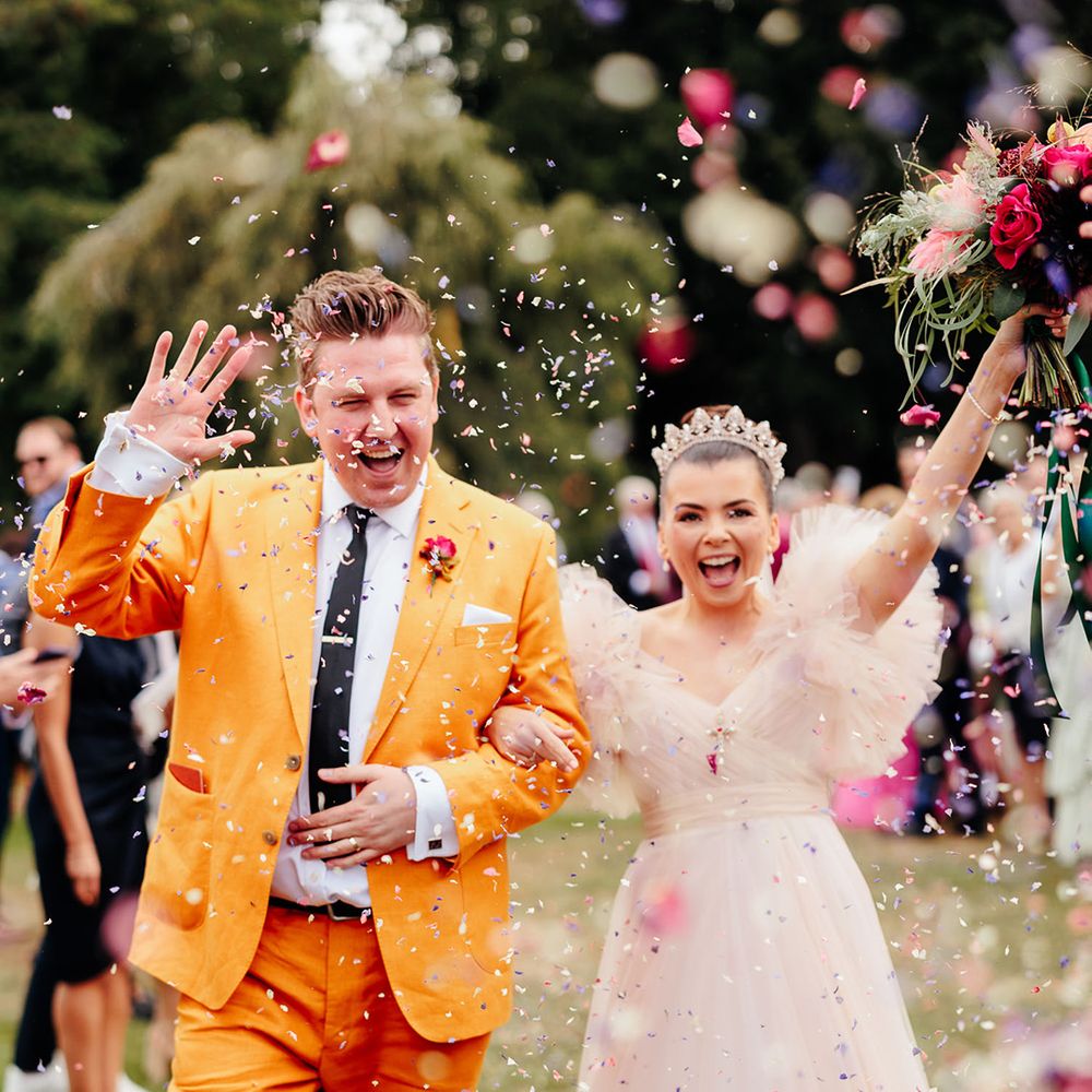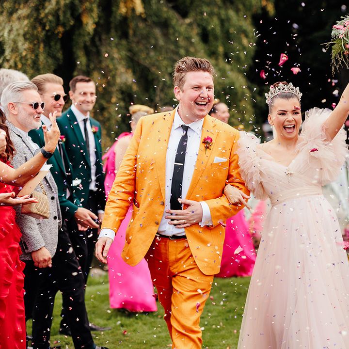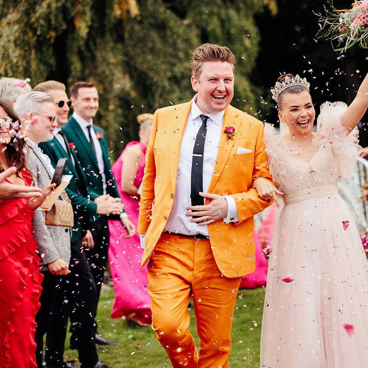 confetti moment at preston court wedding with pink wedding dress and yellow wedding suit