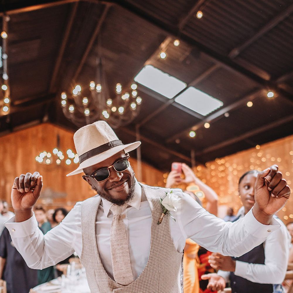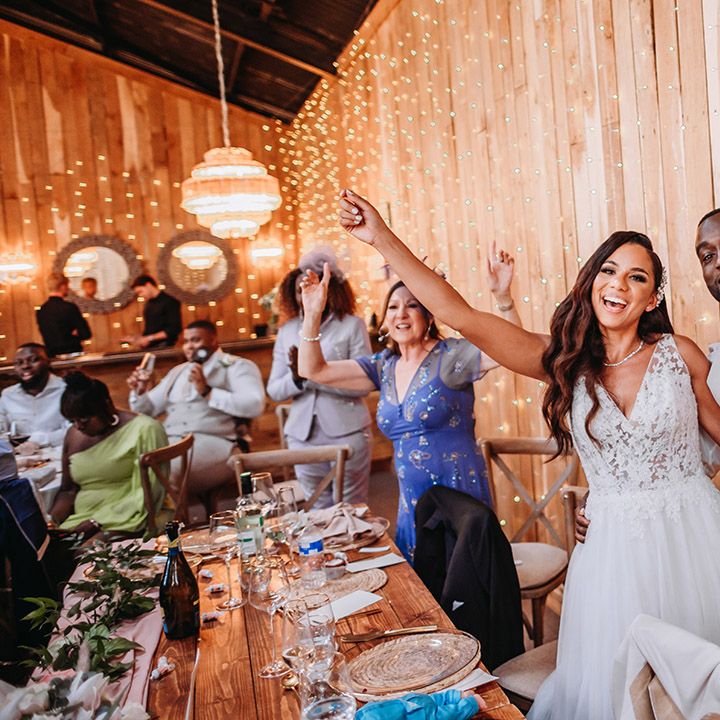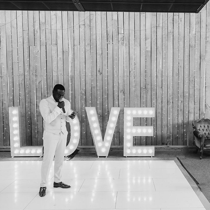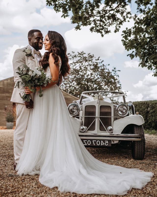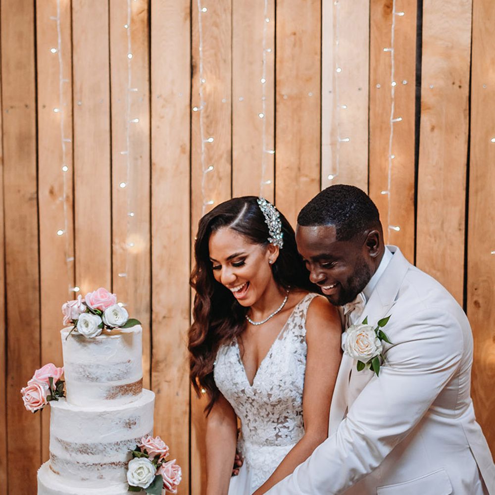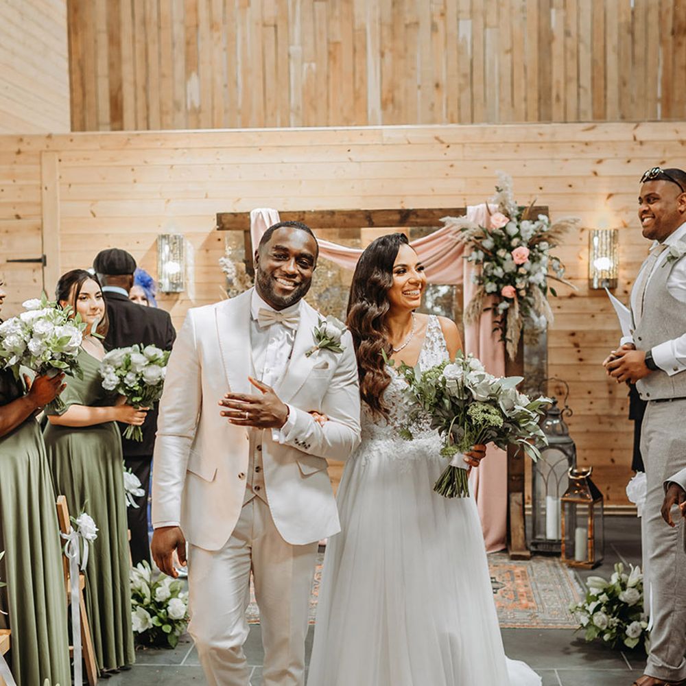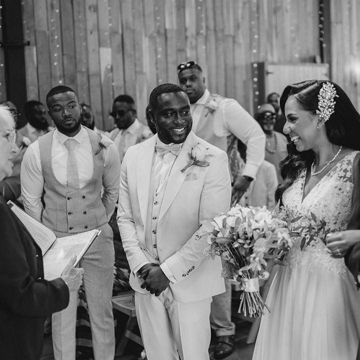 Eve & Michael describe their wedding day at Chafford Park as “Bohemian vibes, with a Caribbean and African twist.” The couple kept things traditional with white rose bouquets and flower arrangements but added pampas grass for that boho touch. To elevate their rustic wedding venue, the groom and groomsmen wore suave ivory suits and they decorated the venue in fairy lights and large ‘LOVE’ letter lights. Eve & Michael’s favourite moment of the day was the champagne spray during golden hour with their groomsmen and bridesmaids, and we don’t blame them! What a photo that is! Champagne pops and sprays are one of our fave wedding photo ideas.