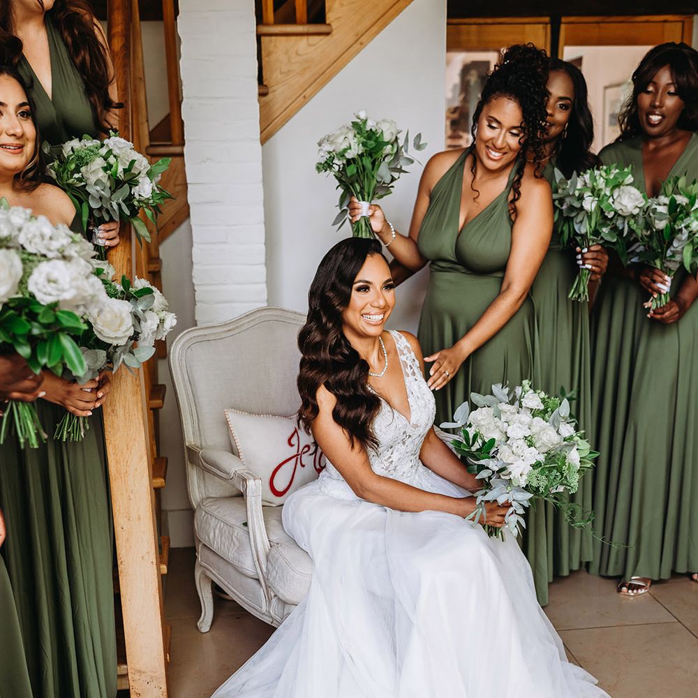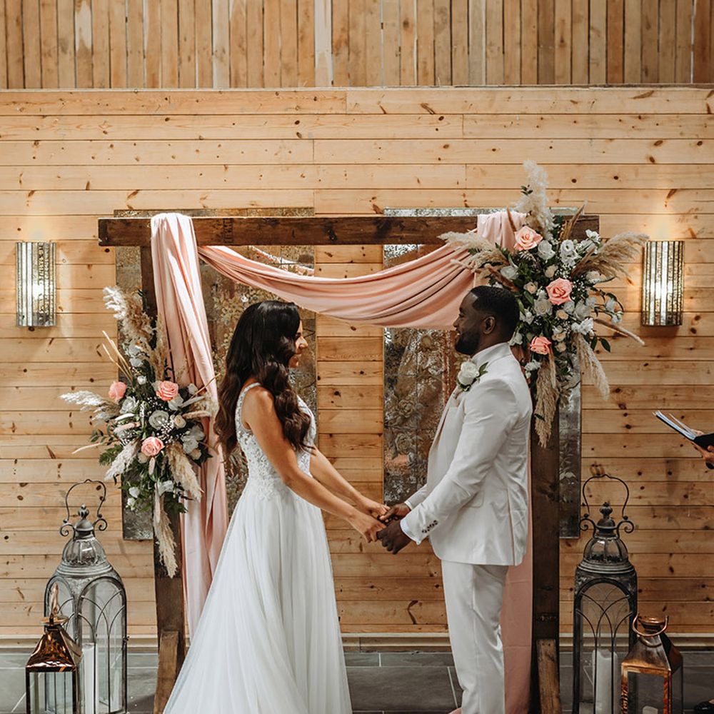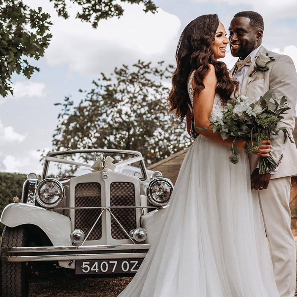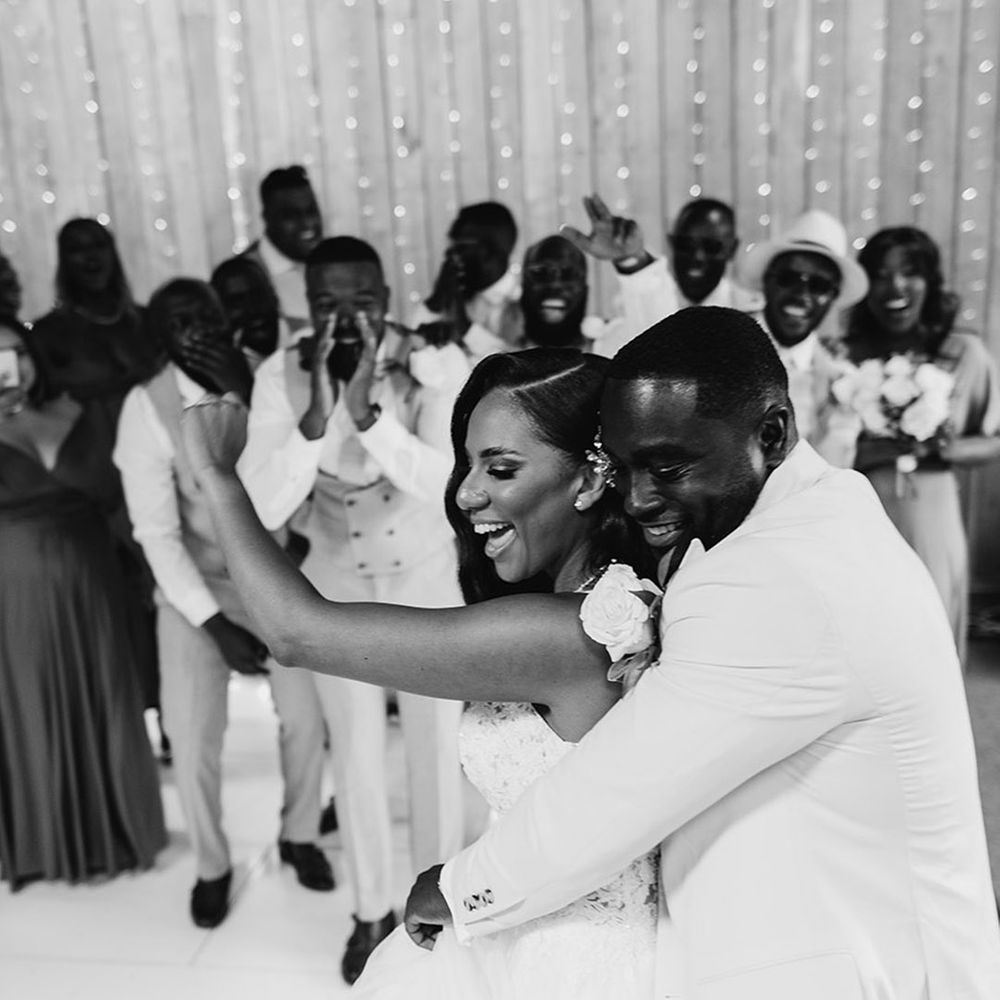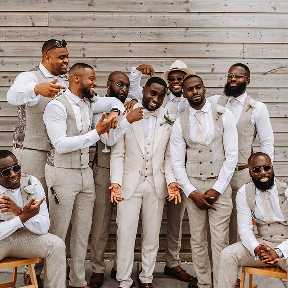 Eve & Michael describe their wedding day at Chafford Park as “Bohemian vibes, with a Caribbean and African twist.” The couple kept things traditional with white rose bouquets and flower arrangements but added pampas grass for that boho touch. To elevate their rustic wedding venue, the groom and groomsmen wore suave ivory suits and they decorated the venue in fairy lights and large ‘LOVE’ letter lights. Eve & Michael’s favourite moment of the day was the champagne spray during golden hour with their groomsmen and bridesmaids, and we don’t blame them! What a photo that is! Champagne pops and sprays are one of our fave wedding photo ideas.