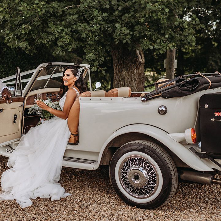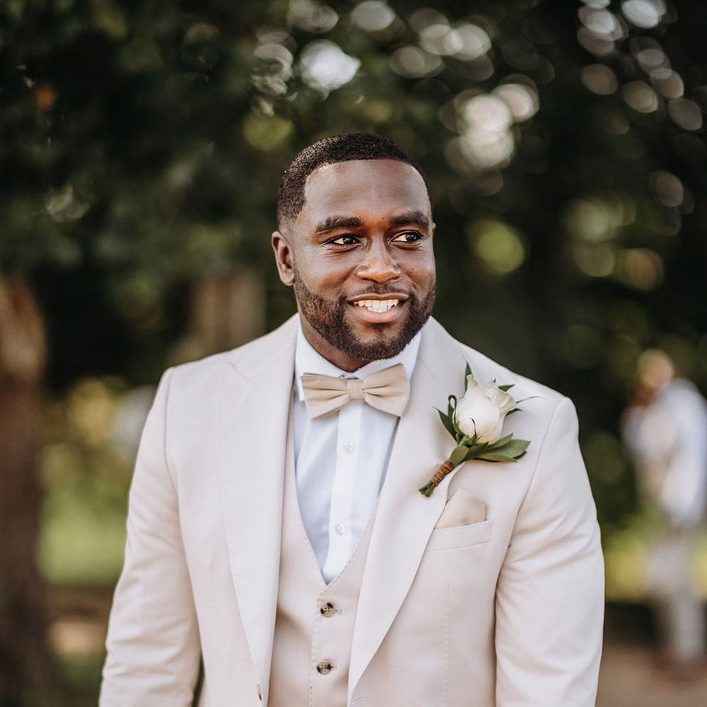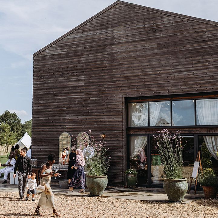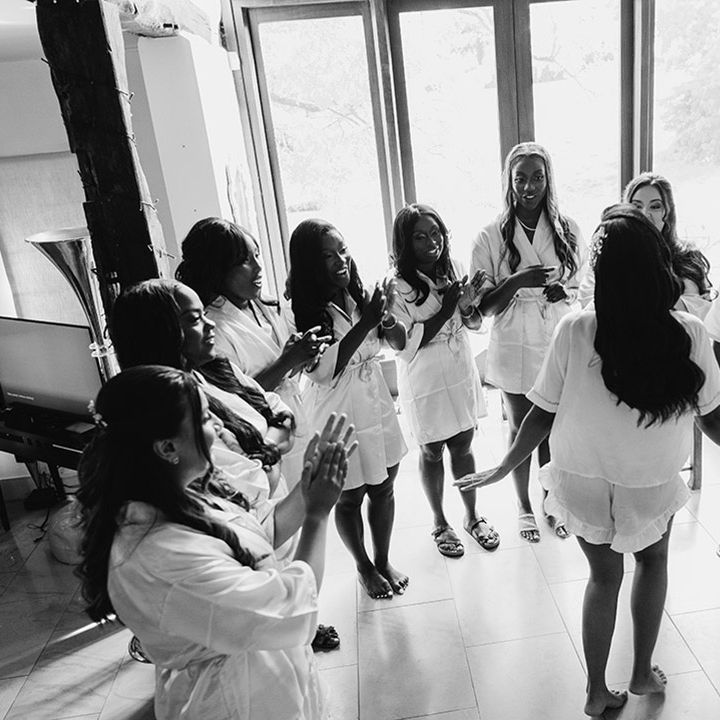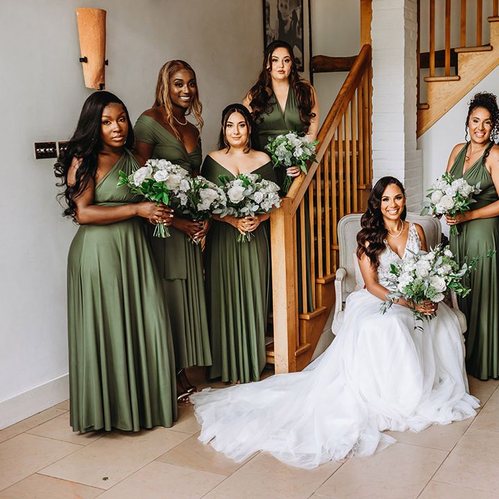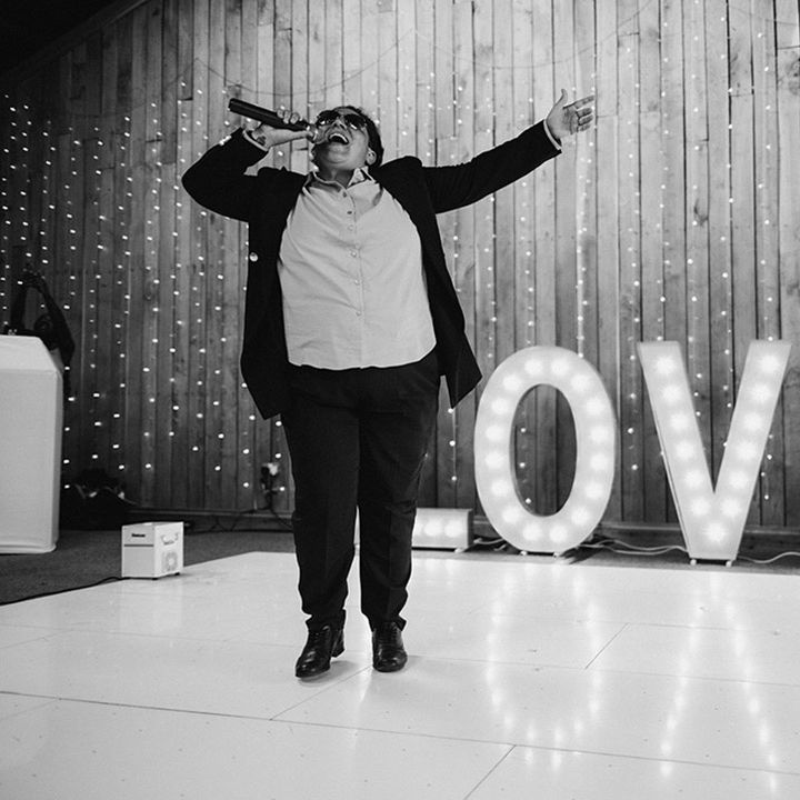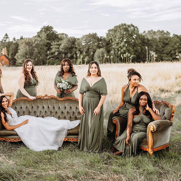 Eve & Michael describe their wedding day at Chafford Park as “Bohemian vibes, with a Caribbean and African twist.” The couple kept things traditional with white rose bouquets and flower arrangements but added pampas grass for that boho touch. To elevate their rustic wedding venue, the groom and groomsmen wore suave ivory suits and they decorated the venue in fairy lights and large ‘LOVE’ letter lights. Eve & Michael’s favourite moment of the day was the champagne spray during golden hour with their groomsmen and bridesmaids, and we don’t blame them! What a photo that is! Champagne pops and sprays are one of our fave wedding photo ideas.
