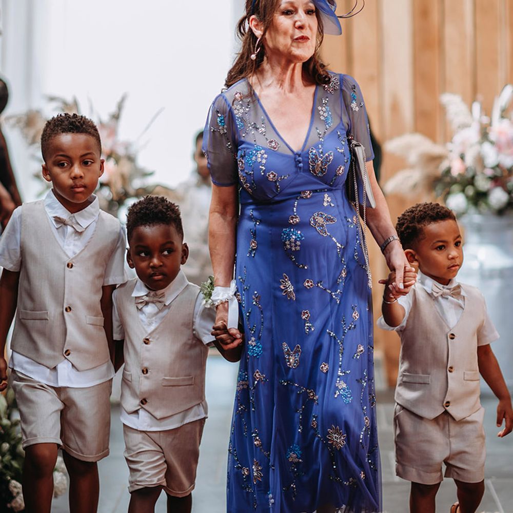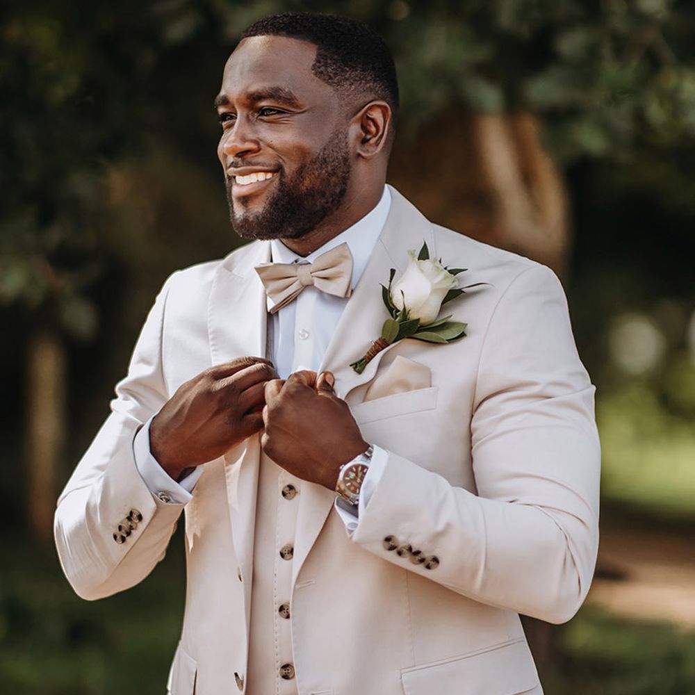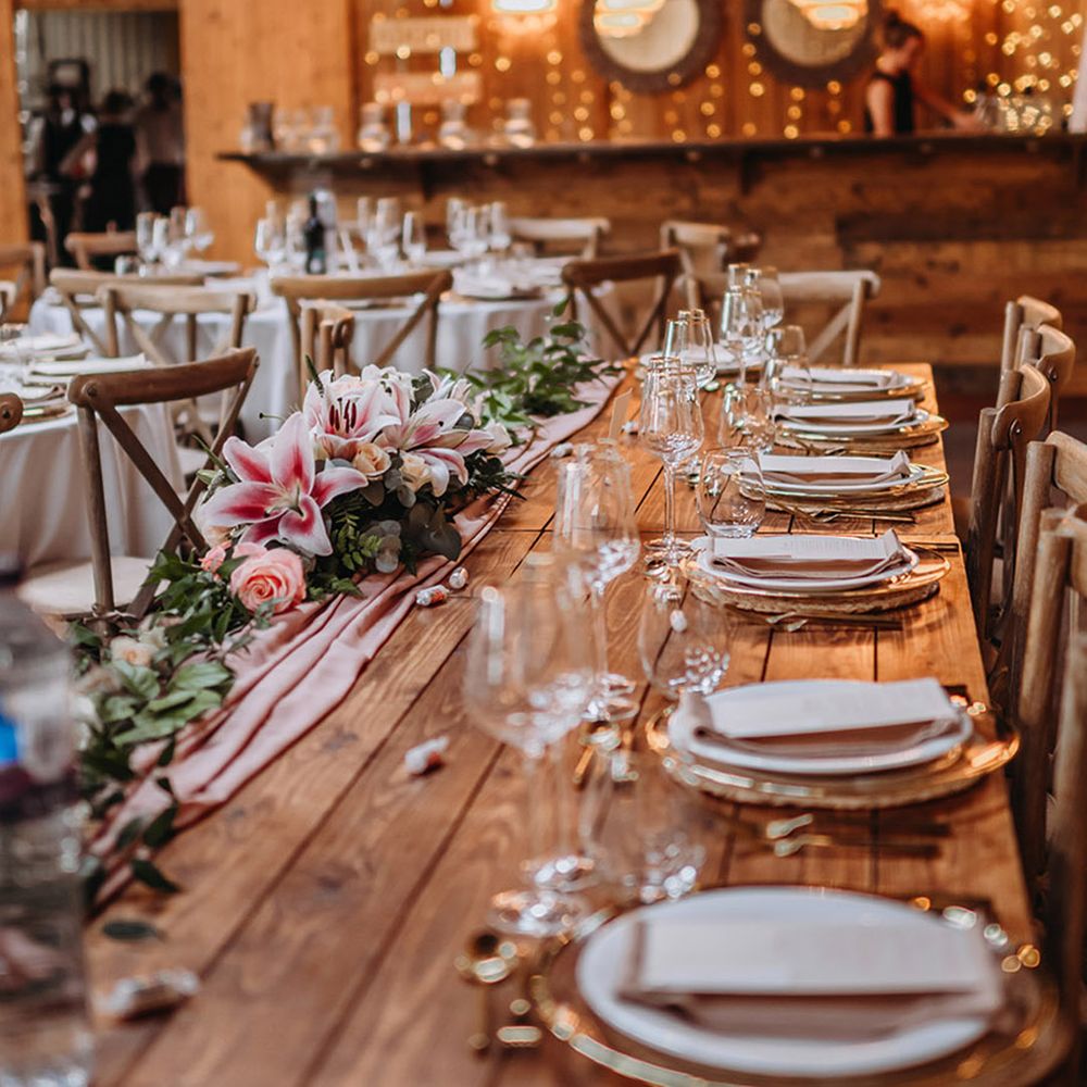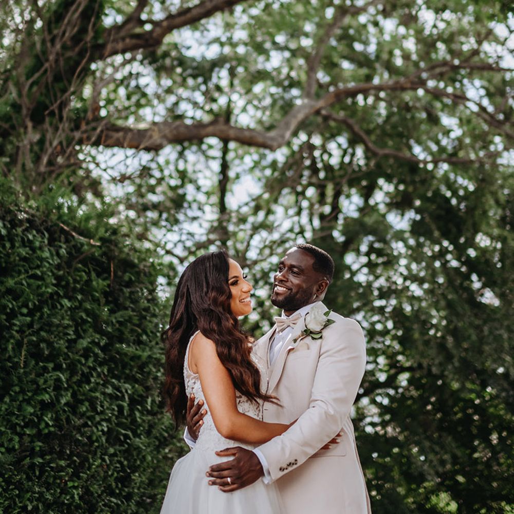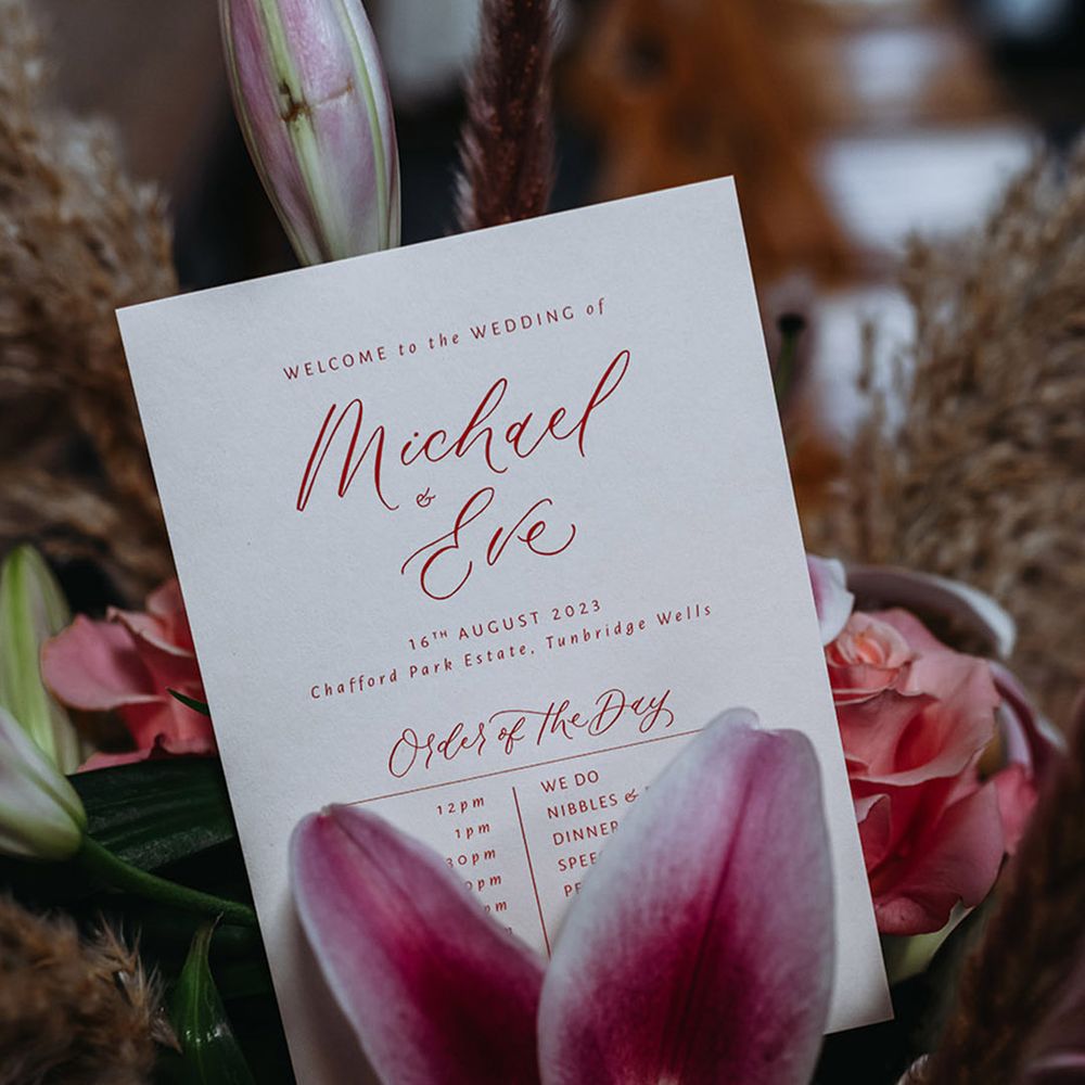Eve & Michael describe their wedding day at Chafford Park as “Bohemian vibes, with a Caribbean and African twist.” The couple kept things traditional with white rose bouquets and flower arrangements but added pampas grass for that boho touch. To elevate their rustic wedding venue, the groom and groomsmen wore suave ivory suits and they decorated the venue in fairy lights and large ‘LOVE’ letter lights. Eve & Michael’s favourite moment of the day was the champagne spray during golden hour with their groomsmen and bridesmaids, and we don’t blame them! What a photo that is! Champagne pops and sprays are one of our fave wedding photo ideas.