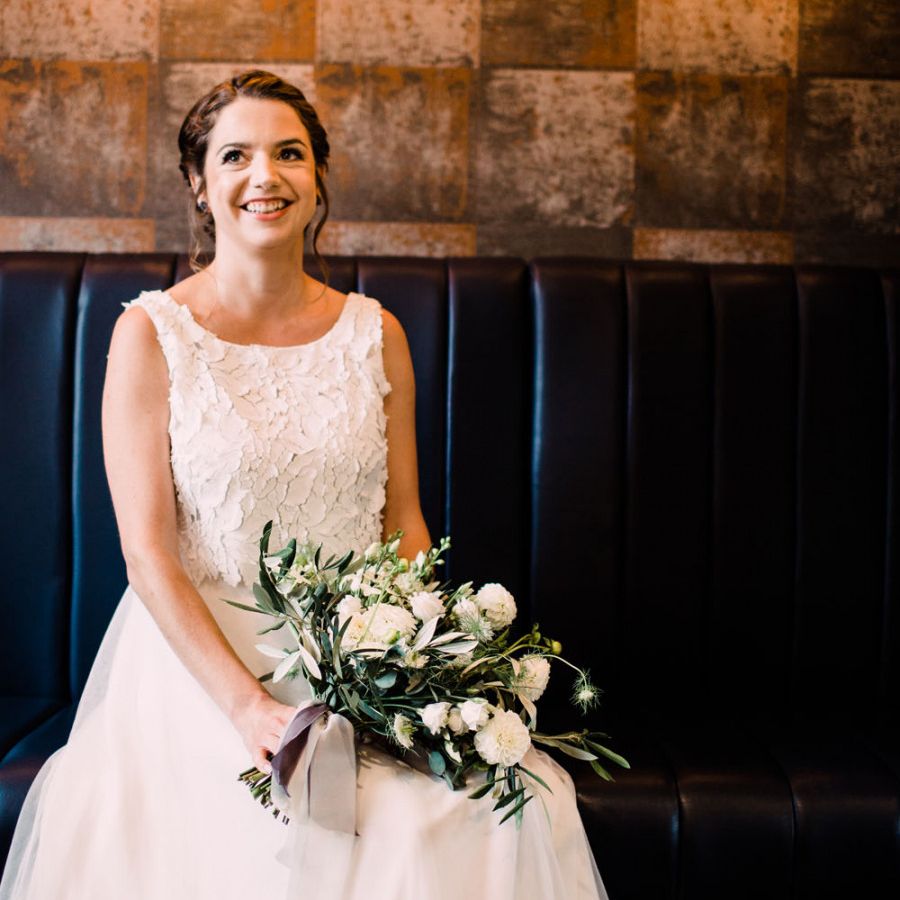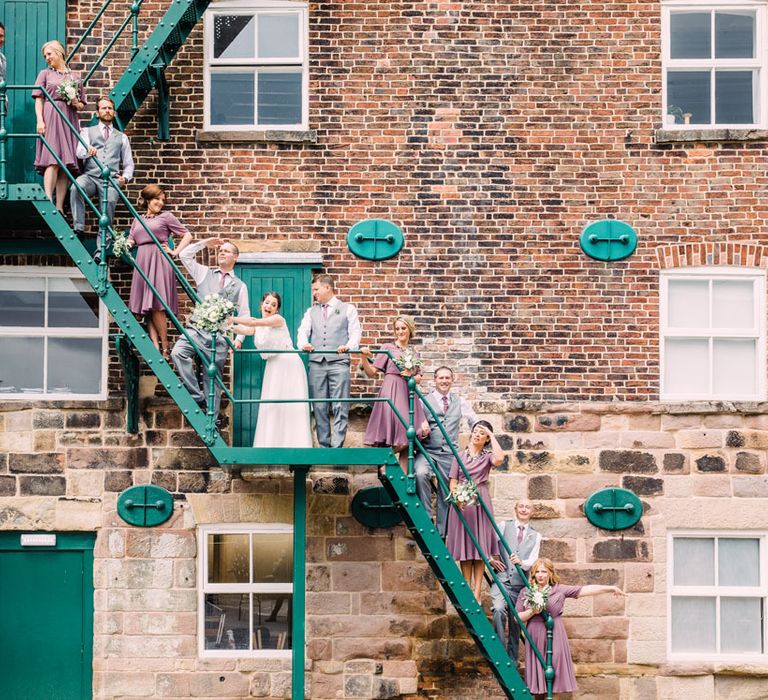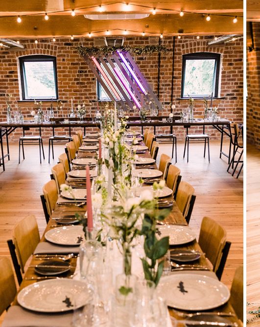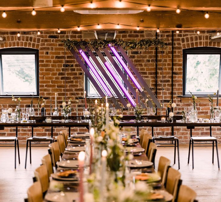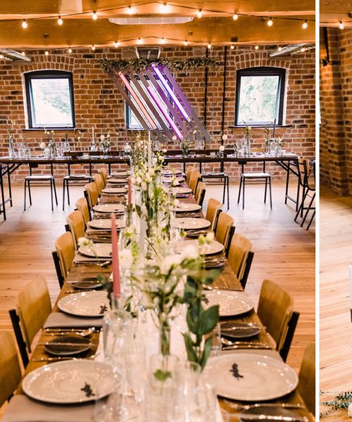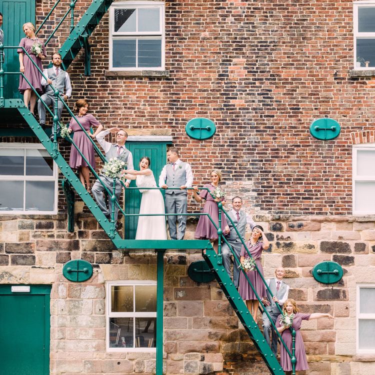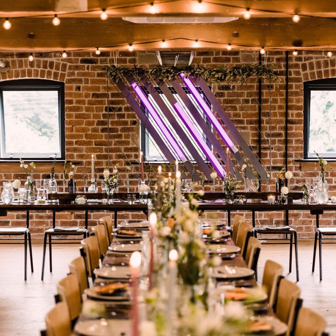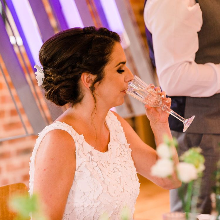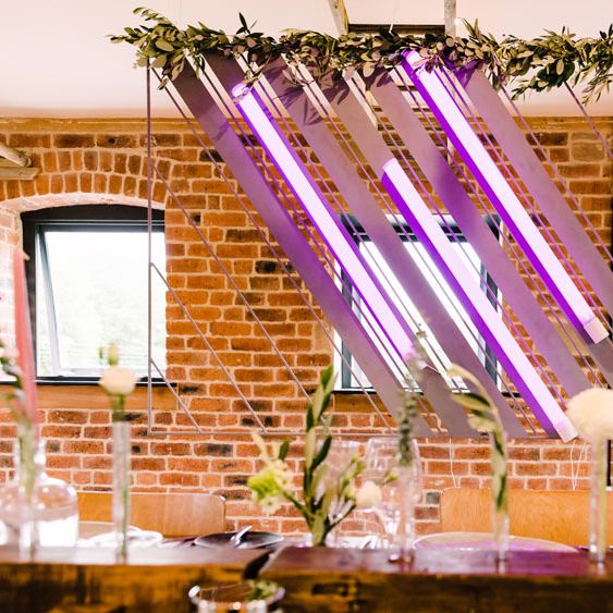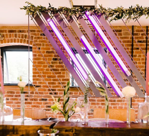Relaxed, chilled, a nice slow pace to everything. we had no real formal photo's and chose to have natural casual photography as I'm not keen on looking at the camera. Also being a greedy big family we put a lot of thought into the food or should I say food for in between the official meal. We offered Ice lollies, marshmallow bar and a huge Cake of cheese. There was not a scrap of cheese left. The style was modern, minimalist with a splash of purples to contrast from the industrial venue of steel and brick which was the base of the inspiration. The Venue has recently had their Ladder installation completed and we made full use of the great way to showcase them with baubles and lights which again is something I loved looking at on