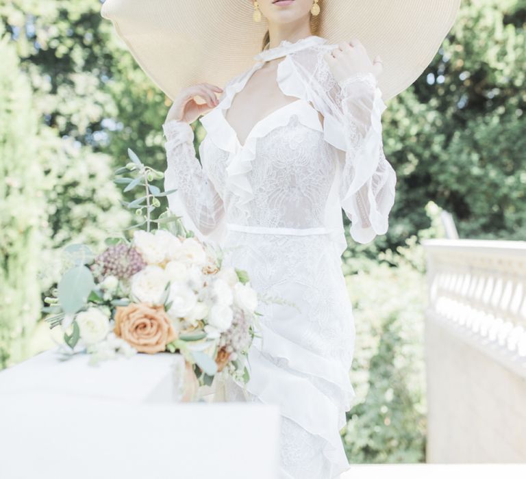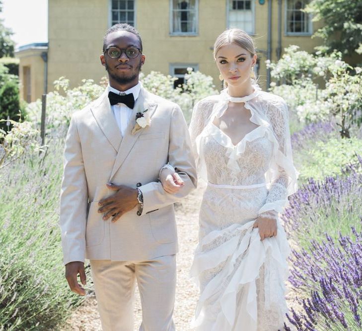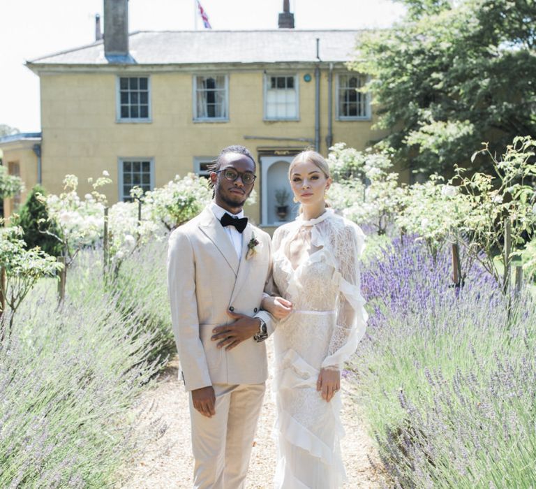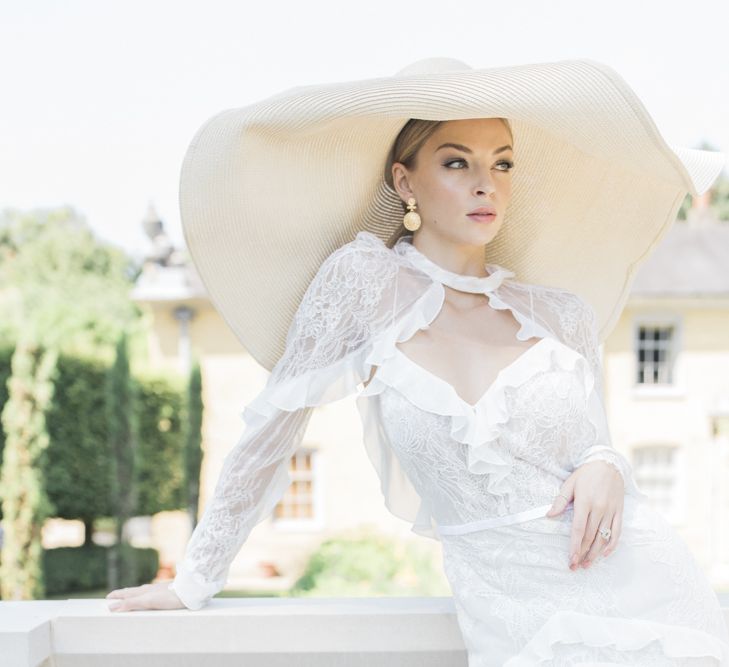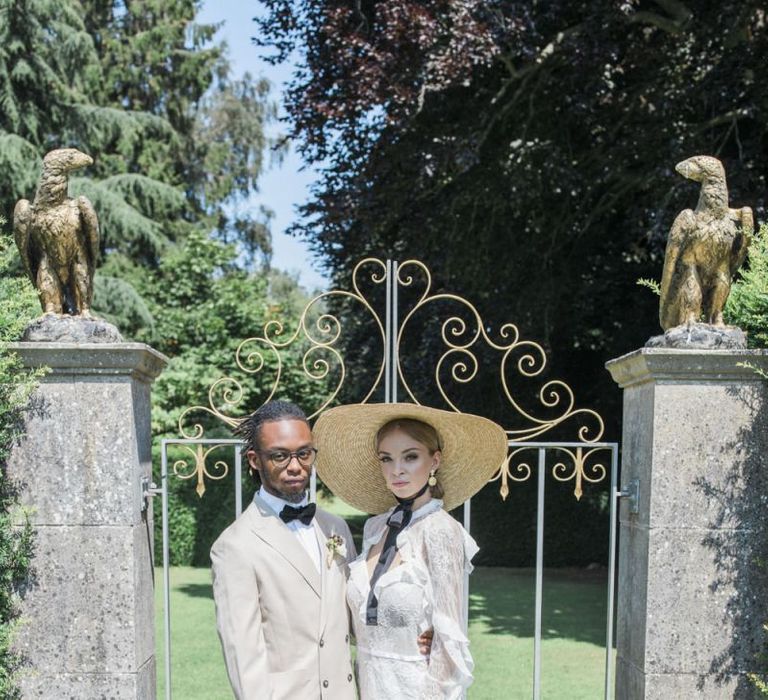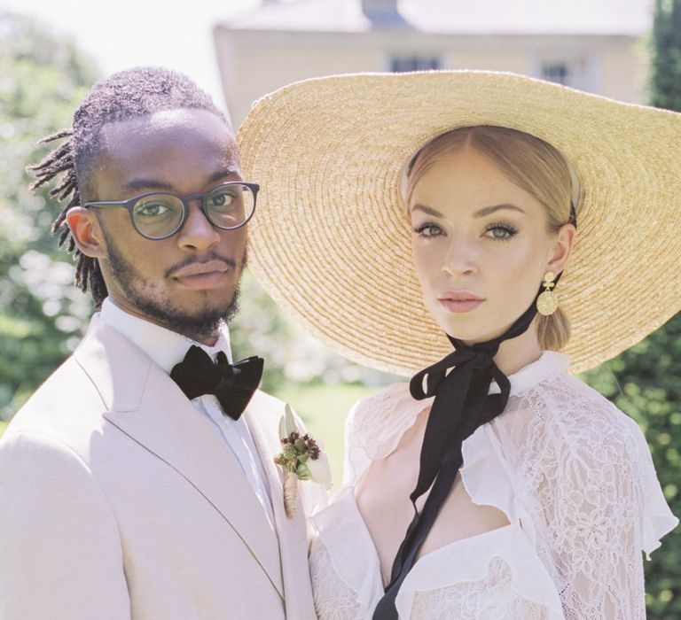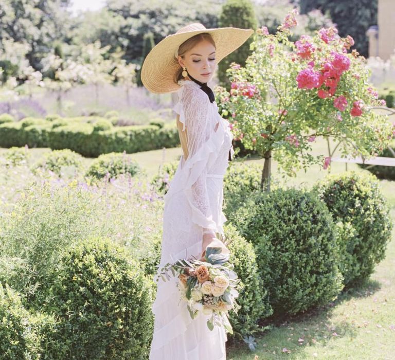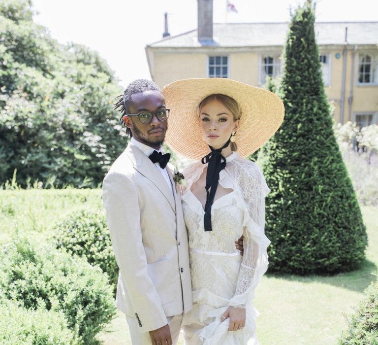 A long winding driveway leads to an impressive Georgian house painted in subtle yellow, and with eight acres of lush green ornamental gardens (which Victoria Beckham used for a Vogue photoshoot), the colour palette for the shoot was kept very neutral. Pared-back makeup and classic hair, the style of the full lace – open-backed - wedding gown and statement earrings took centre stage. A splash of vibrant colour was added by a bridal bouquet made up of roses, berries and foliage; a Pamela hat bringing the bride’s entire look together whilst the groom wore a simple linen suit finished off with a black bow tie to complement the black ribbon on the bride’s hat.