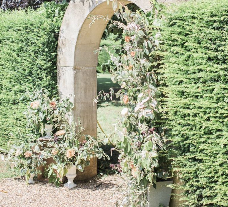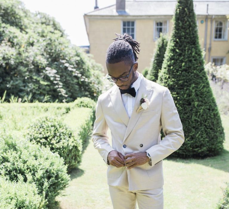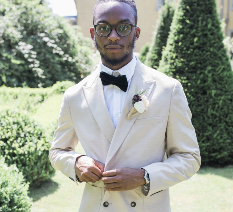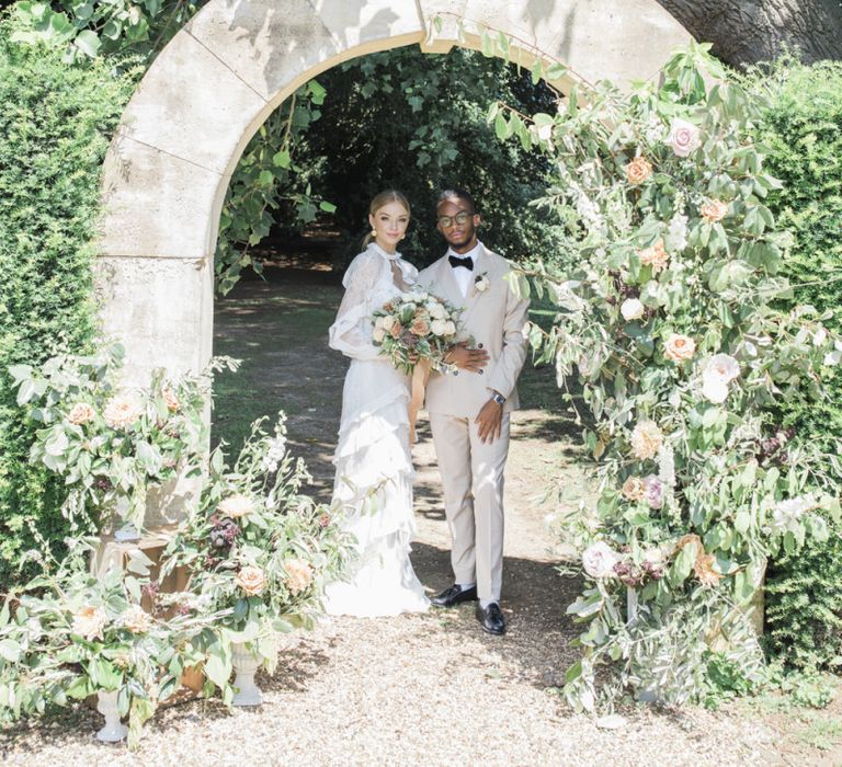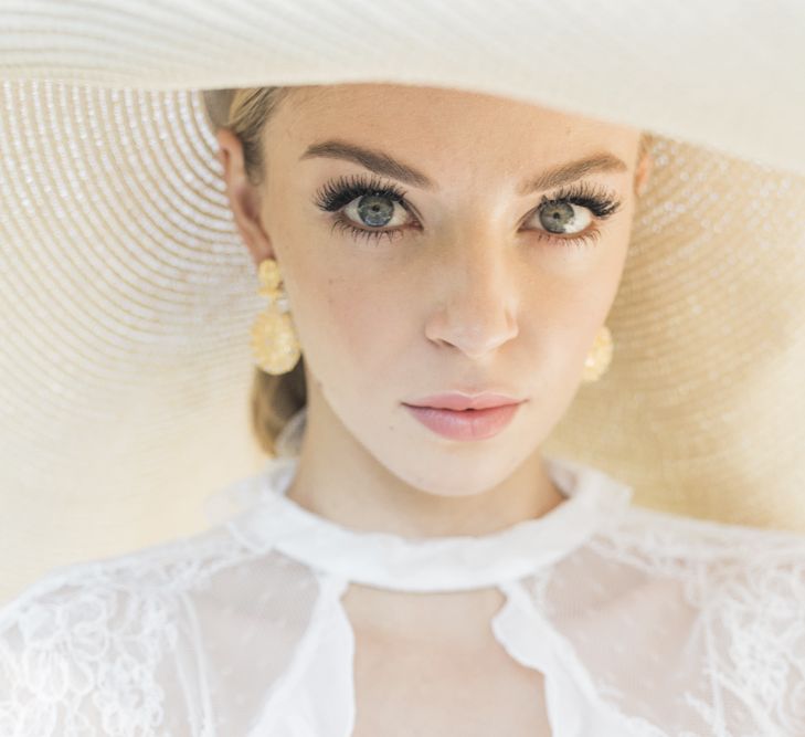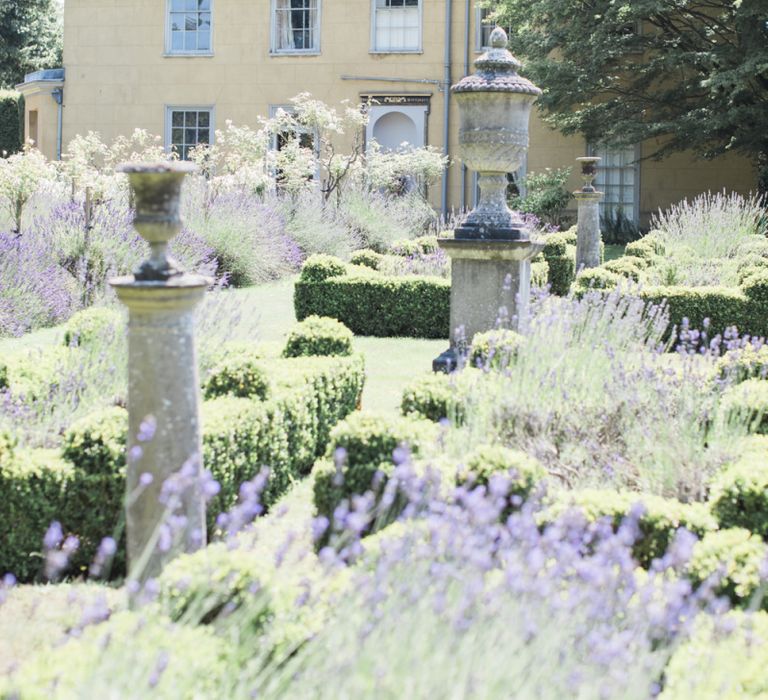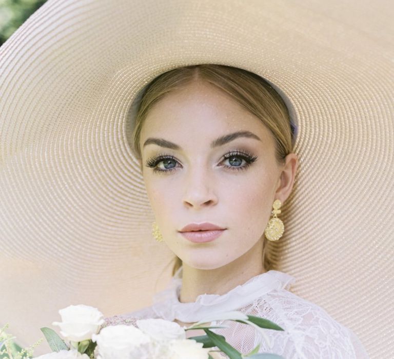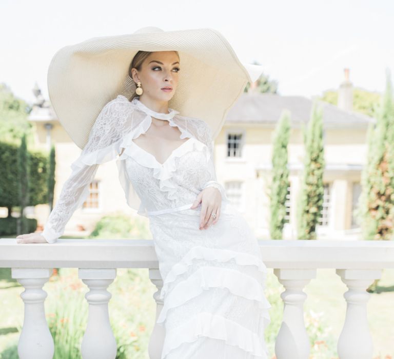 A long winding driveway leads to an impressive Georgian house painted in subtle yellow, and with eight acres of lush green ornamental gardens (which Victoria Beckham used for a Vogue photoshoot), the colour palette for the shoot was kept very neutral. Pared-back makeup and classic hair, the style of the full lace – open-backed - wedding gown and statement earrings took centre stage. A splash of vibrant colour was added by a bridal bouquet made up of roses, berries and foliage; a Pamela hat bringing the bride’s entire look together whilst the groom wore a simple linen suit finished off with a black bow tie to complement the black ribbon on the bride’s hat.