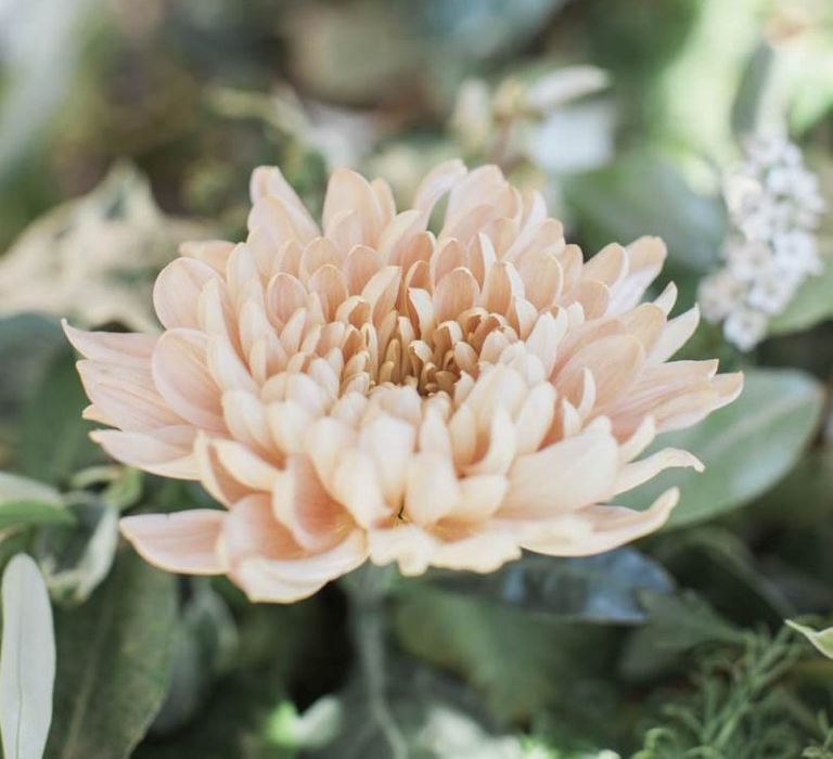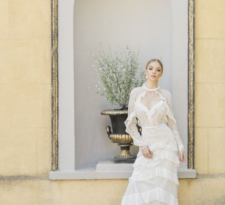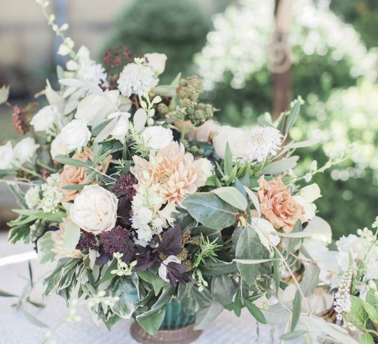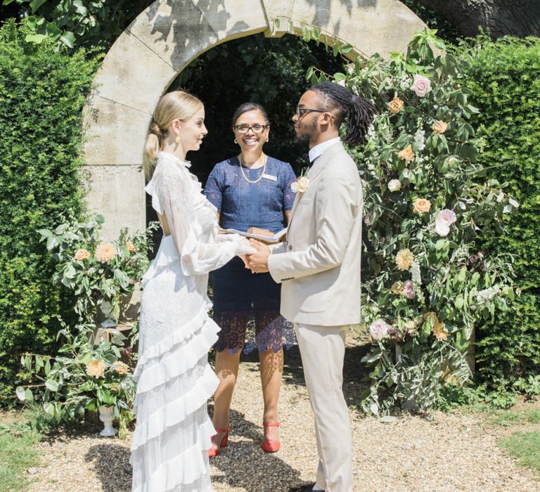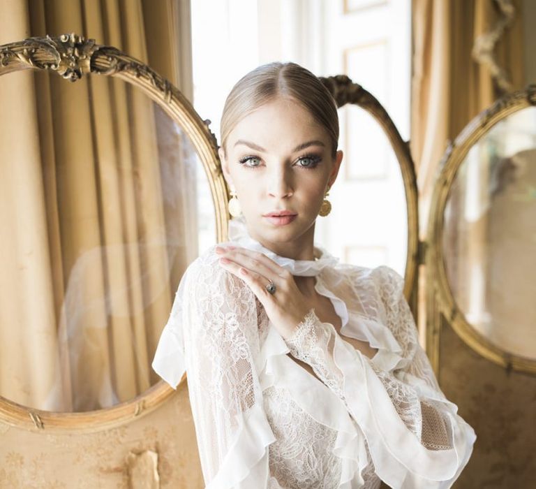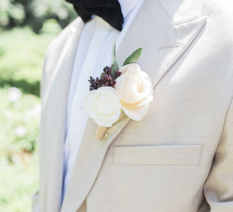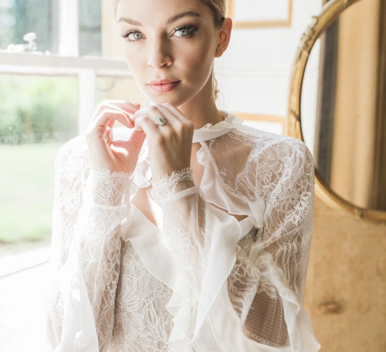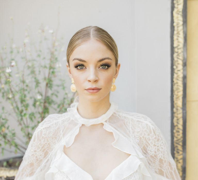 A long winding driveway leads to an impressive Georgian house painted in subtle yellow, and with eight acres of lush green ornamental gardens (which Victoria Beckham used for a Vogue photoshoot), the colour palette for the shoot was kept very neutral. Pared-back makeup and classic hair, the style of the full lace – open-backed - wedding gown and statement earrings took centre stage. A splash of vibrant colour was added by a bridal bouquet made up of roses, berries and foliage; a Pamela hat bringing the bride’s entire look together whilst the groom wore a simple linen suit finished off with a black bow tie to complement the black ribbon on the bride’s hat.